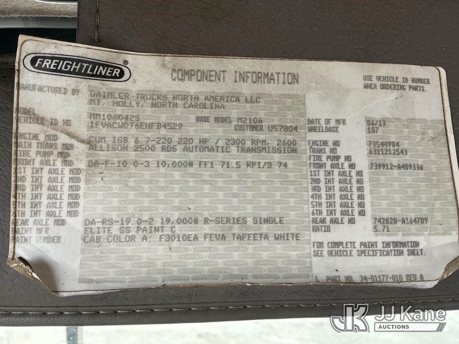 Hi-Ranger XT-55, 60 ft, Over-Center Bucket Truck s/n 2141053246, with Single-Man Bucket, mounted behind cab on 2014 Freightliner M2 106 Chipper Dump Truck, Cummins 6.7L 4X2, diesel, Auto, A/C, True Mileage Unknown No manual (Runs, Moves & Upper Operates) (PTO Grinding Noise, Does Not Fully Engage, Upper Condition Unknown, Check Engine Lights On Dash, Odometer Discrepancy, Seller States: Exhaust Leak) (Reads 16,934 hours) This is a Titled Item NOTE: This unit is being sold AS IS/WHERE IS via Timed Auction and is located in Shrewsbury, MA. Inspection & preview days for this unit are the 2 business days prior to the first day of items closing for this auction, item is located at 11 Fortune Blvd Shrewsbury, MA 01545 and hours of operations are 8a-4p. For pre-sale questions, please contact Rob Gifford @ (508) 864-4126. (Missing manuals, See Auction Company for Manufacturers Information to obtain manuals) (Buyer is responsible for removal. Assistance by consignor or JJ Kane Auctions is not assured.)