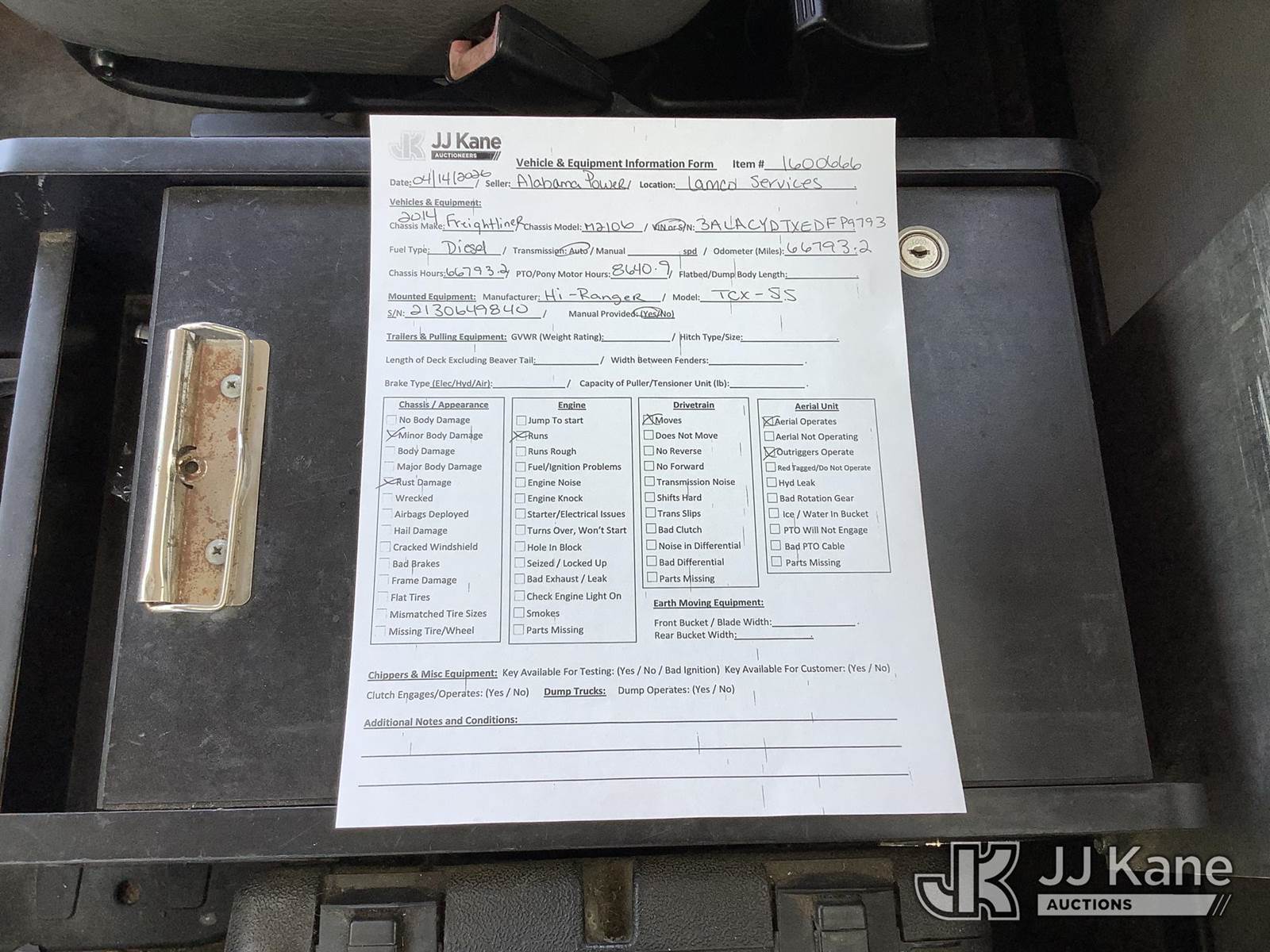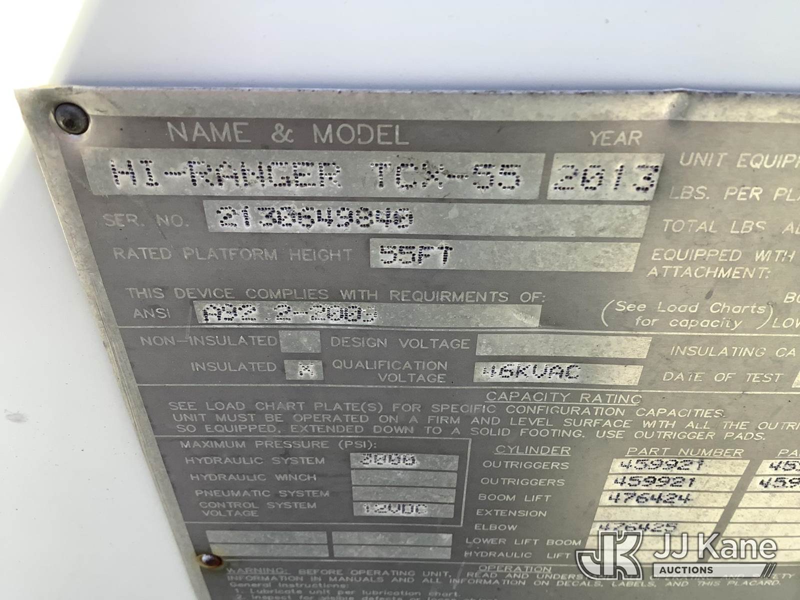 HiRanger TCX-55, 60 ft, Material Handling Bucket Truck s/n 2130649840, with two-man bucket & 4 hyd outriggers, rear mounted on 2014 Freightliner M2 106 Utility Truck, 6.7L L6 Diesel, 4X2, Auto, A/C, with front winch, (66,793 miles) (AL Power Unit) (Runs & Moves, Upper Operates) This is a Titled Item NOTE: This unit is being sold AS IS/WHERE IS via Timed Auction and is located in Graysville, AL. Inspection & preview days for this unit are by appointment only; please contact us at contact@jjkane.com or 84-Go-JJKane for more details. Alabama Auctioneer Michael Whitebread - License # 5592 (Missing manuals, See Auction Company for Manufacturers Information to obtain manuals) (Buyer is responsible for removal. Assistance by consignor or JJ Kane Auctions is not assured.)