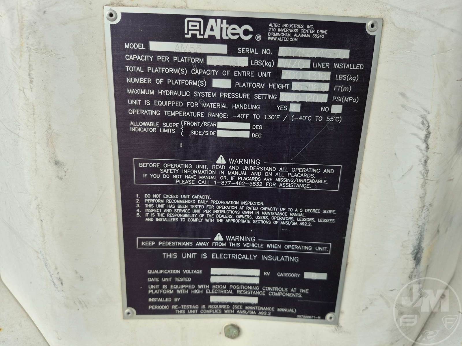 ALTEC AM55 BUCKET TRUCK, Â REAR MOUNT BOOM, BOOM SN 0114DM4930, MAXXFORCE, A285, TANDEM AXLE, ALLISON, AUTOMATIC, SPRING SUSPENSION, 200IN. " WB, WORK HEIGHT 55', UTILITY BODY, TWO MAN BUCKET, BOOM CAPACITY 700, 4 HYDRAULIC OUTRIGGERS, 58000 GVWR, HOUR METER READS: 17475, ODOMETER READS: 152310