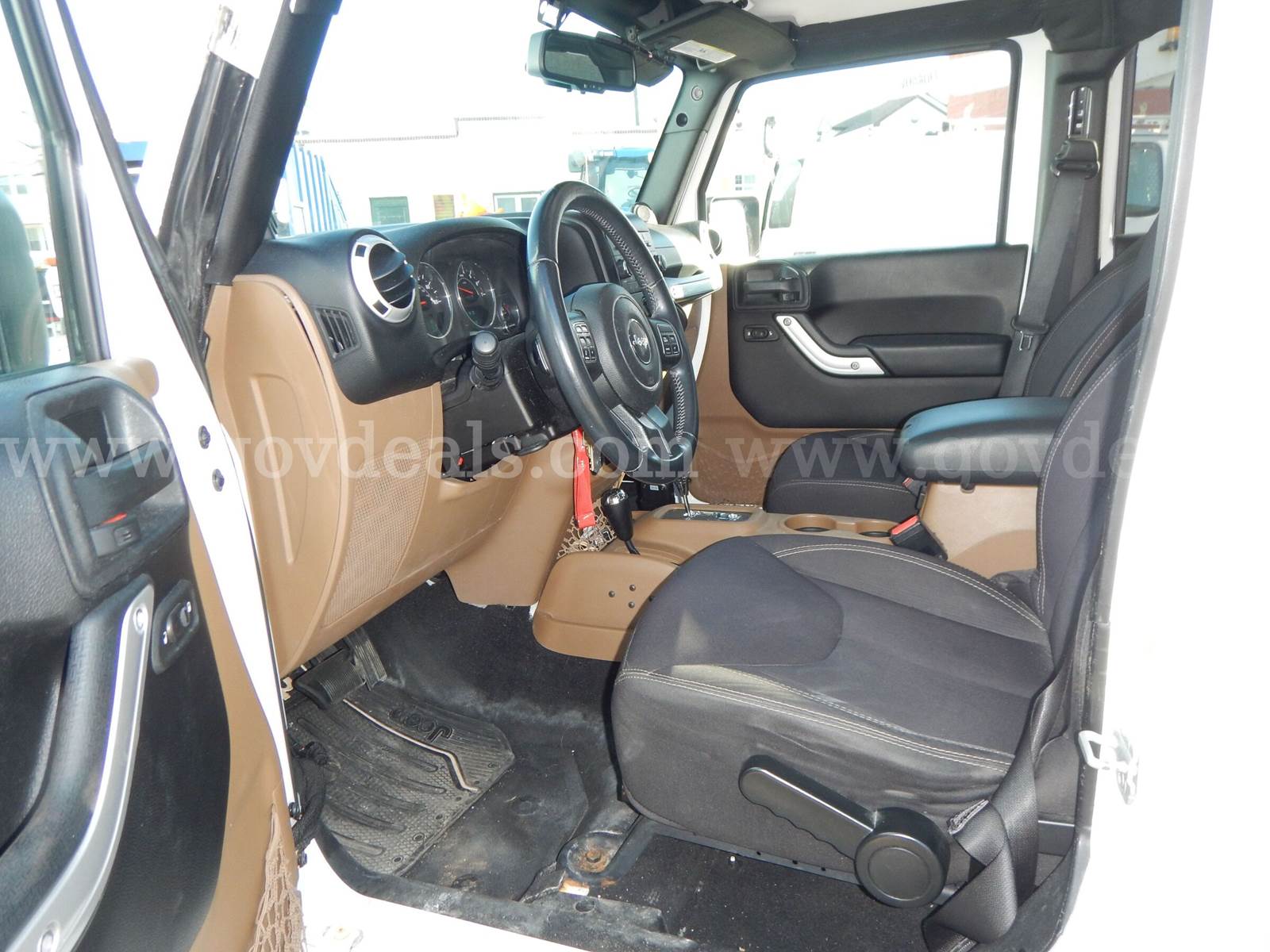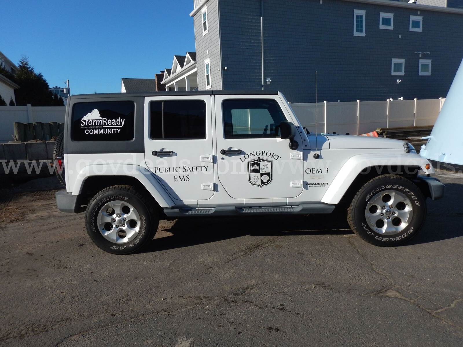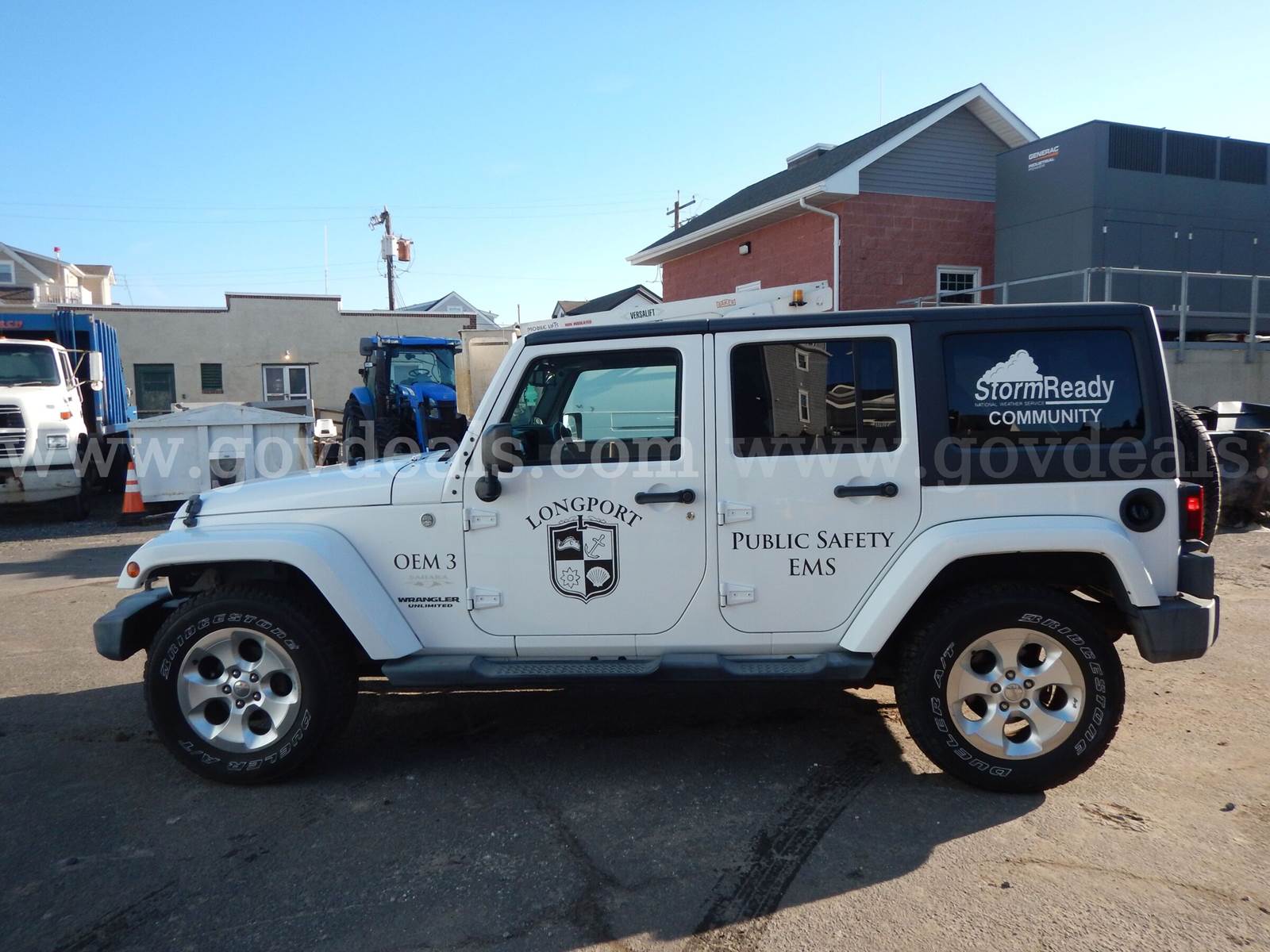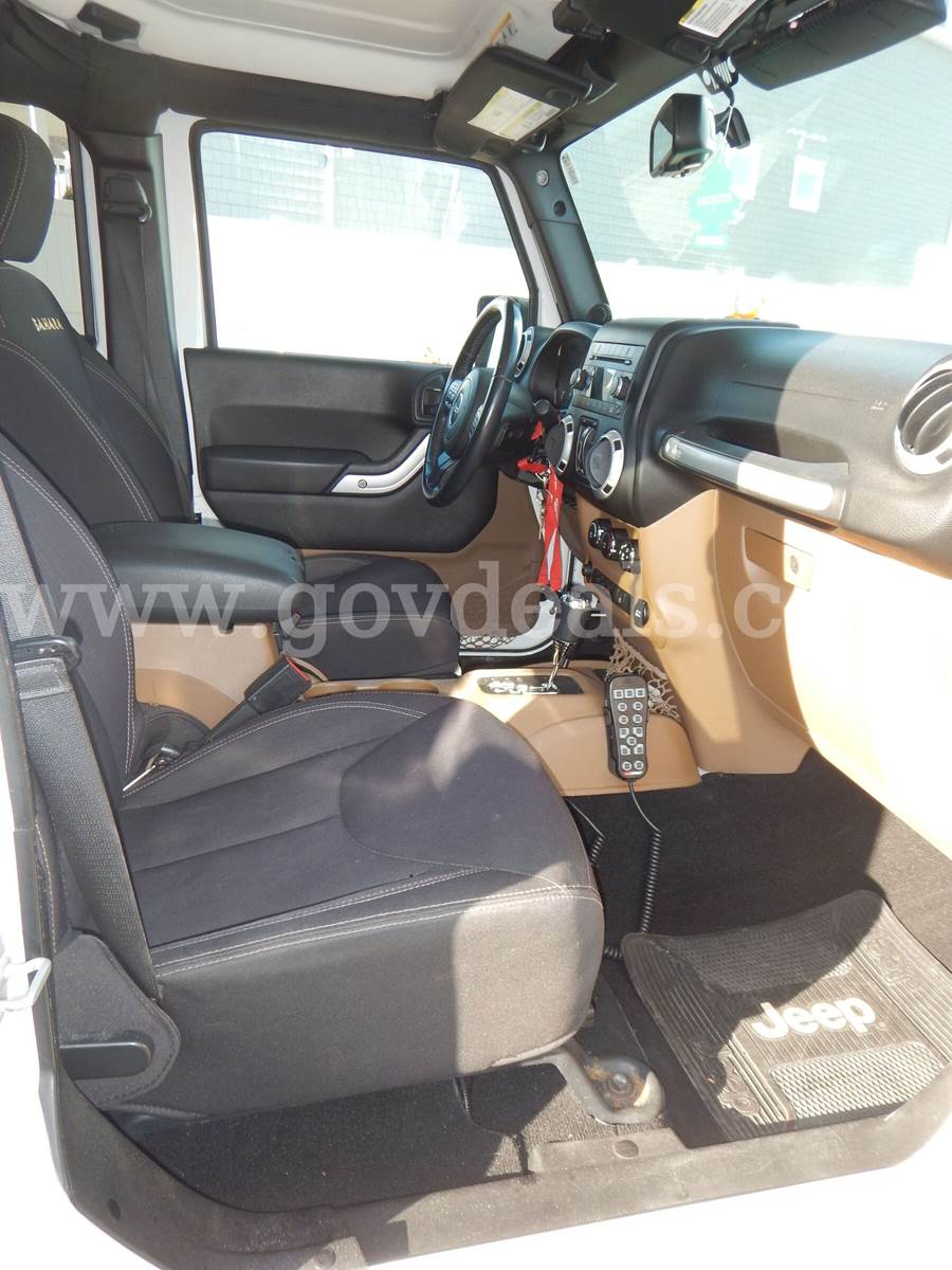 2014 Jeep Wrangler Sahara Unlimited, 3.6L V6, 4-door, white. This municipal vehicle is in good condition and fully operational. Both the interior and exterior are in excellent condition and appearance. The undercarriage shows a reasonable degree of rust accumulated over time, consistent with its operation and exposure on a barrier island. The vehicle is equipped with all standard features associated with a Sahara Unlimited trim package to include; power windows, locks, and a removable hardtop roof. It has been regularly maintained and serviced. Recently, the entire front brake assembly was replaced, including pads, rotors, calipers, and supporting brake lines. Additionally, in the past two years, the gas tank gasket and fuel pump have also been replaced. Please note that the radio is currently not functioning properly, and the engine light is activated; however, the reason for this indicator light is unknown and cannot be reset. There are no engine issues indicated or experienced. Furthermore, the operating cable for the four-wheel drive lever is broken, and the vehicle is currently being used in two-wheel drive.