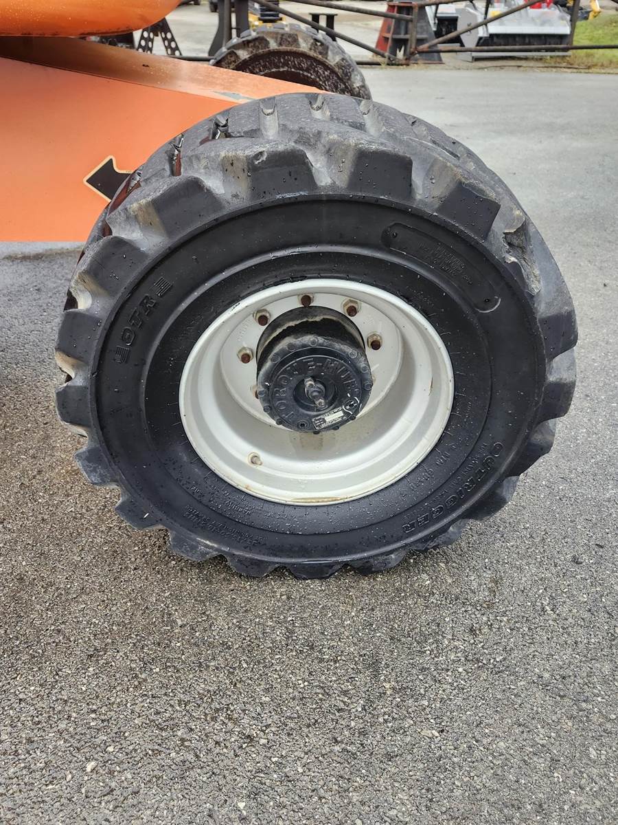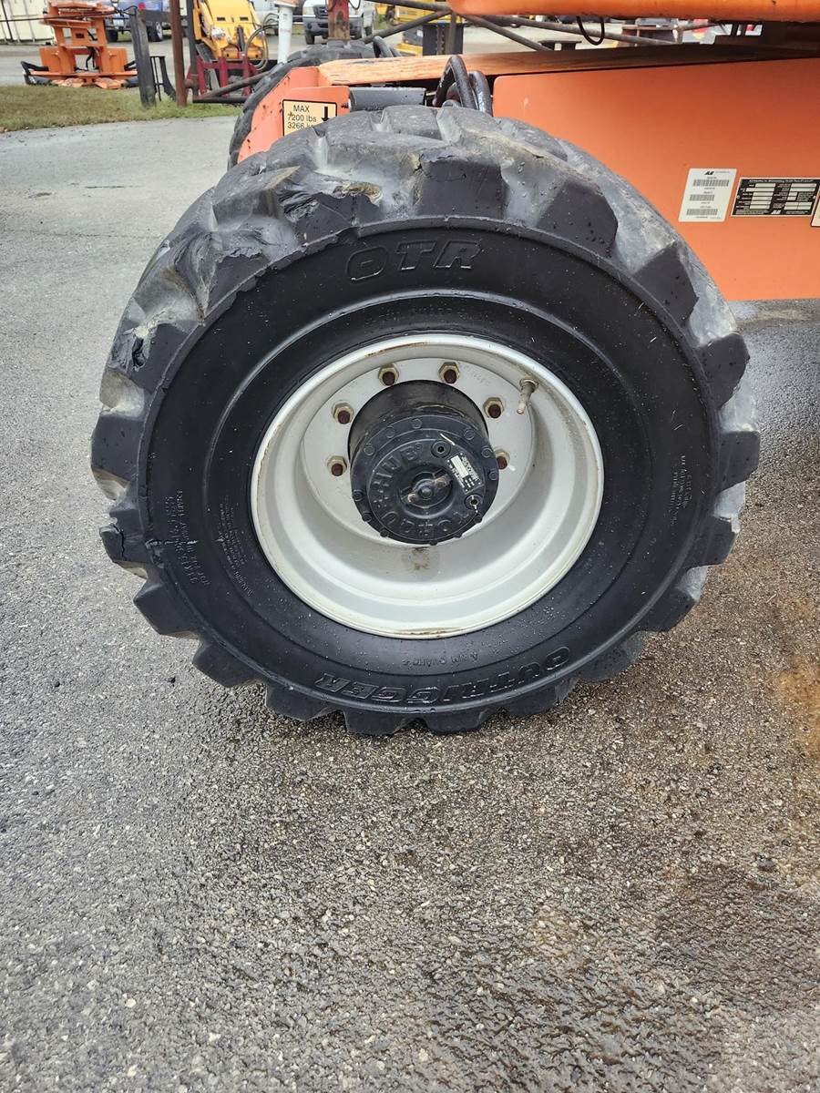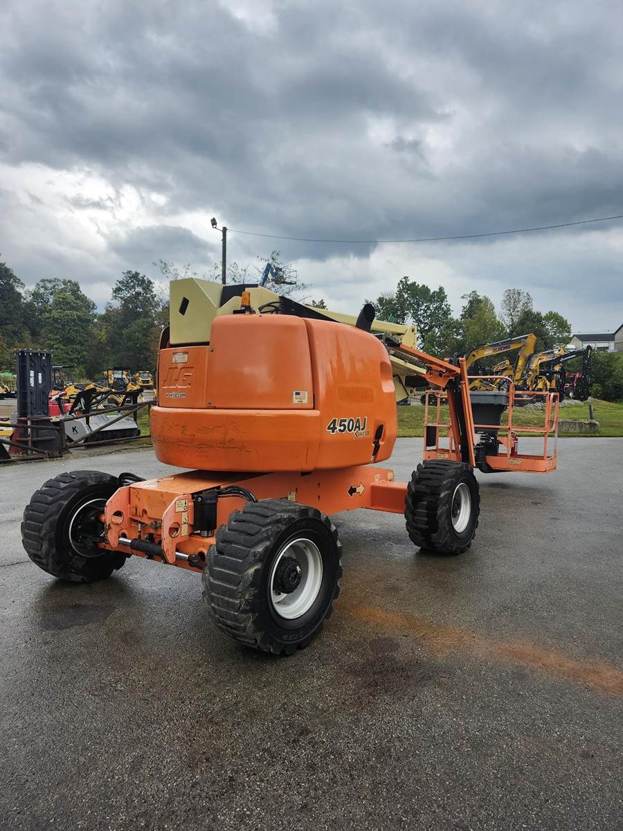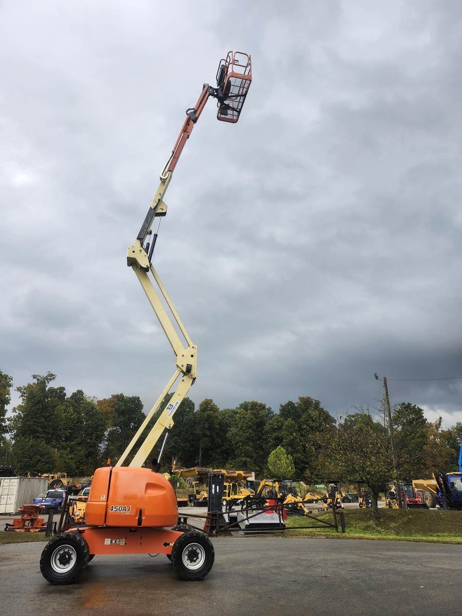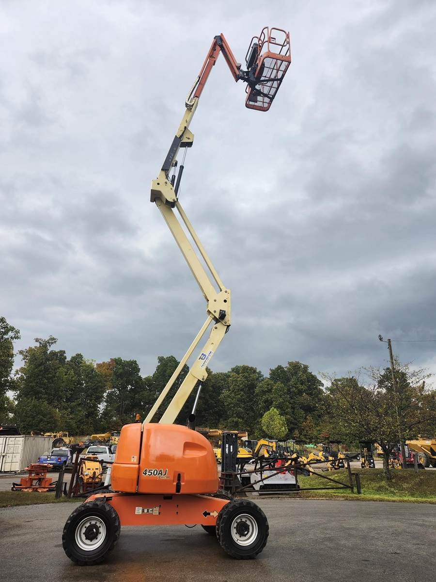 The 2014 JLG 450AJ is an articulating boom lift with a 45-foot platform height and a maximum platform capacity of 550 lbs. It has a 25-foot horizontal reach, a 355-degree non-continuous swing, and a 180-degree hydraulic platform rotator. The lift weighs 12,650 lbs and can handle a 45% grade, Jib, Power to Platform, 2013 US EPA Label, Deutz D 2.9 L4 4 Cylinder 49 hp 2.92 L Diesel Engine, 33x15.50-16.5 Tires