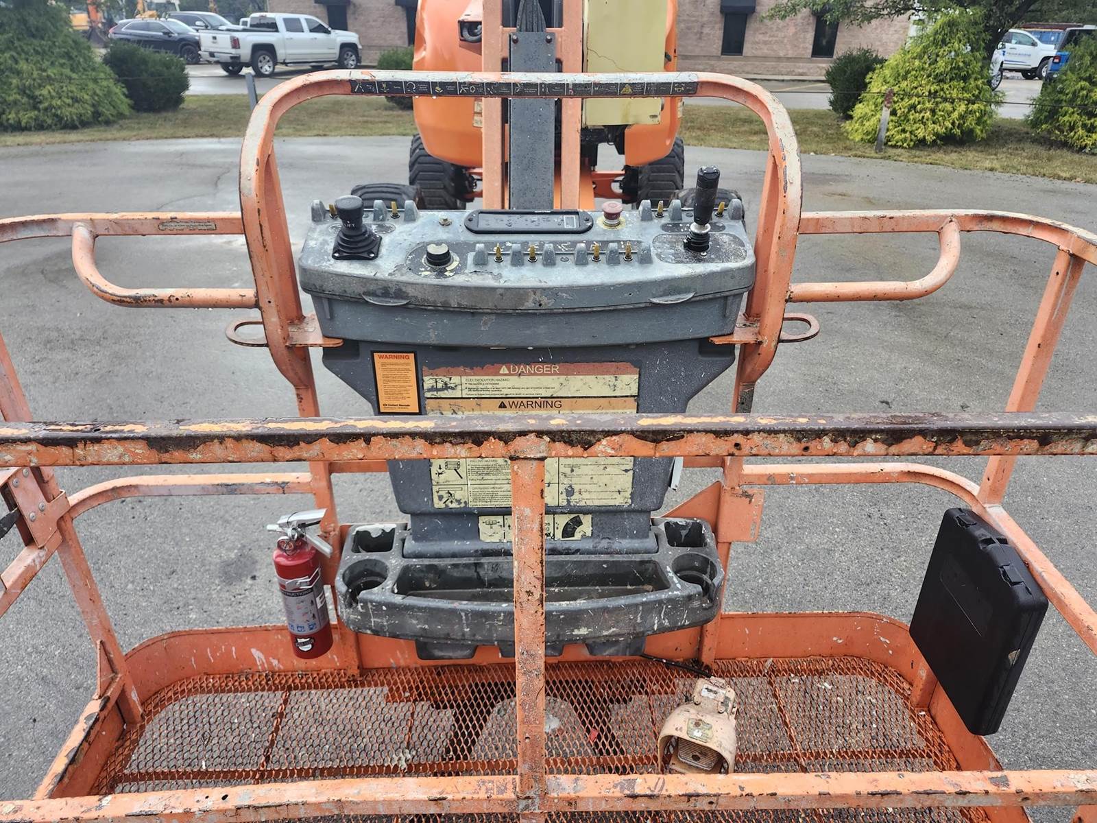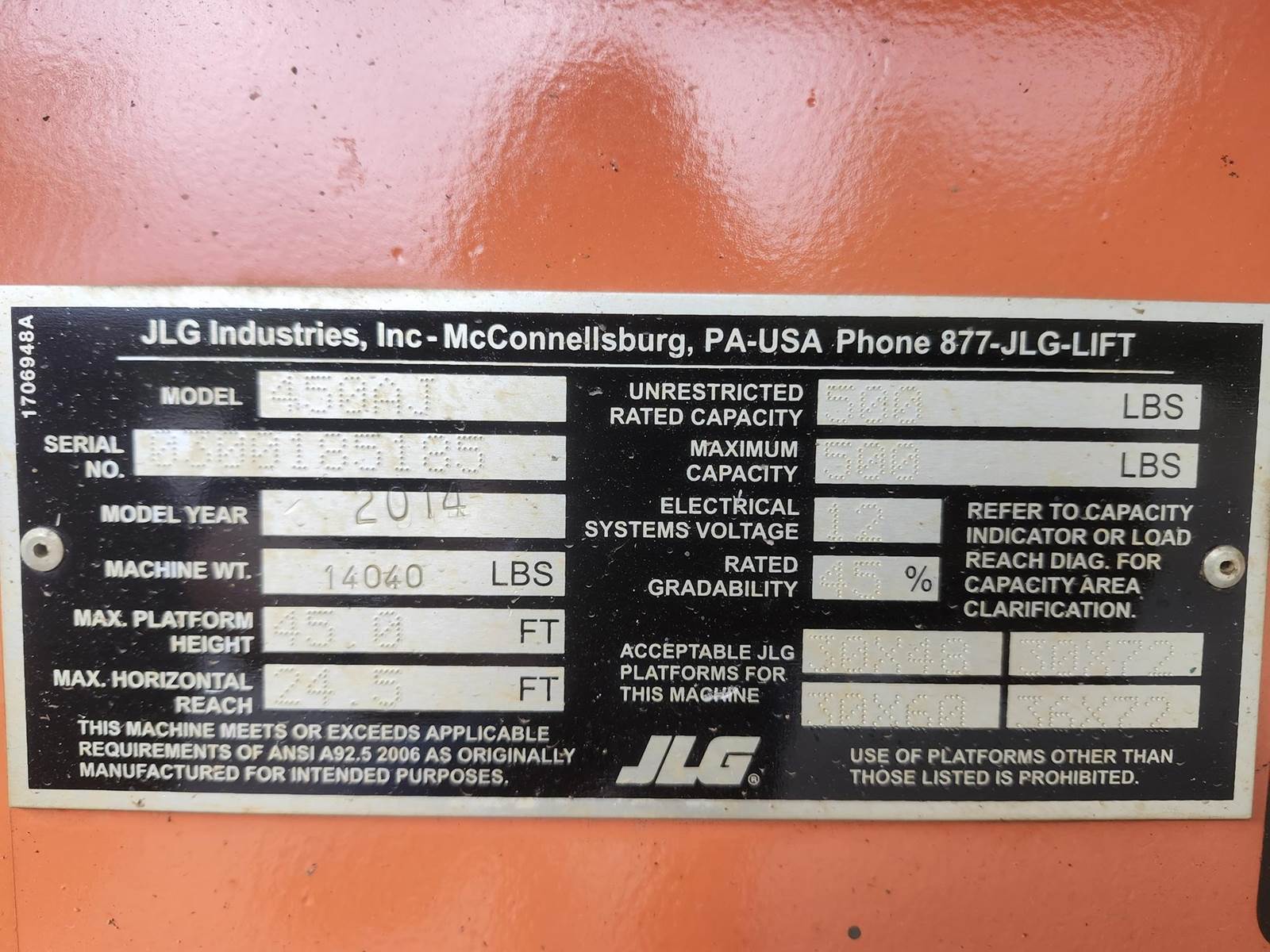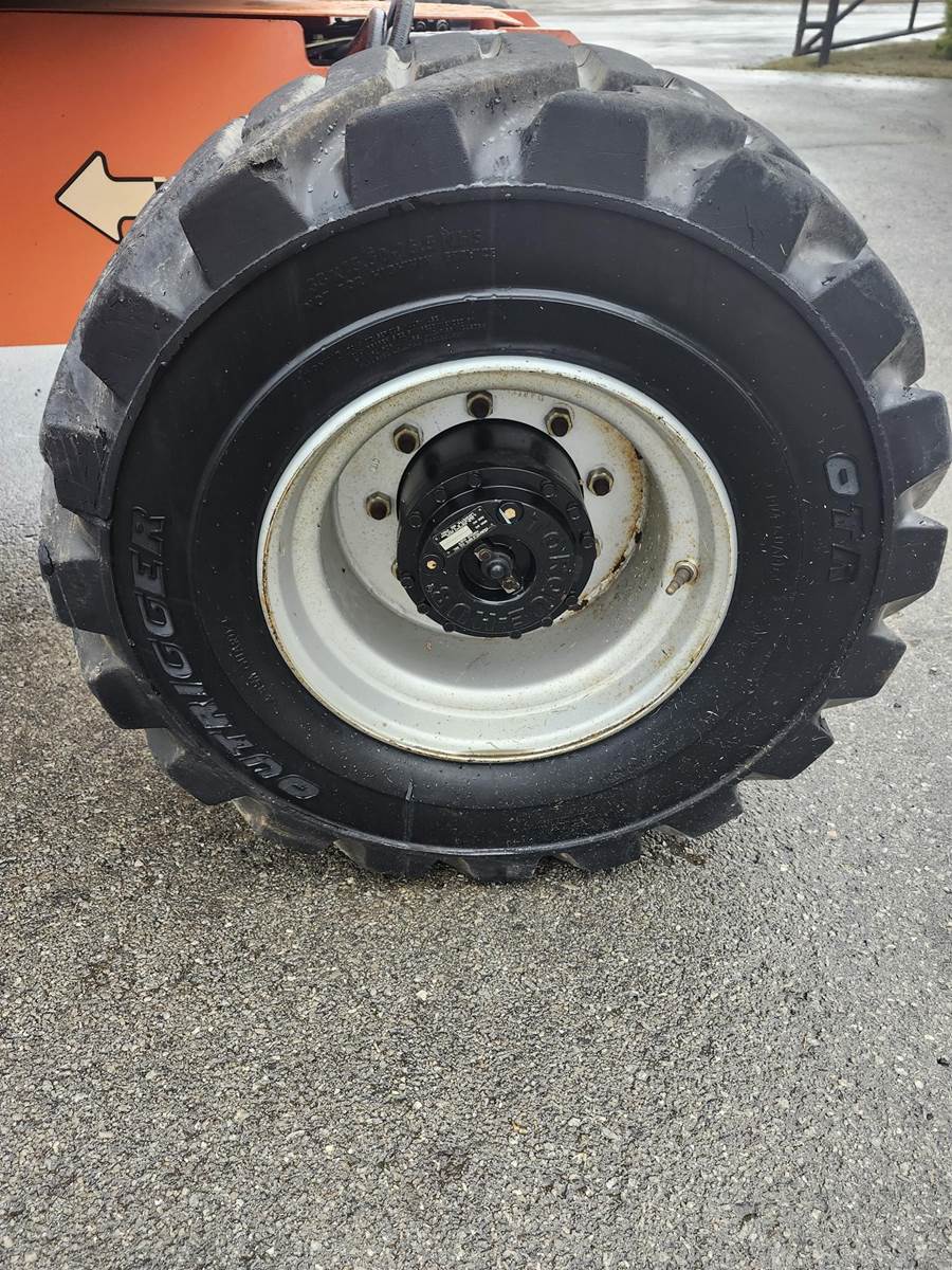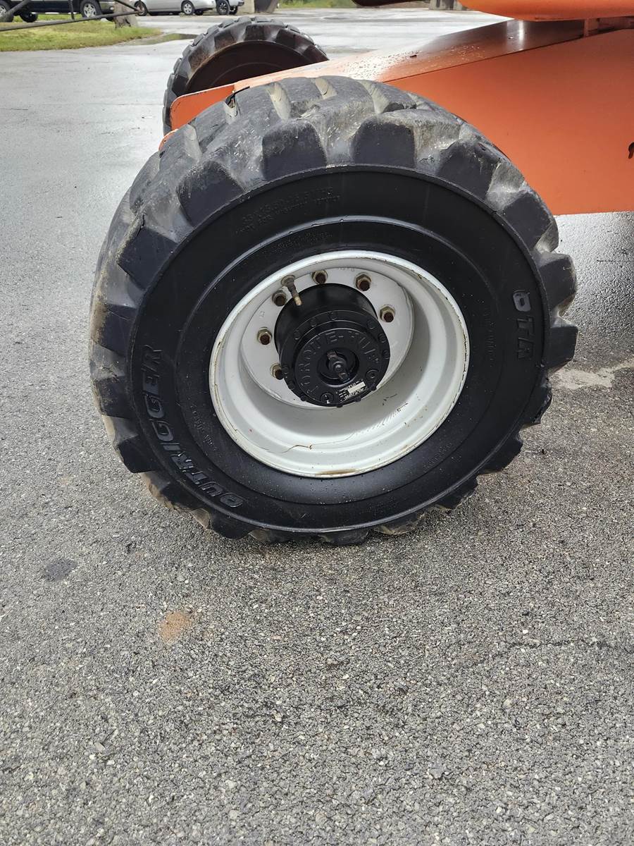 The 2014 JLG 450AJ is an articulating boom lift with a 45-foot platform height and a maximum platform capacity of 550 lbs. It has a 25-foot horizontal reach, a 355-degree non-continuous swing, and a 180-degree hydraulic platform rotator. The lift weighs 12,650 lbs and can handle a 45% grade, Jib, Power to Platform, 2013 US EPA Label, Deutz D 2.9 L4 4 Cylinder 49 hp 2.92 L Diesel Engine, 33x15.50-16.5 Tires
