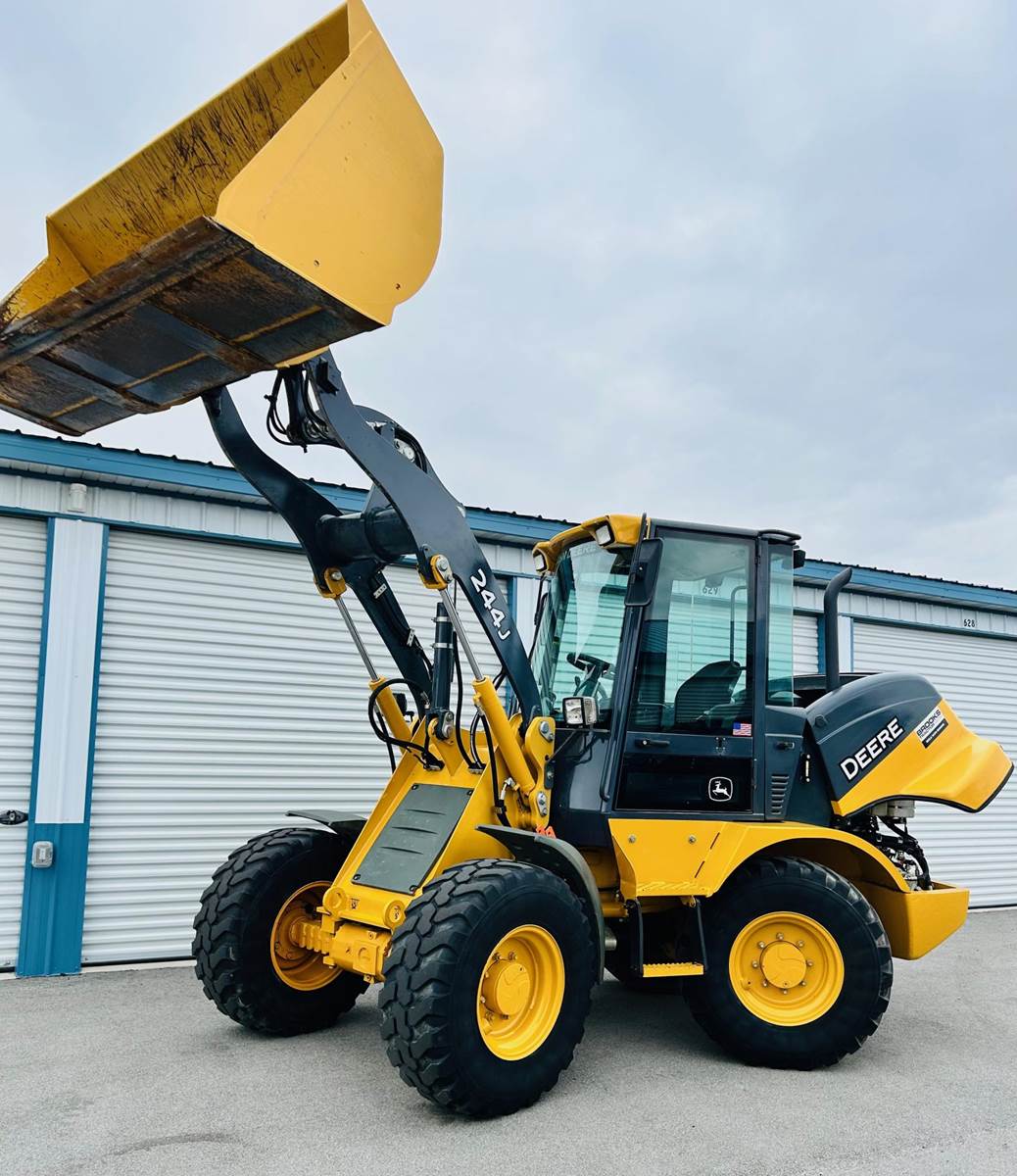 2014 Deere 244J Wheeled Loader, Repacked & polished cylinders, New paint, New turbo, New alternator. Ride control, 4-wheel steering, 59 HP, Operating Weight 11,552-lb., 9,000 hours, Engine ake 2240, Engine Model e 4024T, Net Power 59hp, Gross Power 64hp, Max Torque 163lb ft, Displacement 149cu in, Aspiration Turbocharged, Operating Weight 11552lb, Fuel Capacity 22gal, Hydraulic System Fluid Capacity 16gal, Engine Oil Fluid Capacity 9gal, Cooling System Fluid Capacity 10.6gal, Front Axle/Diff Fluid Capacity 4.2gal, Rear Axle/Diff Fluid Capacity 4.3gal, Static Tipping Weight 8457lb, Turning Radius 11.5ft in, Operating Voltage 12V, Alternator Supplied Amperage 65amps, Rear Axle Oscillation, 20degrees, Tire Size 365/70R18. Well maintained and runs good.