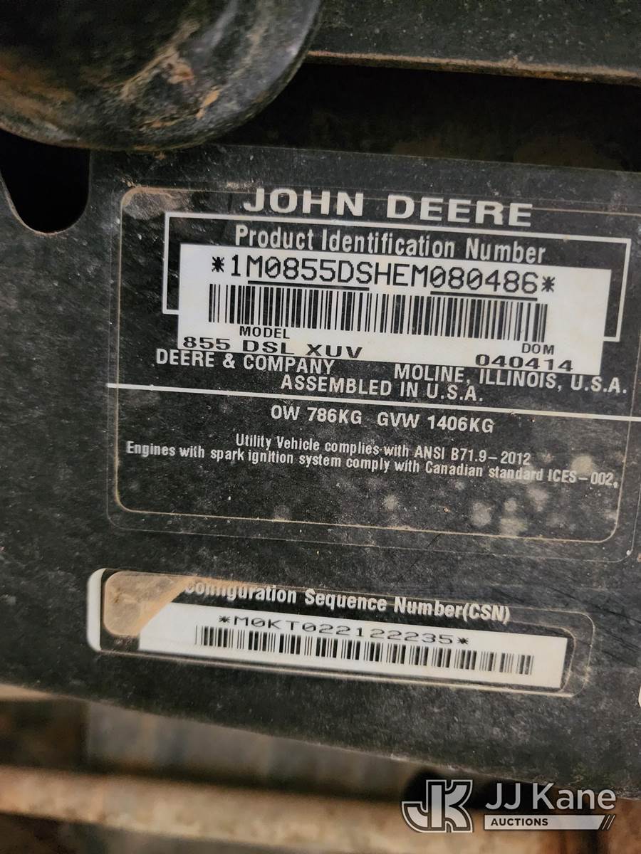 2014 John Deere 855 4x4 All-Terrain Vehicle, s/n 1M0855DSHEM080486, Gas, (Condition Unknown) NOTE: This unit is being sold AS IS/WHERE IS via Timed Auction and is located in McAlester, OK. Winning Buyer/Hauler must present copy of paid invoice upon arrival to pick up. For load out and pick up information, please reference the release form sent out after purchase. (Buyer is responsible for removal. Assistance by consignor or JJ Kane Auctions is not assured.)