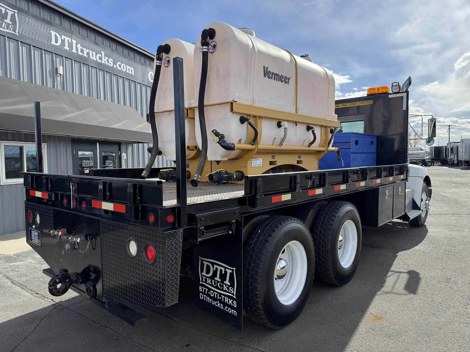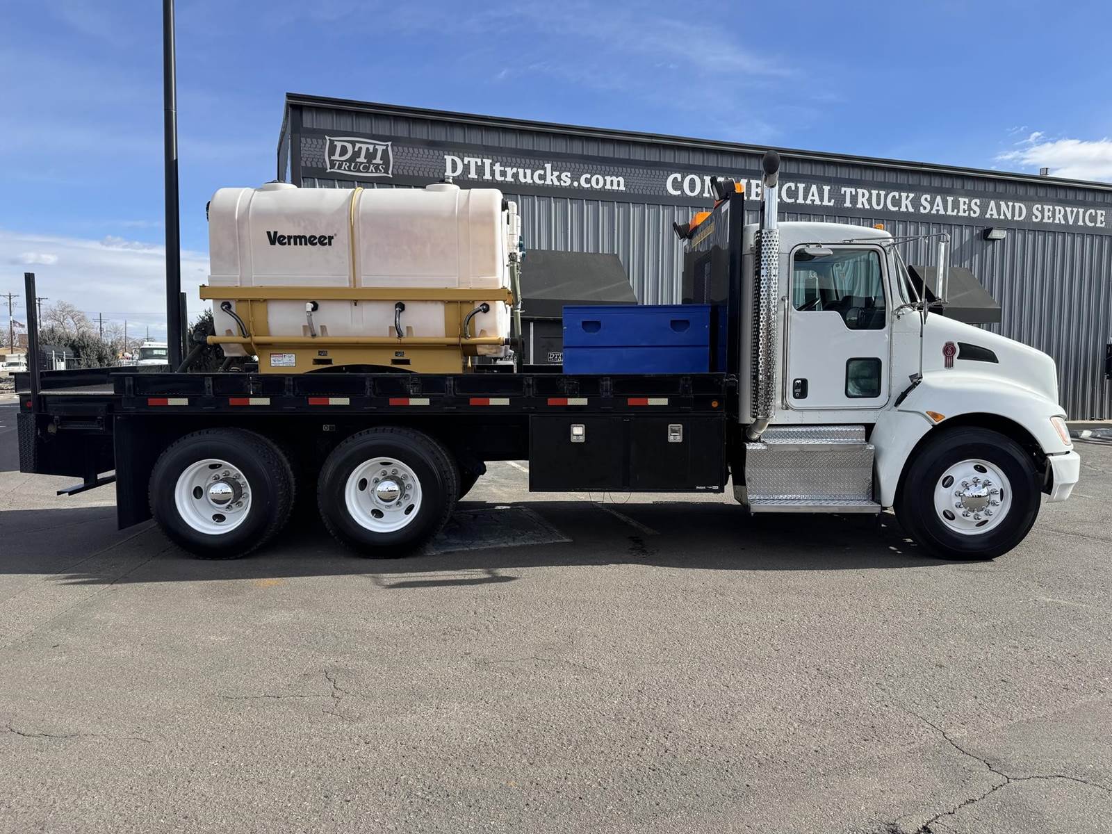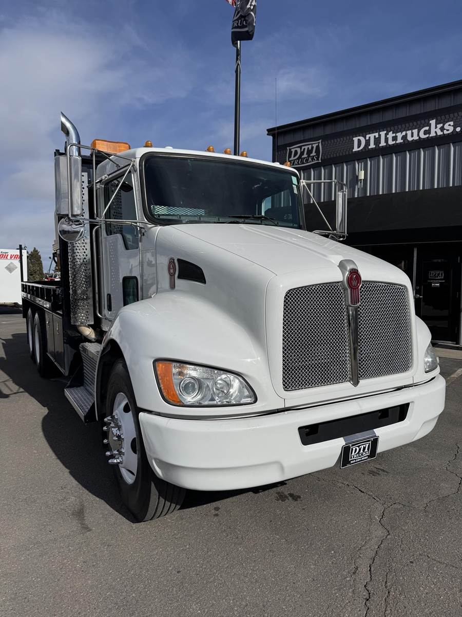 2014 Kenworth T370 Tandem Axle Flatbed with Vermeer Tanks, Paccar PX-7 6.7L Turbo Diesel Engine, 300 HP, Exhaust Brake, Allison 3000 RDS 6 Speed Automatic Transmission, ONLY 6,958 ECM Verified Miles, 332 ECM Verified Hours, 54,600 LB GVWR (14,600 Lbs. Steer Axle, 40K Lbs. Combined Drives) 6.17 Ratio, Power Divider Lock, 205” Wheel Base, 138” CT, Spring Suspension, 12R22.5 Steer Tires, 11R22.5 Drive Tires All Mounted On Steel Wheels, 60 Gallon Aluminum Diesel Tank, Block Heater, CARB Compliant, Air Brakes, Air Conditioning, Tilt & Telescoping Steering Wheel, Cruise Control, Radio, Power Passenger Side Window, Power Locks, Heated Mirrors, Air Ride Driver Seat, Bench Seat For Two, (2) 500 Gallon “Slim Fit” Tanks, Spec Sheet Available Upon Request, 18’ Knapheide Steel Deck Flatbed, 96” Wide With Fold Down Sides, (2) Gang Boxes, (1) 3’ Frame Mounted Toolbox, (1) 5’ Frame Mounted Tool Box, Pintle Hitch With Air To The Rear, Johnson Trailer Bar, Electric Brake Controller, (2) Work Lights, (2) Strobe Lights. This Low Use Kenworth Directional Boring Truck Is COMING SOON To DTI Trucks In Denver, CO. Stock #17786D. Call Or Text Brent For More Information (303) > 598 > 1923