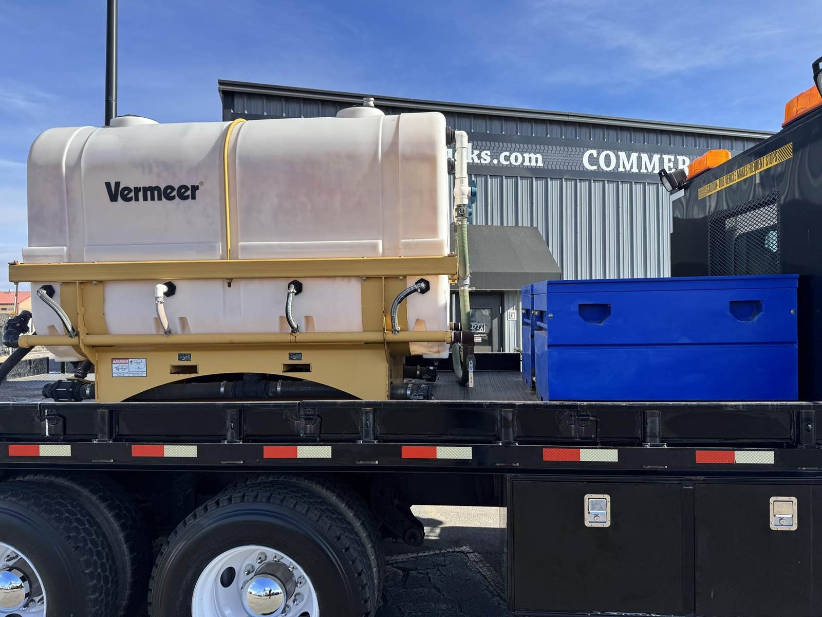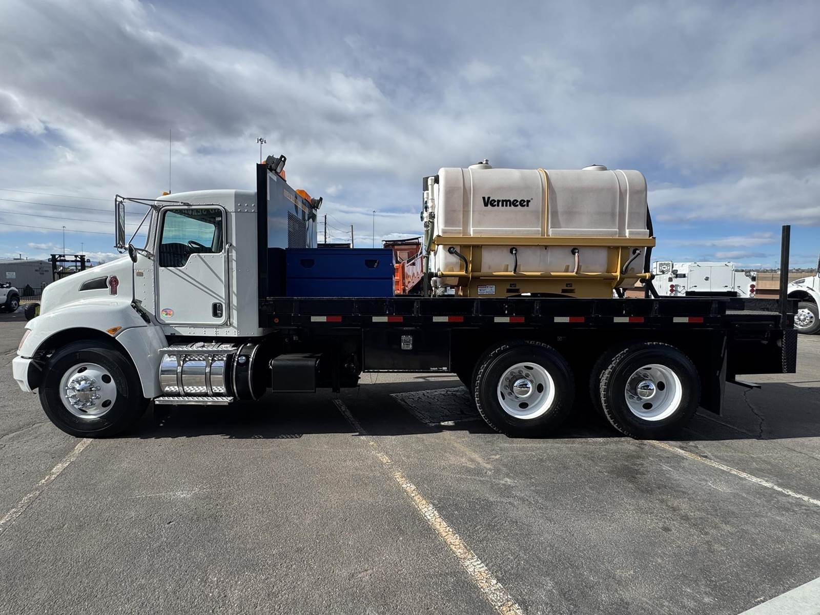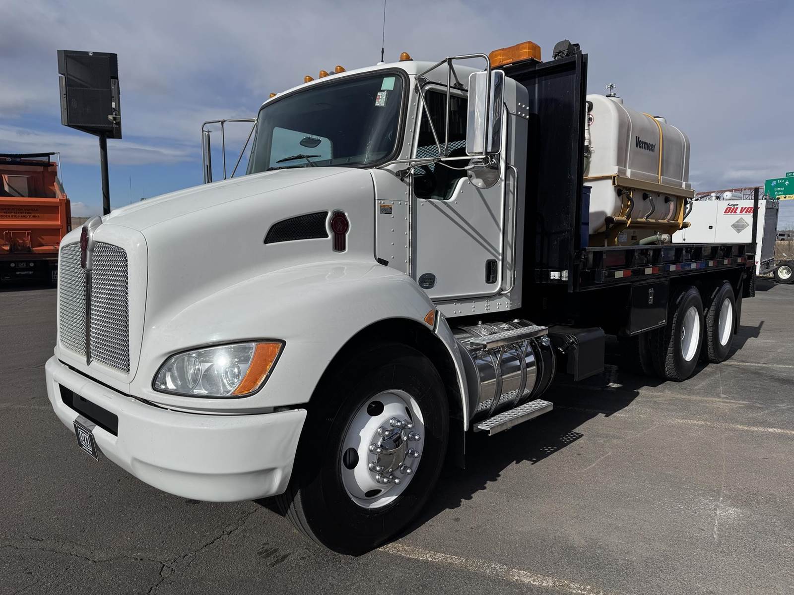 2014 Kenworth T370 Tandem Axle Flatbed with Vermeer Tanks, Paccar PX-7 6.7L Turbo Diesel Engine, 300 HP, Exhaust Brake, Allison 3000 RDS 6 Speed Automatic Transmission, ONLY 6,958 ECM Verified Miles, 332 ECM Verified Hours, 54,600 LB GVWR (14,600 Lbs. Steer Axle, 40K Lbs. Combined Drives) 6.17 Ratio, Power Divider Lock, 205” Wheel Base, 138” CT, Spring Suspension, 12R22.5 Steer Tires, 11R22.5 Drive Tires All Mounted On Steel Wheels, 60 Gallon Aluminum Diesel Tank, Block Heater, CARB Compliant, Air Brakes, Air Conditioning, Tilt & Telescoping Steering Wheel, Cruise Control, Radio, Power Passenger Side Window, Power Locks, Heated Mirrors, Air Ride Driver Seat, Bench Seat For Two, (2) 500 Gallon “Slim Fit” Tanks, Spec Sheet Available Upon Request, 18’ Knapheide Steel Deck Flatbed, 96” Wide With Fold Down Sides, (2) Gang Boxes, (1) 3’ Frame Mounted Toolbox, (1) 5’ Frame Mounted Tool Box, Pintle Hitch With Air To The Rear, Johnson Trailer Bar, Electric Brake Controller, (2) Work Lights, (2) Strobe Lights. This Low Use Kenworth Directional Boring Truck Is COMING SOON To DTI Trucks In Denver, CO. Stock #17786D. Call Or Text Brent For More Information (303) > 598 > 1923