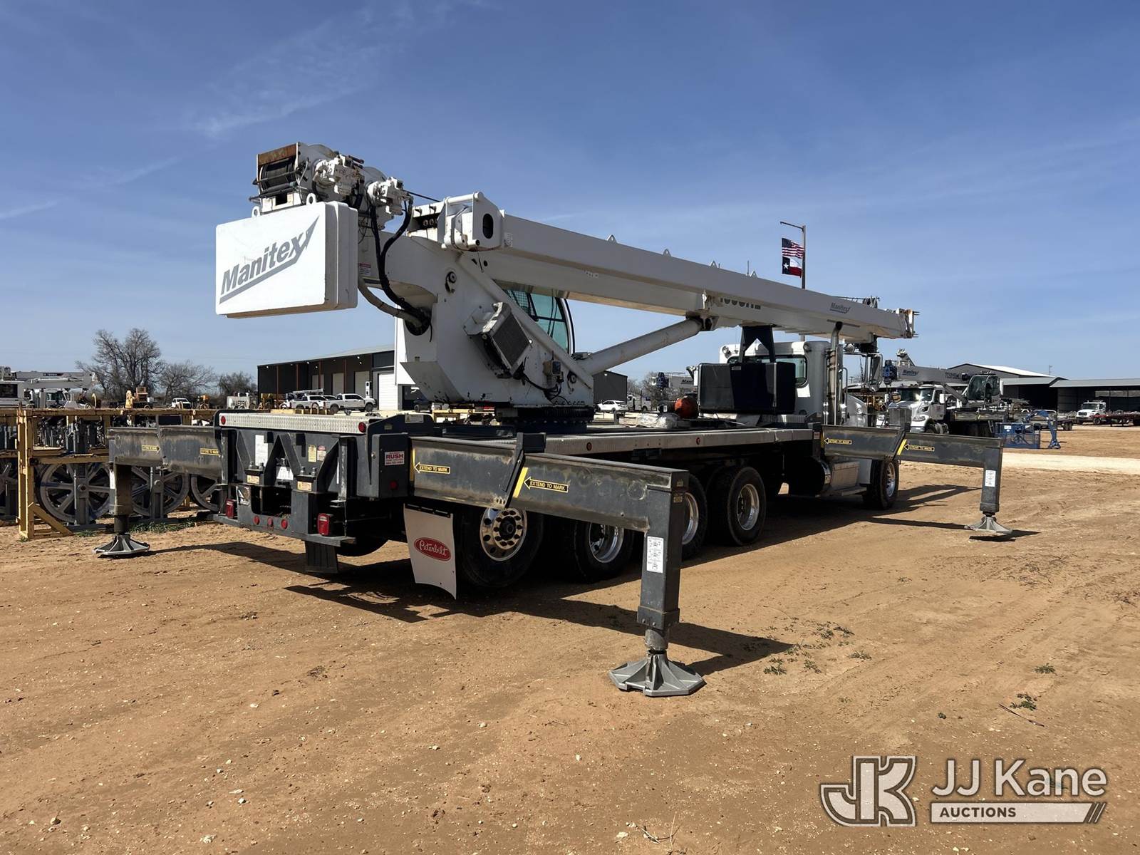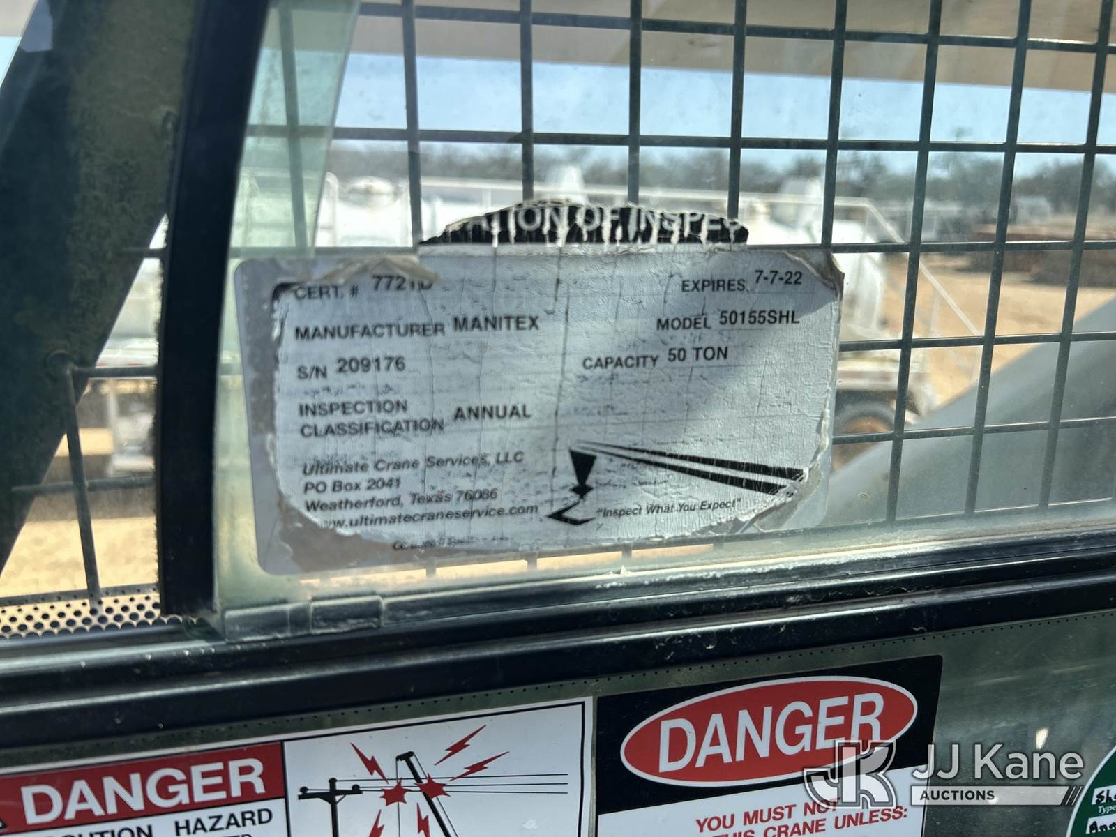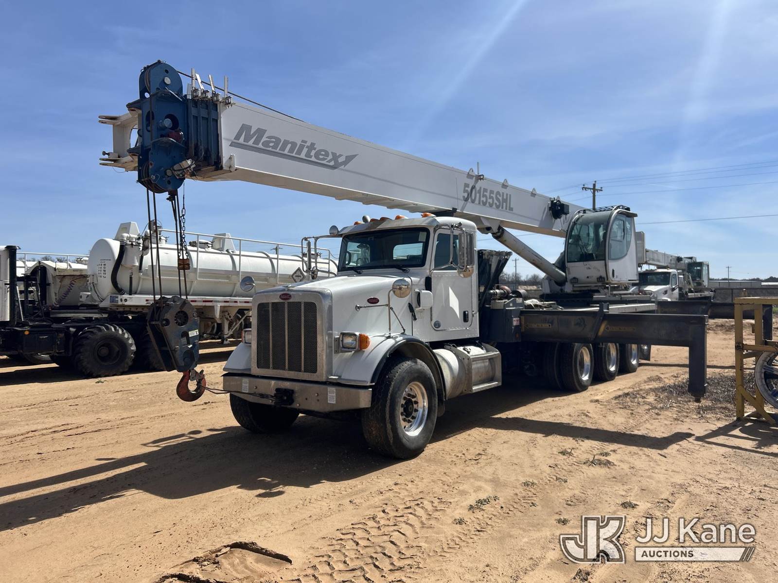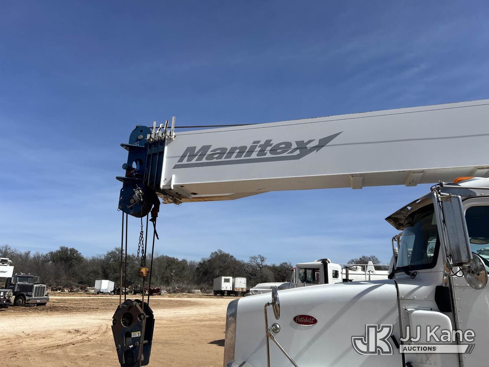 Manitex 50155SHL, 50-Ton Hydraulic Truck Crane s/n 209176, with 204ft. sheave height, 38 ft to 155 ft of 5 section boom, 39 ft swing away jib, anti-two block, heel winch, 2-sheave hook block, headache ball, aux winch, LMI, remote & enclosed cab w/A/C, rear mounted on 2014 Peterbilt 365 Quad-Axle Flatbed Truck, 11.9L L6 DIESEL 15-spd, A/C, with air ride suspension & air lift 1st axle, (40,346 miles) (Runs & Moves, Jump To Start) (Check Engine Light, Outriggers Operate, Missing Outrigger Pad, Seller States: Upper Operates) (Reads 20,285 hours) This is a Titled Item NOTE: This unit is being sold AS IS/WHERE IS via Timed Auction and is located in Stephenville, TX. For more information & removal arrangements please contact Matt Kaman @ 919-800-7863. (Missing manuals, See Auction Company for Manufacturers Information to obtain manuals) (Buyer is responsible for removal. Assistance by consignor or JJ Kane Auctions is not assured.)