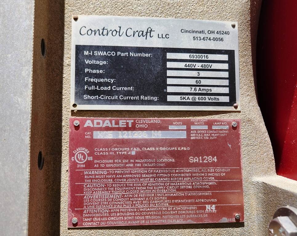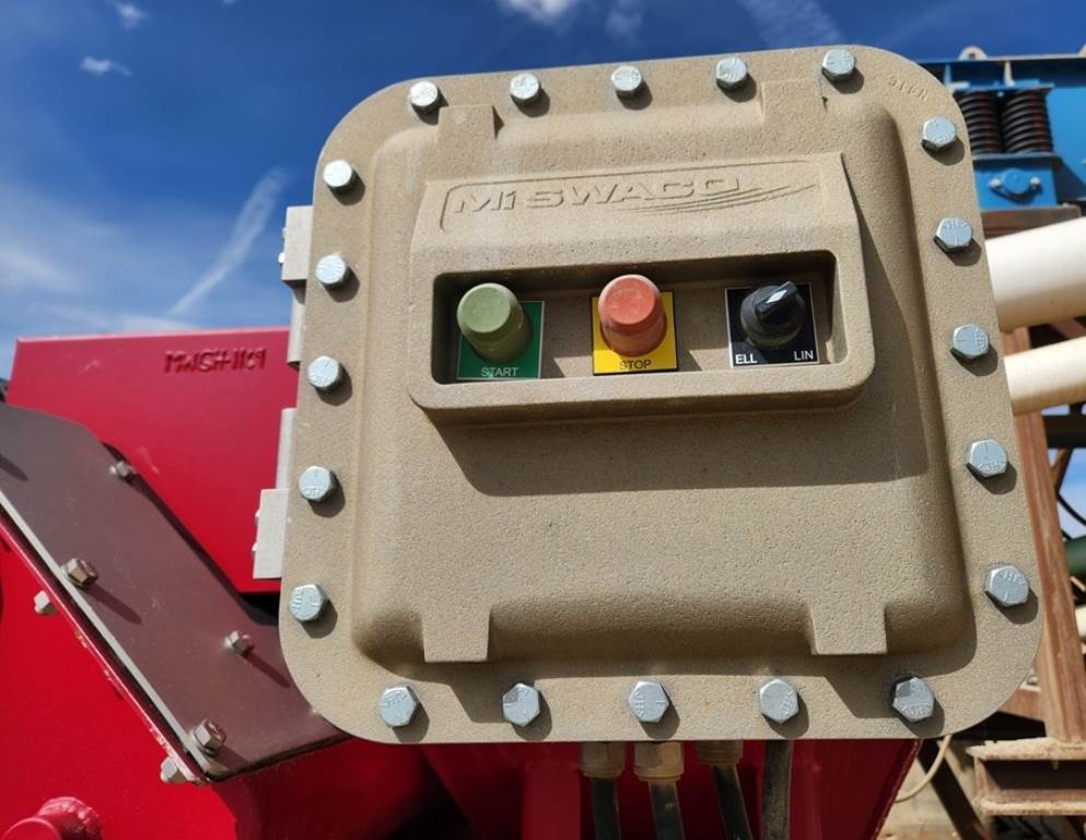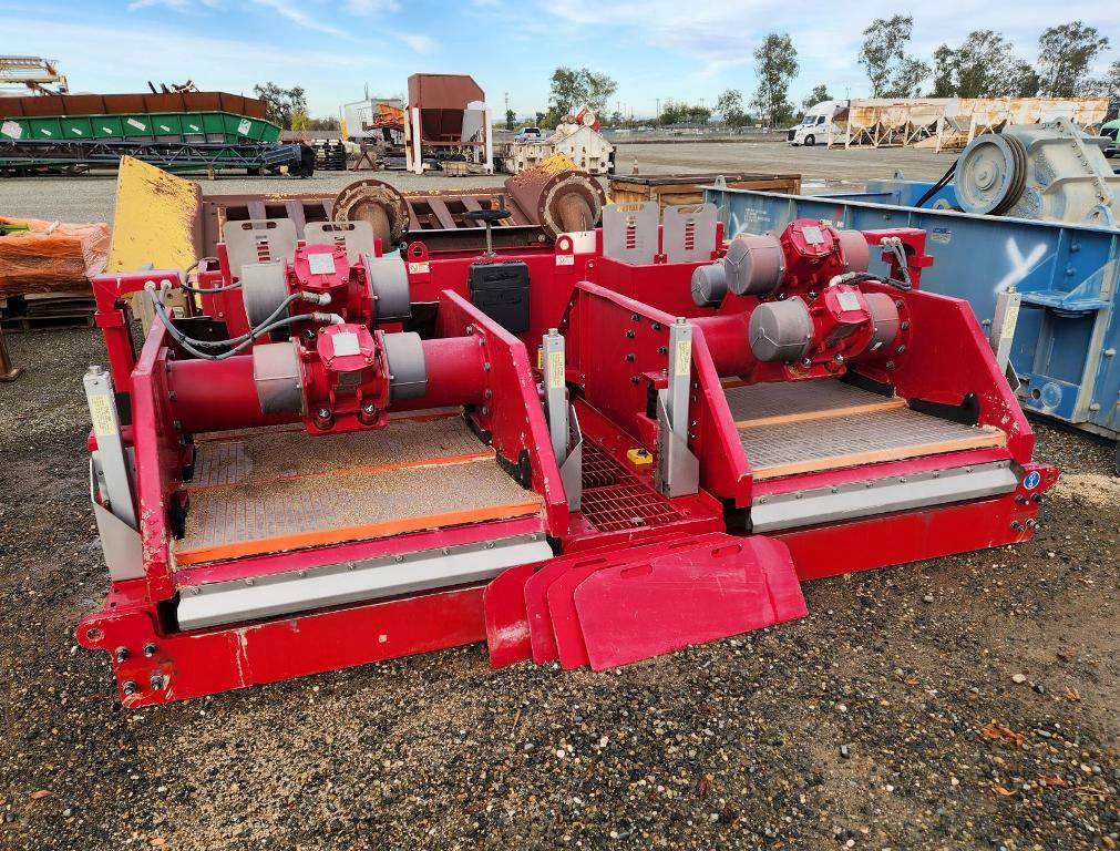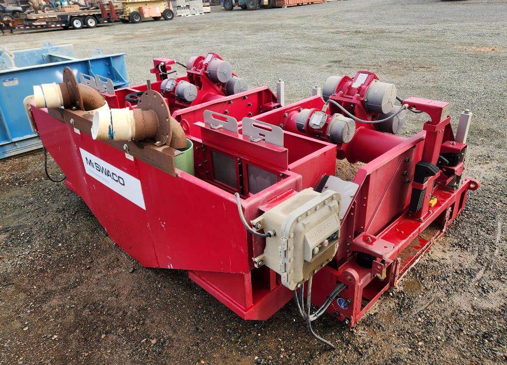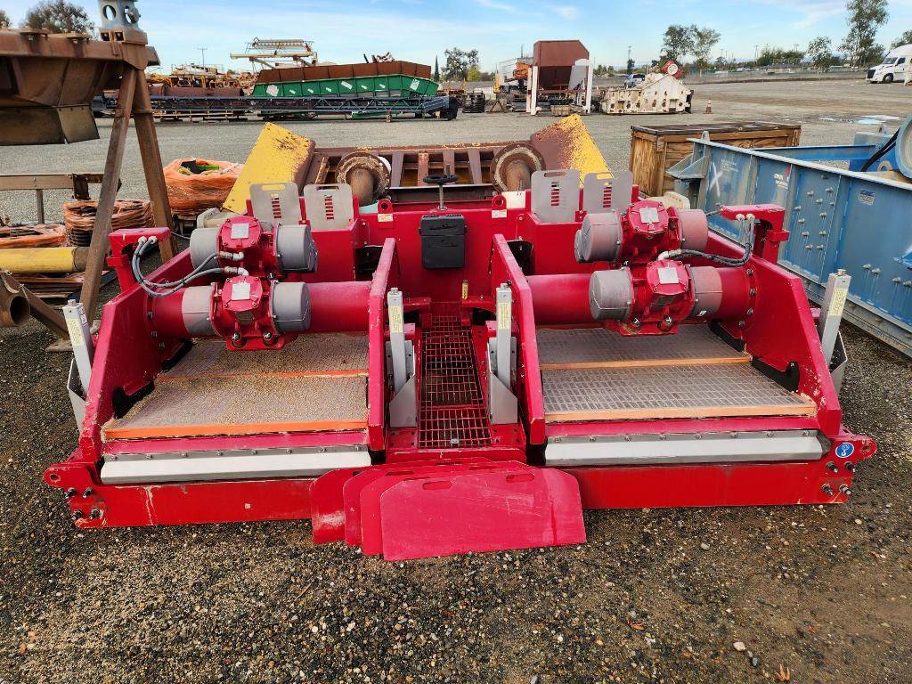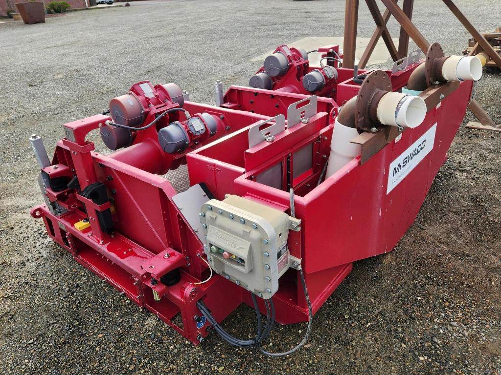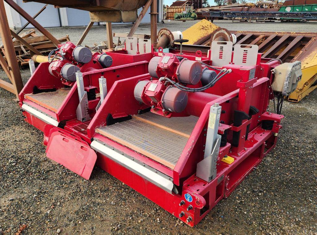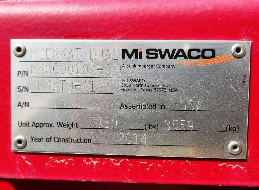 (1) – one – Mi SWACO Meerkat Dual Shaker-Dual Motion Hi-Frequency Horizontal Dewatering Screens including two 23” wide x 46” long Single Deck Horizontal Screens with (3)-three oil bath lubricated electric motor-vibrators. Two primary motors are 2 h.p. 1800 rpm for Hi G-force linear motion. One motor is 0.6 h.p.1800 rpm for adjust on the fly motion from linear to balanced elliptical motion with a flip of a switch. Feed distribution box, common under screen possum belly pan, manually operated knife bypass or flow control gates, steel coil spring isolation, one common steel base support base frame. Electric motor control box for each screen. Includes some new spare flat modular screen media with slotted openings, Date of Mfr. 2014; P/N MK3C00105-33R2; S/N MKATD-013. Weight: 7,900 lbs.