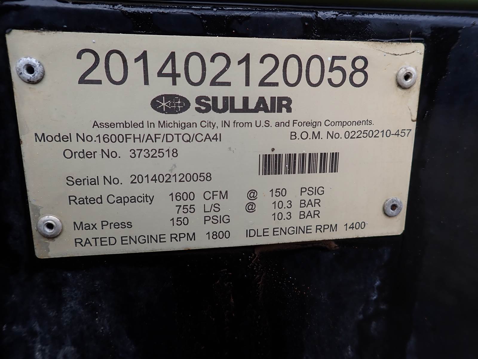 2014 Sullair 1600HAF 1600 CFM Air Compressor