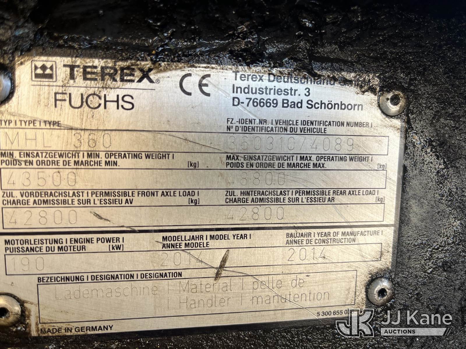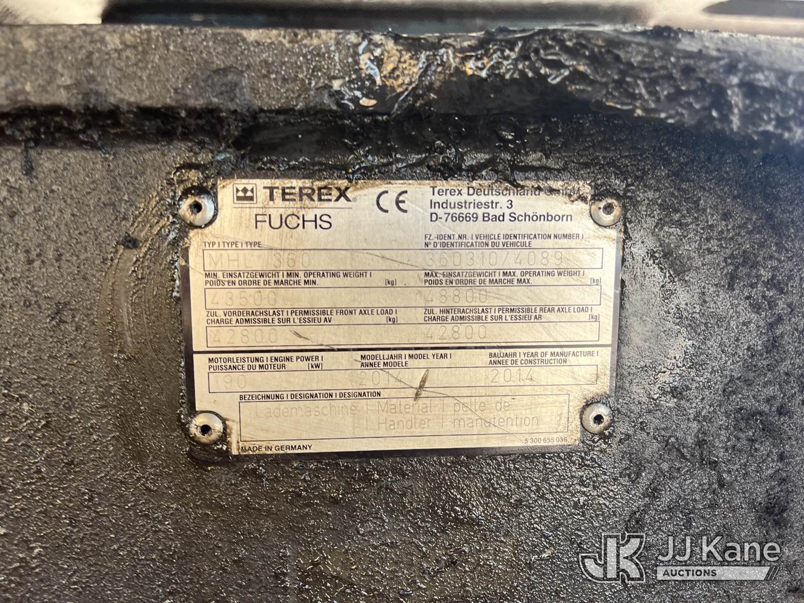 2014 Terex/FUCHS MHL 360 Material Handler, s/n 36031074089, Deutz diesel, Hydraulic Drive, with grapple, (Runs, Moves & Operating Condition Unknown) (Needs Battery’s, Needs Tires, Class III Hydraulic Leak) (Buyer Responsible For Removing Unit) NOTE: This unit is being sold AS IS/WHERE IS via Timed Auction and is located in Tampa, FL. For more information & removal arrangements please contact Kevin Smith @ kevin.smith@jjkane.com. (Buyer is responsible for removal. Assistance by consignor or JJ Kane Auctions is not assured.)