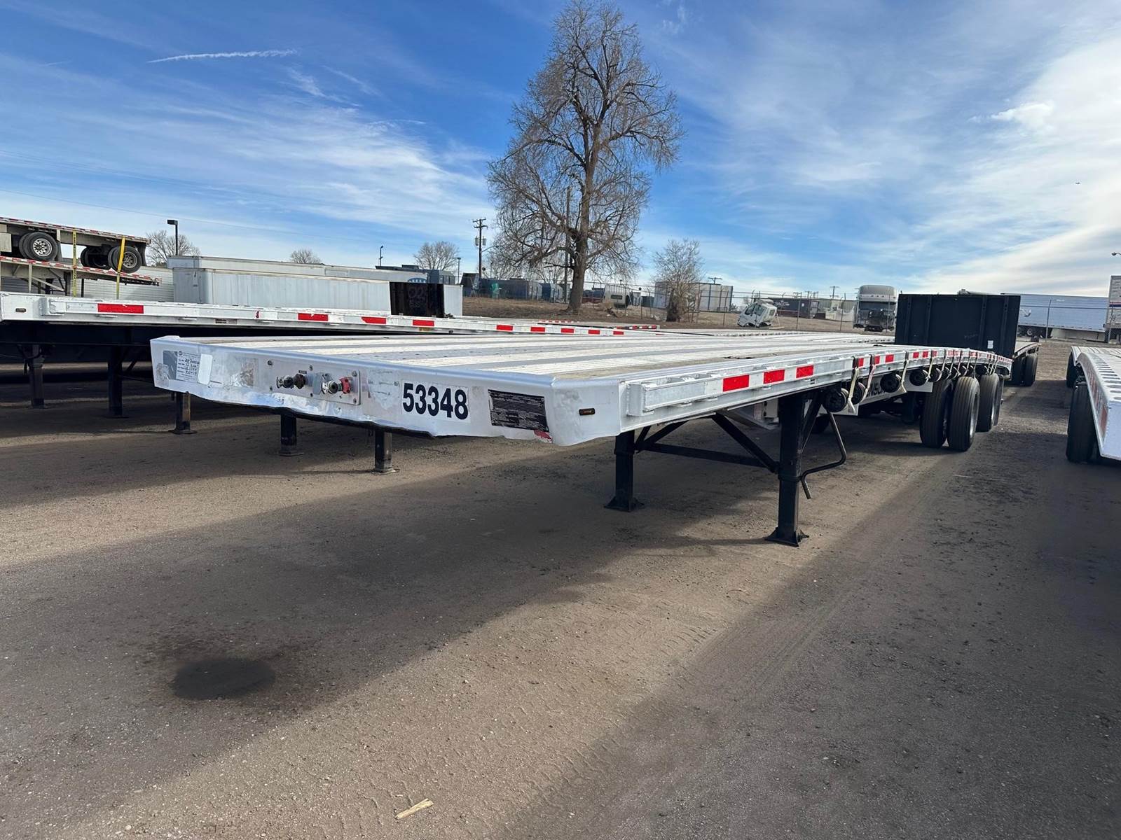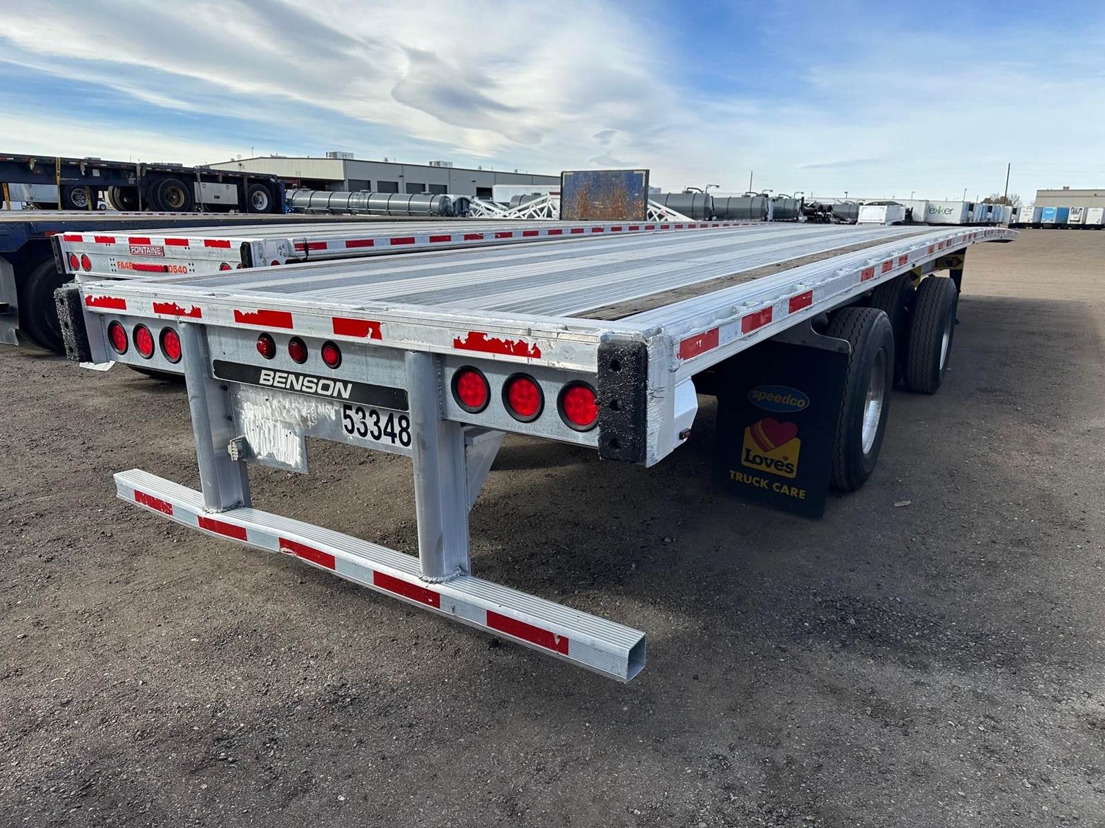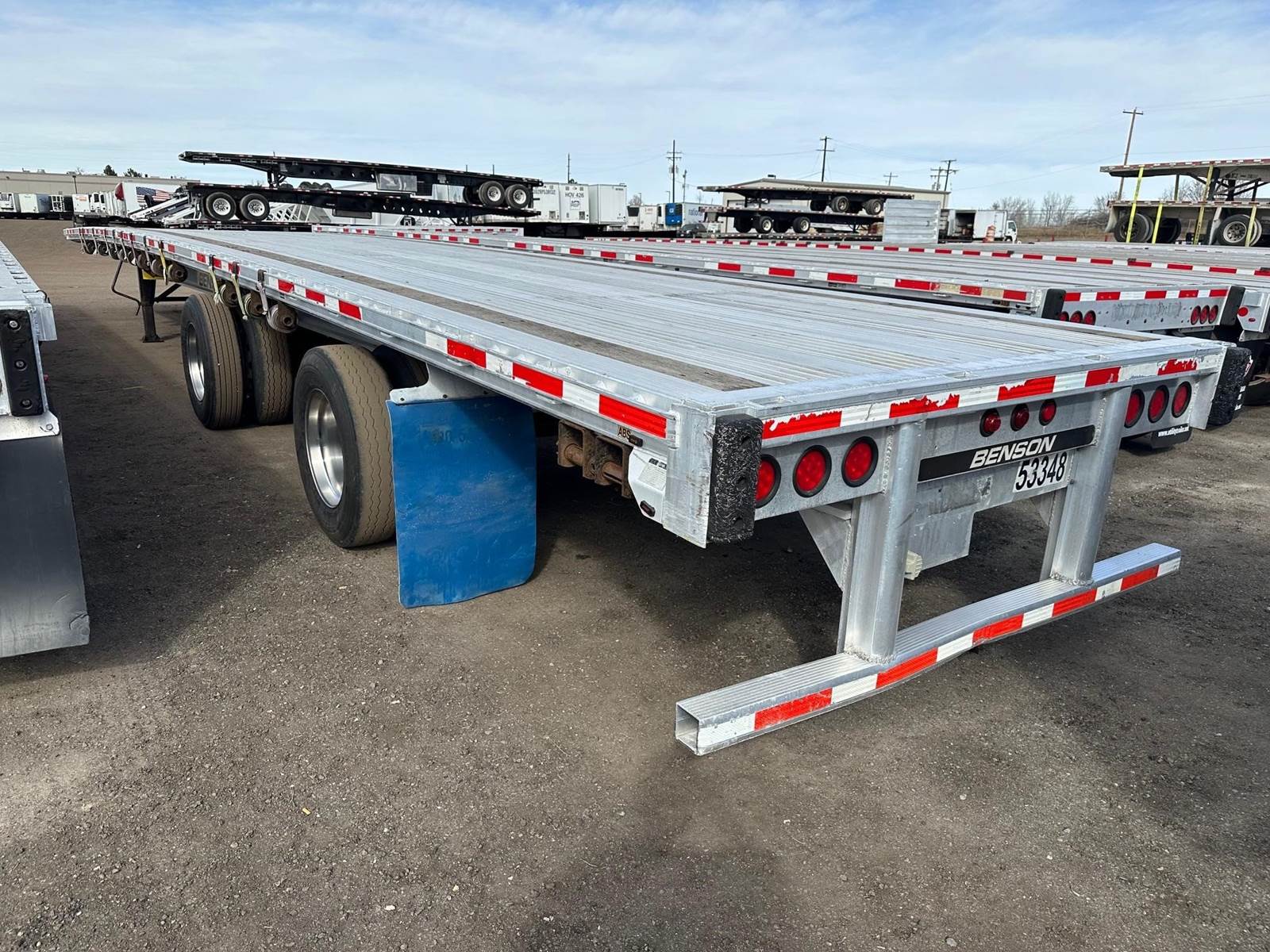 2014 Transcraft/Benson All Aluminum Flatbed, California Legal Trailer, 53' x 102", Aluminum Main Beams Deck and Rails, Nail Strips, Stake Pockets, Pipe Spools, Sliding Winches, Fixed Spread Air Ride, Outside Aluminum Wheels, Inside Steel Wheels, 22.5LP Tires, ICC Bumper.
