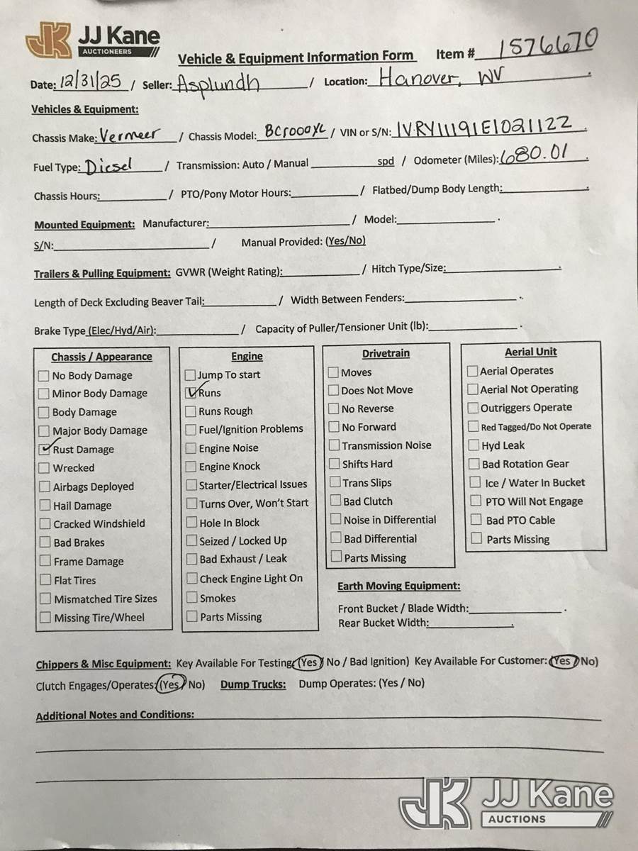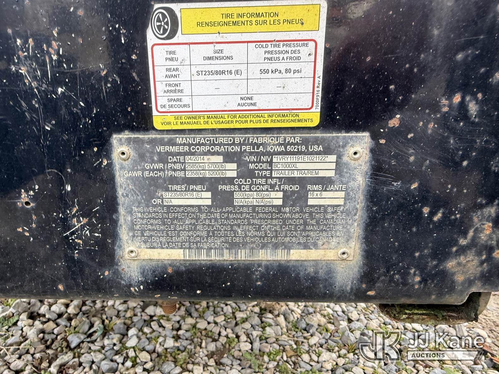 2014 Vermeer BC1000XL Chipper (12in Drum), s/n 1VRY11191E1021122, diesel, trailer mtd. (1.2.26 (Certificate of Origin) - Daphne No Title) (Runs, Rust Damage) (Seller States: May Need New Battery) (Reads 650 hours) NOTE: This unit is being sold AS IS/WHERE IS via Timed Auction and is located in Hanover, WV. Inspection & preview days for this unit are by appointment only; please contact us at contact@jjkane.com or 84-Go-JJKane for more details. (Buyer is responsible for removal. Assistance by consignor or JJ Kane Auctions is not assured.)