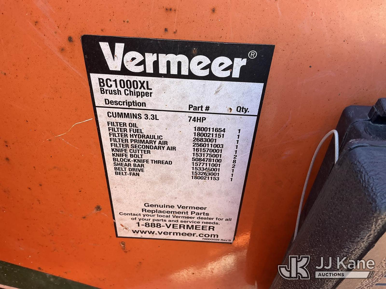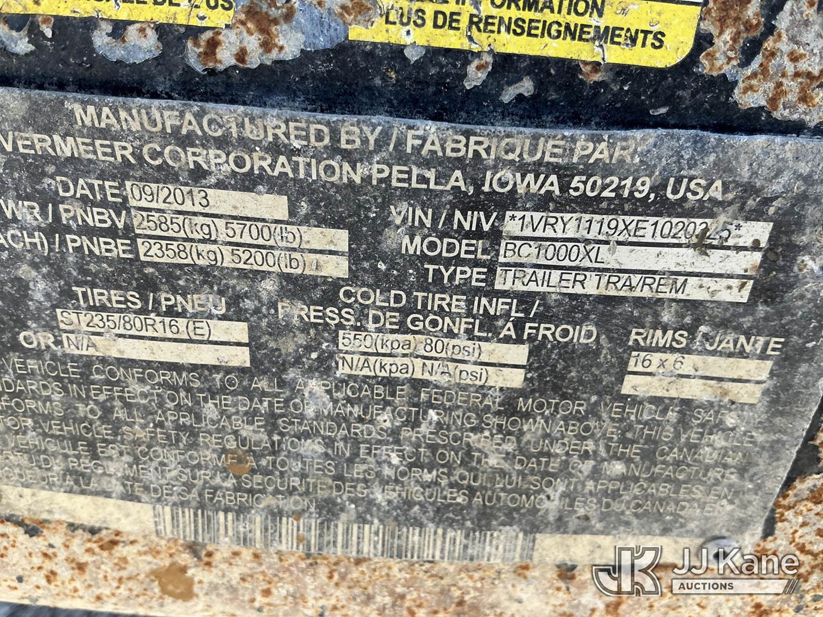 2014 Vermeer BC1000XL Chipper (12in Drum), s/n 1VRY1119XE1020325, Diesel, (Not Running, Conditions Unknown) (Seller States: Electrical Issues & Bad Brakes ) (No Title) (Reads 3,545 hours) NOTE: This unit is being sold AS IS/WHERE IS via Timed Auction and is located in Kansas City, MO. Inspection & preview days for this unit are the 2 business days prior to the first day of items closing for this auction, item is located at 962 Tel Aviv Ave Kansas City, MO 64153 and hours of operations are 8a-4p. For pre-sale questions, please contact Ricky McPherson @ (816) 610-2250. (Buyer is responsible for removal. Assistance by consignor or JJ Kane Auctions is not assured.)