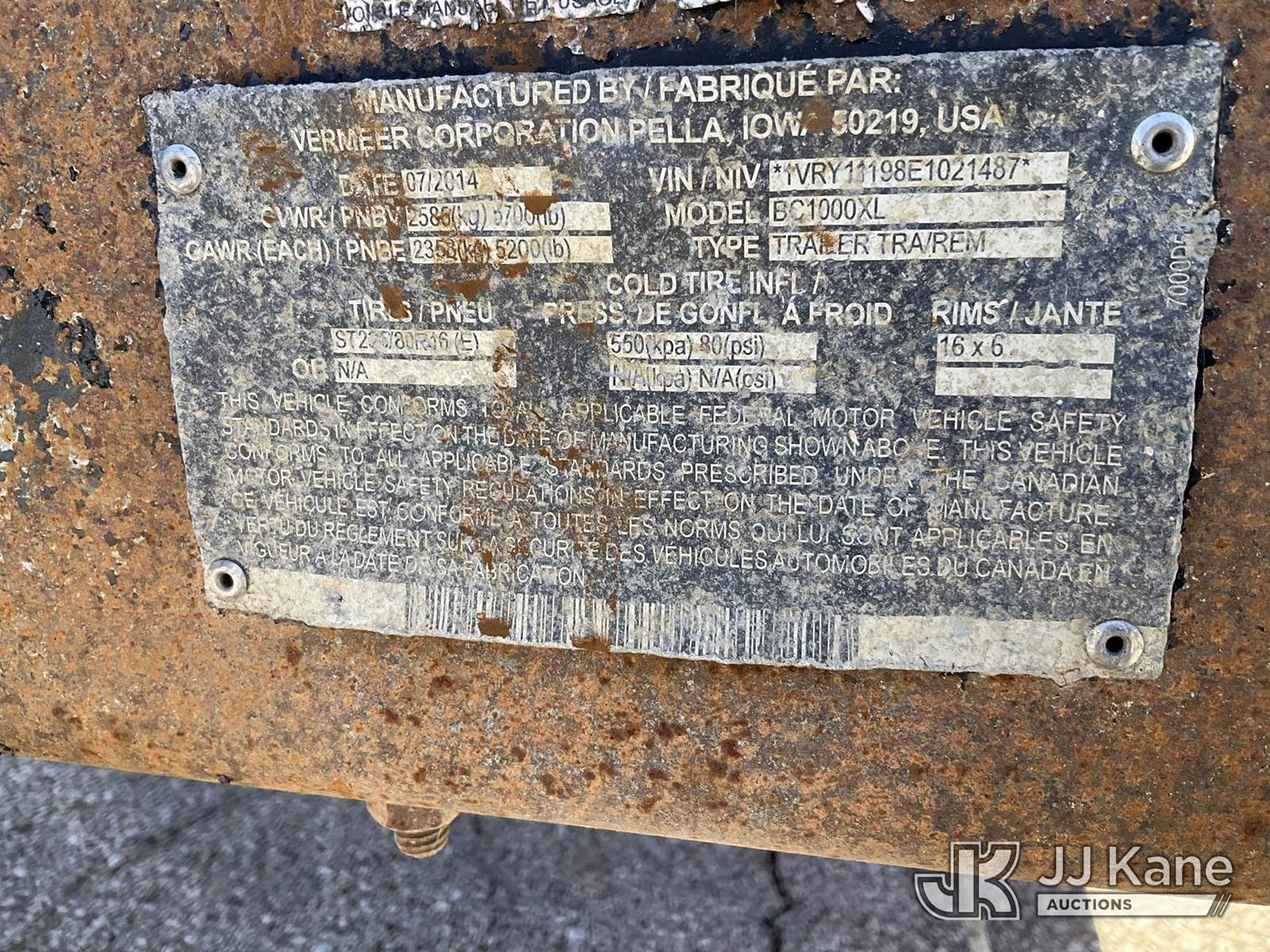 2014 Vermeer BC1000XL Chipper (12in Drum), s/n 1VRY11198E1021487, DIESEL, (Not Running) (Seller States: Electrical Issues & Bad Breaks) (Condition Unknown) (No Title) NOTE: This unit is being sold AS IS/WHERE IS via Timed Auction and is located in Kansas City, MO. Inspection & preview days for this unit are the 2 business days prior to the first day of items closing for this auction, item is located at 962 Tel Aviv Ave Kansas City, MO 64153 and hours of operations are 8a-4p. For pre-sale questions, please contact Ricky McPherson @ (816) 610-2250. (Buyer is responsible for removal. Assistance by consignor or JJ Kane Auctions is not assured.)