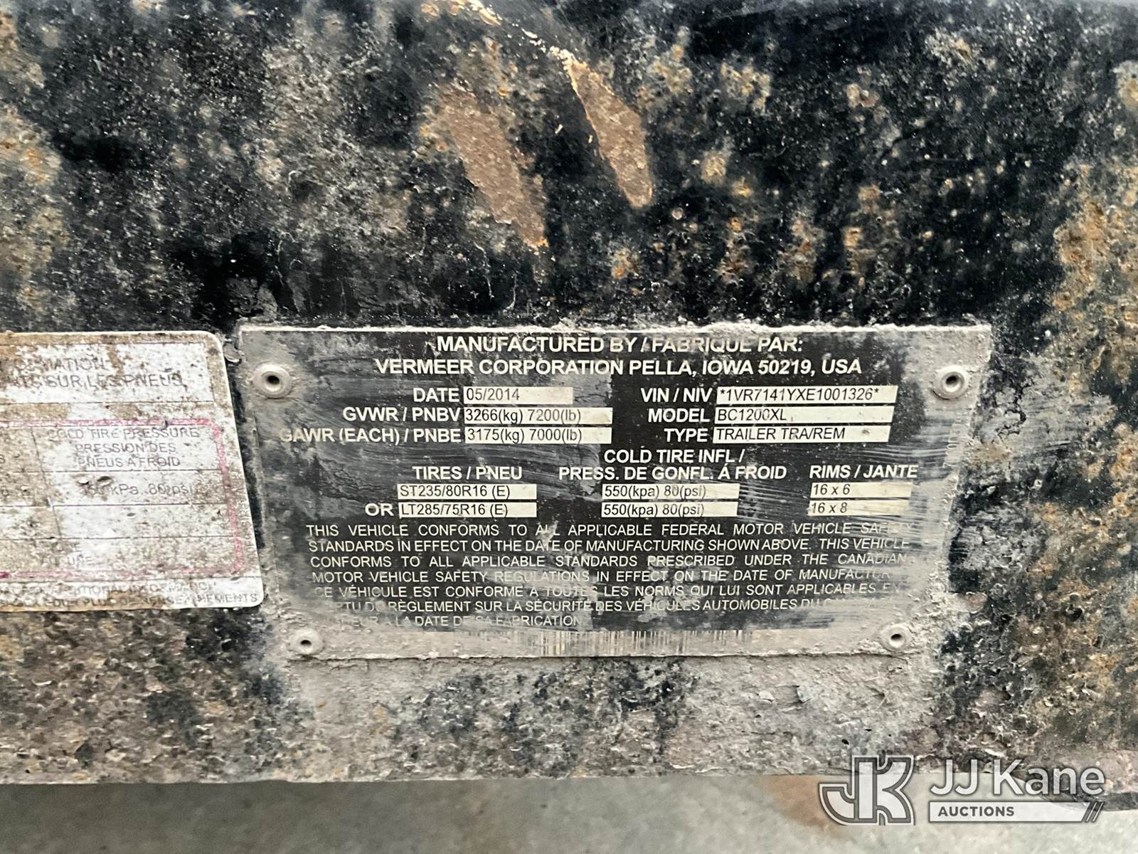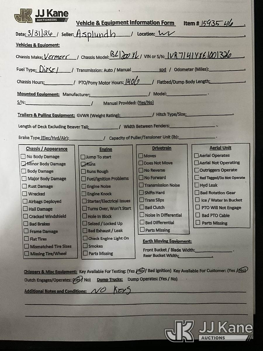 2014 Vermeer BC1200XL Chipper (12in Drum), diesel, trailer mtd. (Runs, No Key) (Reads 1,406 hours) This is a Titled Item NOTE: This unit is being sold AS IS/WHERE IS via Timed Auction and is located in Hanover, WV. Inspection & preview days for this unit are by appointment only; please contact us at contact@jjkane.com or 84-Go-JJKane for more details. (Buyer is responsible for removal. Assistance by consignor or JJ Kane Auctions is not assured.)