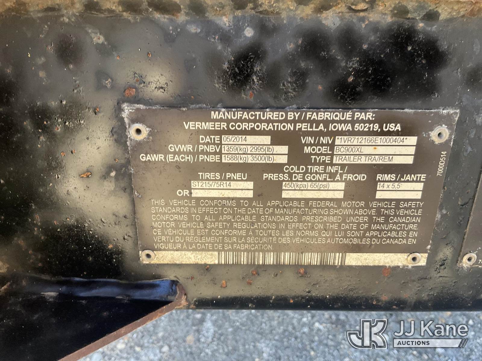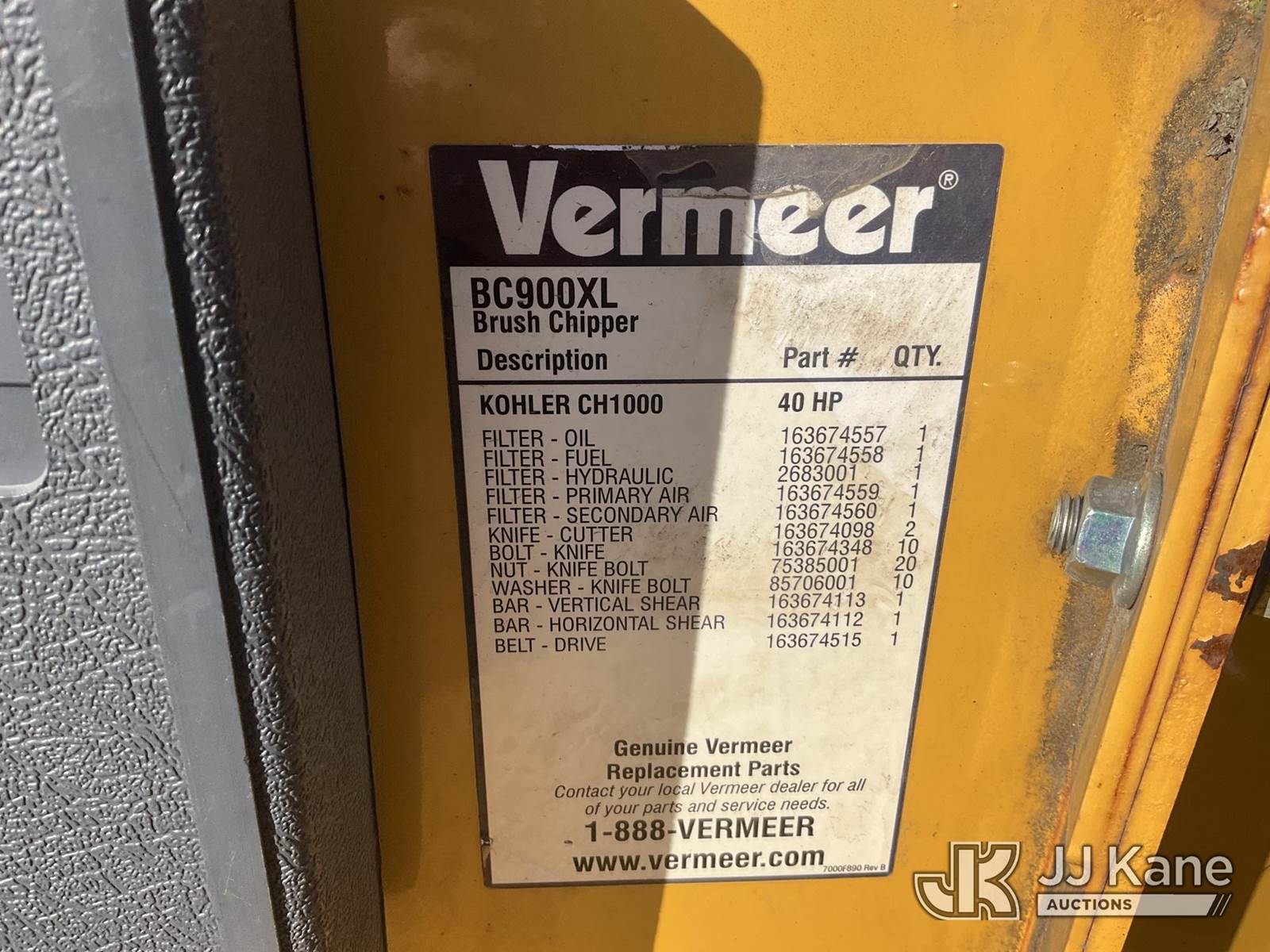 2014 Vermeer BC900XL Chipper (9in Disc), s/n 1VR712166E1000404, gas, (No Title) (Runs) NOTE: This unit is being sold AS IS/WHERE IS via Timed Auction and is located in Shrewsbury, MA. Inspection & preview days for this unit are the 2 business days prior to the first day of items closing for this auction, item is located at 11 Fortune Blvd Shrewsbury, MA 01545 and hours of operations are 8a-4p. For pre-sale questions, please contact Rob Gifford @ (508) 864-4126. (Buyer is responsible for removal. Assistance by consignor or JJ Kane Auctioneers is not assured.)