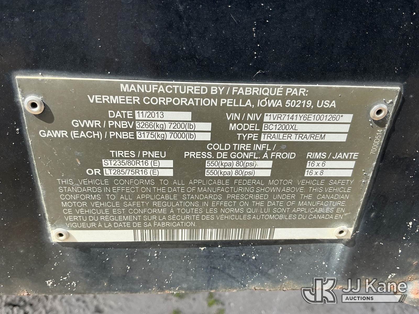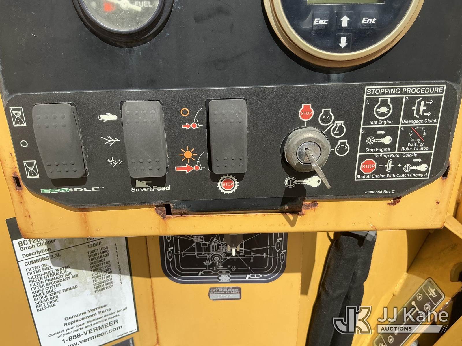 2014 Vermeer Corporation BC 1200XL Chipper (12in Drum), Cummins B3.3 diesel, trailer mtd., City of Oldsmar Unit (Runs & Operates)(FL Residents Purchasing Titled Items – tax, title & registration fees will be collected at the maximum rate of $400.00 under 25,999 and $800.00 for Over 26,000 and $250.00 trailers – Proof of insurance is mandatory; Out of State Residents Purchasing Title Items – tax will be collected based upon your state rate.) (Reads 179 hours) This is a Titled Item NOTE: This unit is being sold AS IS/WHERE IS via Timed Auction and is located in Thonotosassa, FL. Inspection & preview days for this unit are the 2 business days prior to the first day of items closing for this auction, item is located at 11720 N US 301 Thonotosassa, Fl 33592 and hours of operations are 8a-4p. For pre-sale questions, please contact Office Staff @ (813) 986-2485. (Buyer is responsible for removal. Assistance by consignor or JJ Kane Auctions is not assured.)