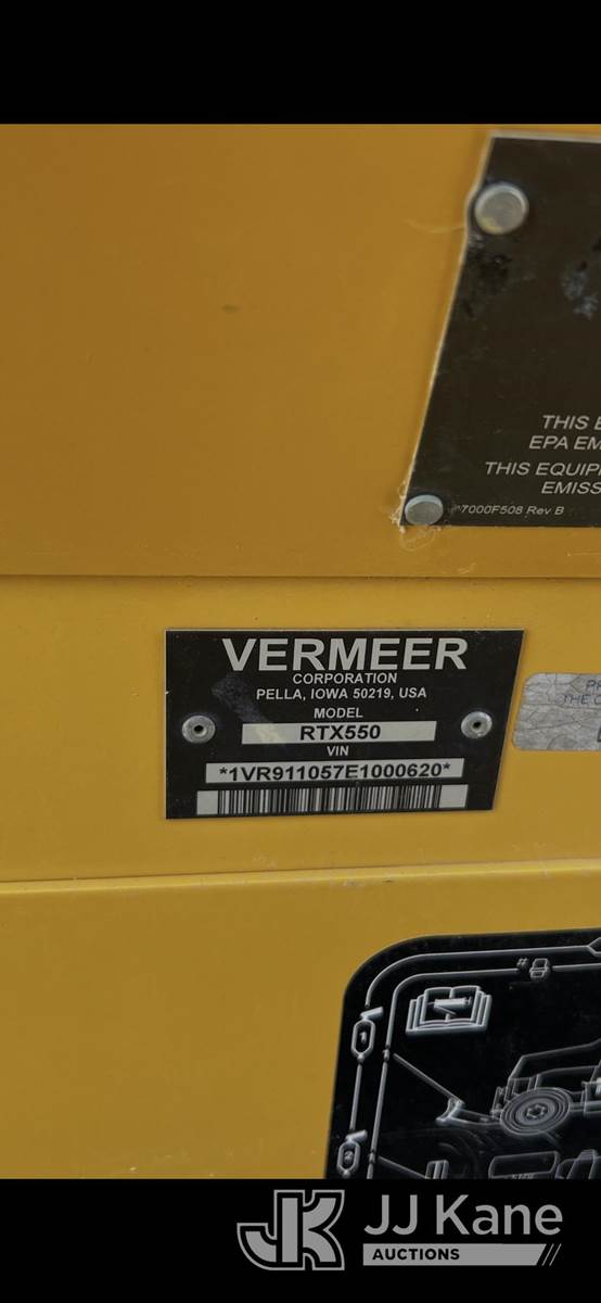 2014 Vermeer RTX550 Quad Tracked Trencher, s/n 1VR911057E1000620, diesel, Hydrostatic, with rubber tracks, trencher boom w/carbide/c-cup chain, hyd crumber, backhoe attachment, backfill blade & ROPS post w/canopy, (Municipality Owned) (Runs, Moves & Operates) (Reads 1,518 hours) NOTE: This unit is being sold AS IS/WHERE IS via Timed Auction and is located in Dothan, AL. For more information & removal arrangements please contact Dylan Evans @ 205-936-1094. Alabama Auctioneer Michael Whitebread - License # 5592. (Buyer is responsible for removal. Assistance by consignor or JJ Kane Auctions is not assured.)