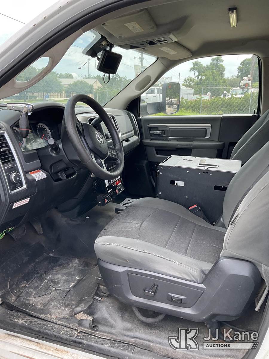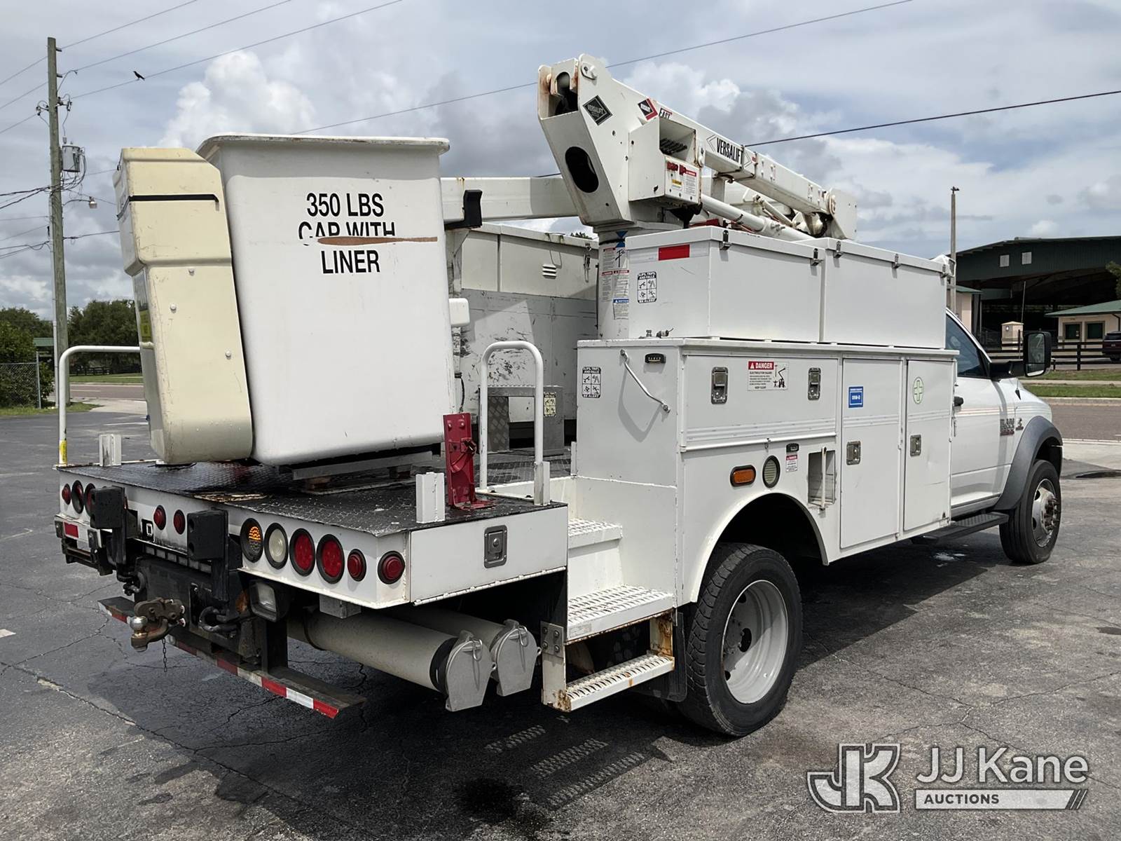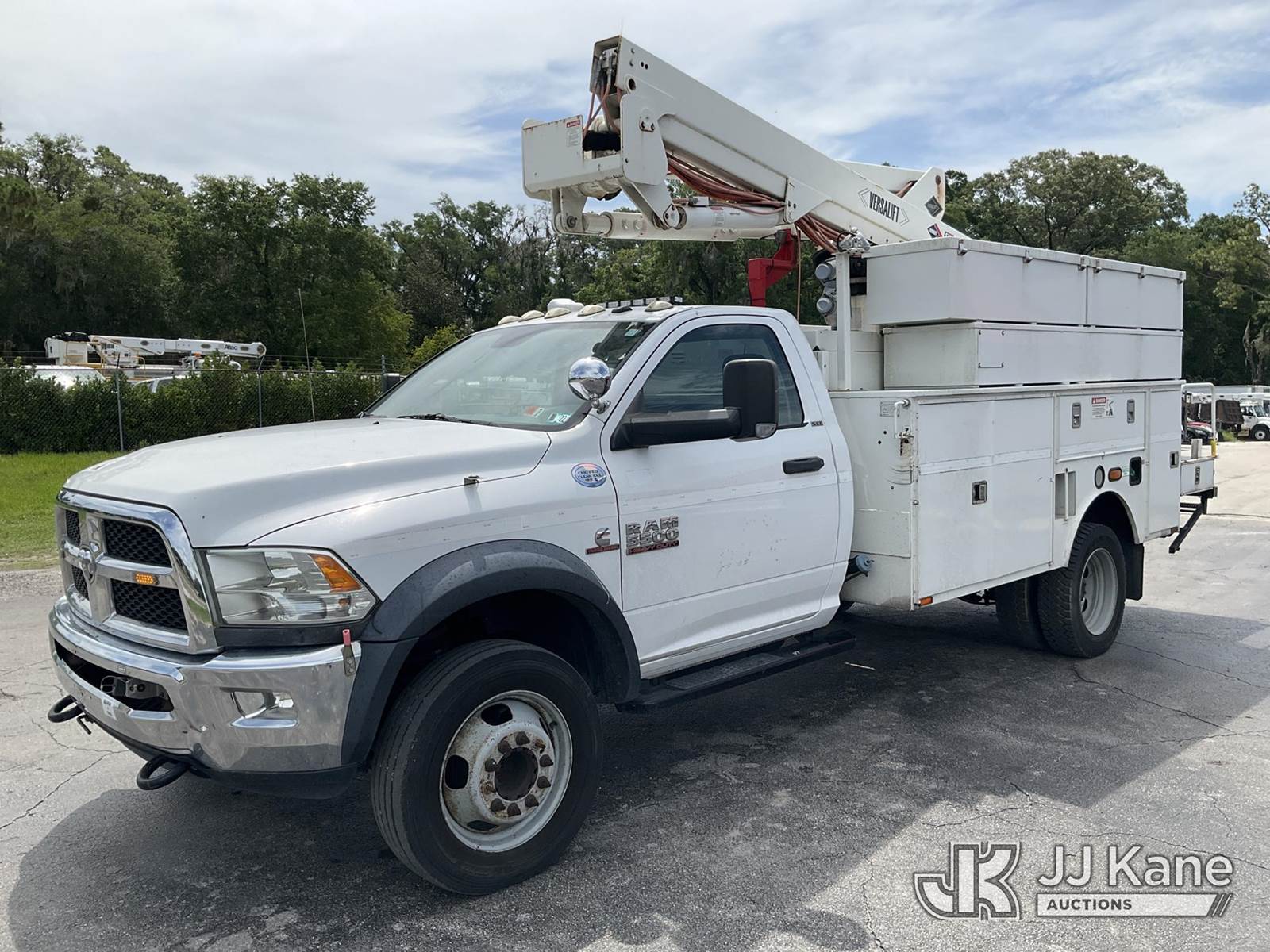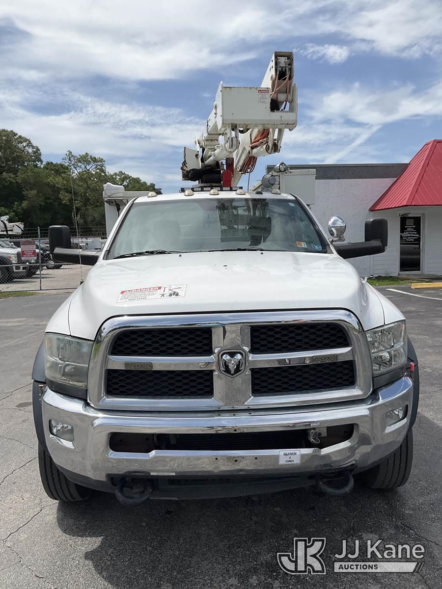 Versalift SST40EIH, 45 ft, Articulating & Telescopic Bucket Truck s/n EH 140186, with single man bucket, mounted behind cab on 2014 Dodge 5500 4x4 Service Truck, Cummins 6.7L diesel, Auto, A/C, (203,957 miles) (Runs & Moves) (PTO Not Working Upper Unit Condition Unknown, Minor Body And Paint Damage, ABS Light On) This is a Titled Item NOTE: This unit is being sold AS IS/WHERE IS via Timed Auction and is located in Ocala, FL. Inspection & preview days for this unit are by appointment only; please contact us at contact@jjkane.com or 84-Go-JJKane for more details. For more information & removal arrangements please contact Mike Lessard @ (352) 629-6677. (Missing manuals, See Auction Company for Manufacturers Information to obtain manuals) (Buyer is responsible for removal. Assistance by consignor or JJ Kane Auctions is not assured.)