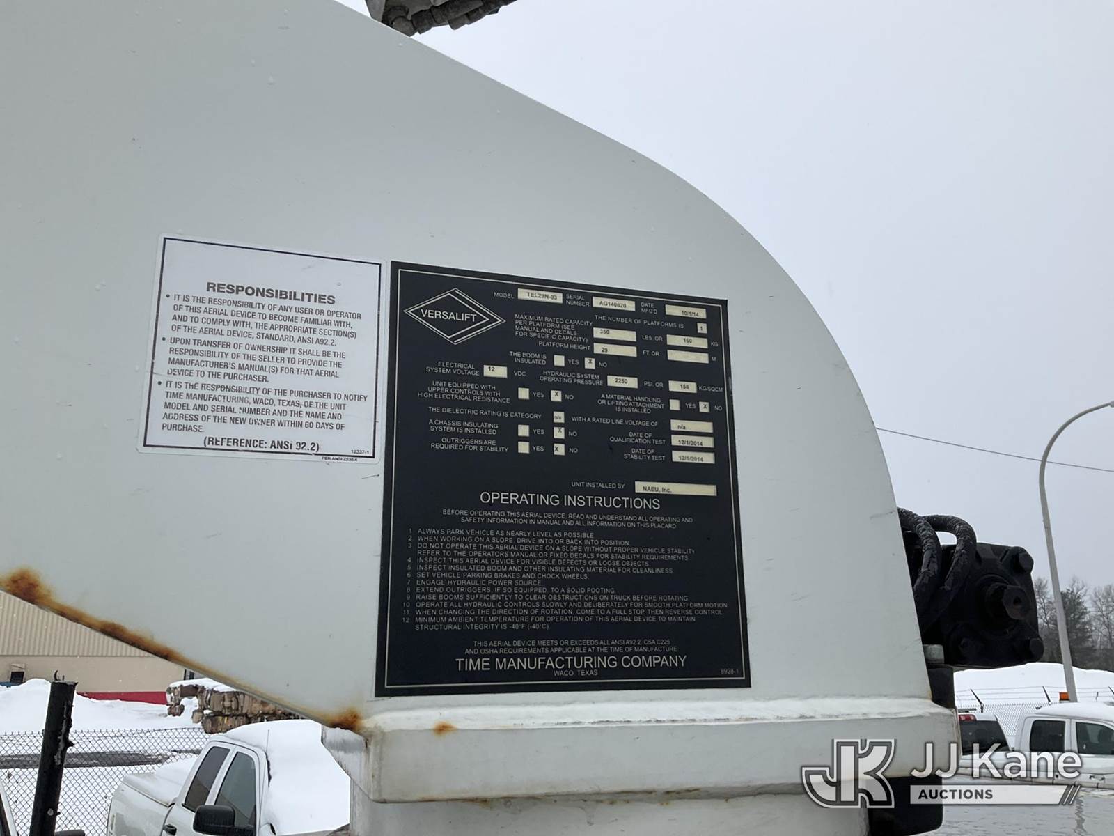 Versalift TEL29N-03, 34 ft, Telescopic Non-Insulated Bucket Truck s/n AG140820, with Single Man Bucket , mounted behind cab on 2014 RAM 4500 2WD Service Truck, 8-cyl gas, Auto, A/C, (119,805 miles) (Runs, Moves & Upper Operates, Check Engine Light On, Seller States: Overheats, Bad Heads, Jump to Start, Must Tow) This is a Titled Item NOTE: This unit is being sold AS IS/WHERE IS via Timed Auction and is located in Rome, NY. Inspection & preview days for this unit are the 2 business days prior to the first day of items closing for this auction, item is located at 5835 Success Dr Rome, NY 13440 and hours of operations are 8a-4p. For pre-sale questions, please contact Ryan Jackson @ (315) 749-3790 or Ryan.Jackson@jjkane.com. (Manuals provided in cab) (Buyer is responsible for removal. Assistance by consignor or JJ Kane Auctions is not assured.)