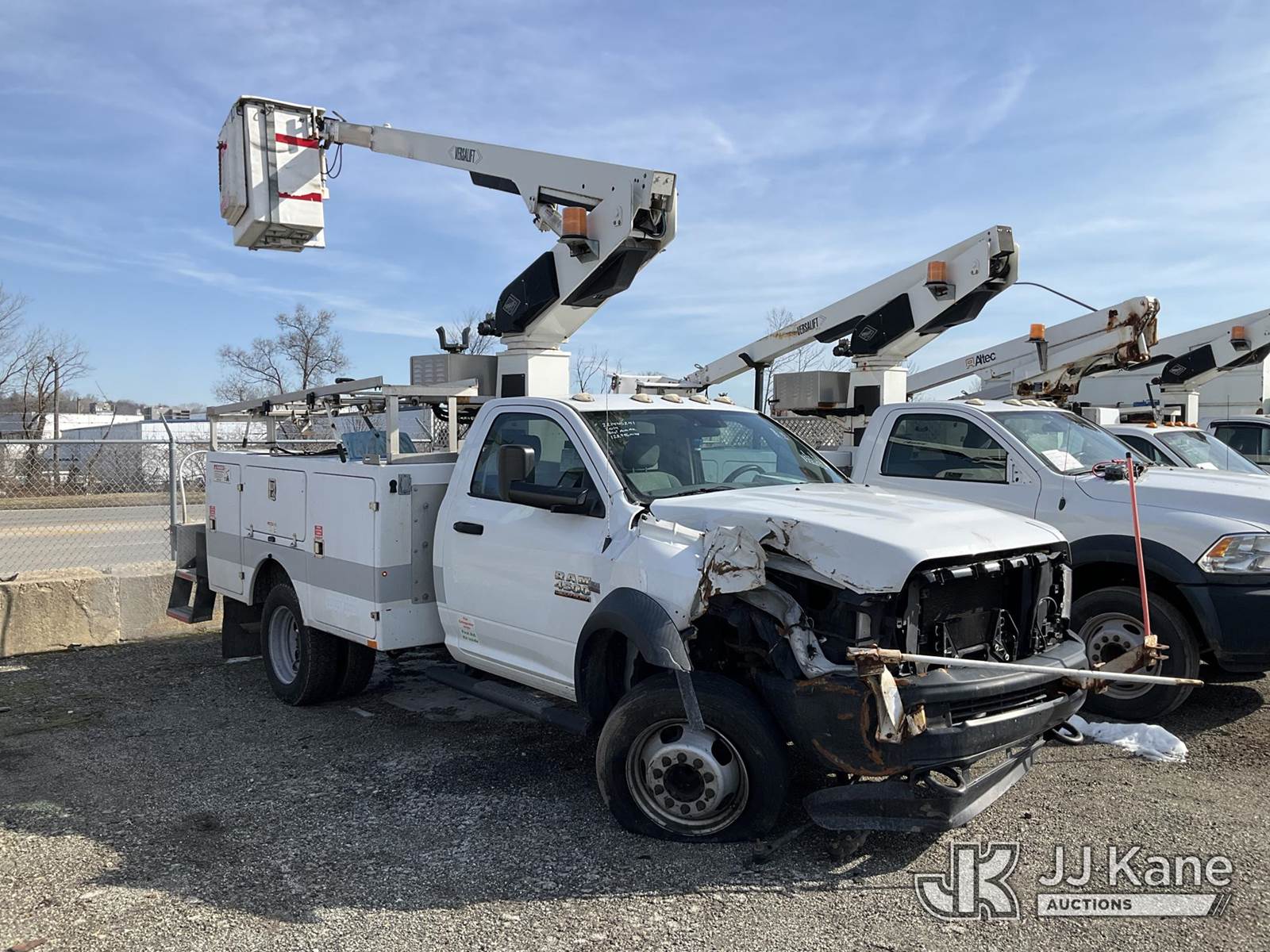 Versalift TEL29N03, 34 ft, Telescopic Non-Insulated Bucket Truck s/n AG140257, with single-man bucket, mounted behind cab on 2014 RAM 4500 Service Truck, 8-cyl gas, Auto, A/C, (128,996 miles) (Wrecked, Jump To Start, Runs, Does Not Move, Upper Operates, ABS Light On, Traction Control Light On, Must Tow, Buyer Must Load, Driveshaft Disconnected) This is a Titled Item NOTE: This unit is being sold AS IS/WHERE IS via Timed Auction and is located in Plymouth Meeting, PA. Inspection & preview days for this unit are the 2 business days prior to the first day of items closing for this auction, item is located at 1402 Conshohocken Rd Plymouth Meeting, PA 19462 and hours of operations are 8a-4p. For pre-sale questions, please contact Bruce Thomas @ (267) 887-0392 or bruce.thomas.jr@jjkane.com. (Manuals provided in cab) (Buyer is responsible for removal. Assistance by consignor or JJ Kane Auctions is not assured.)