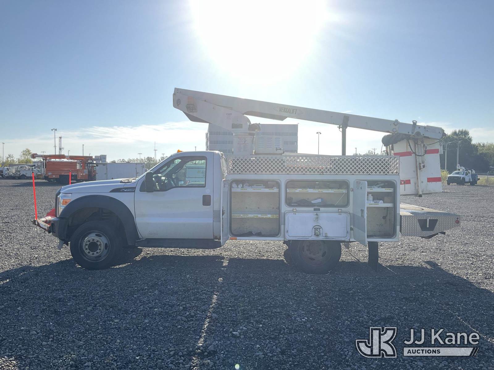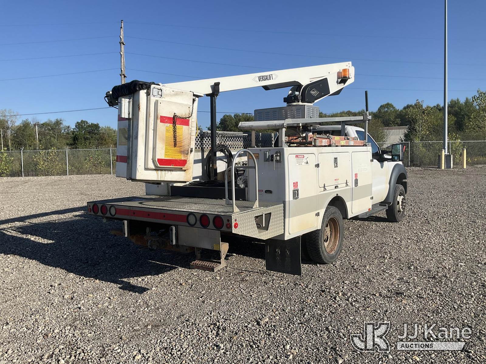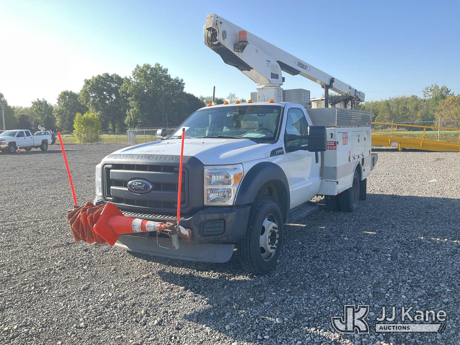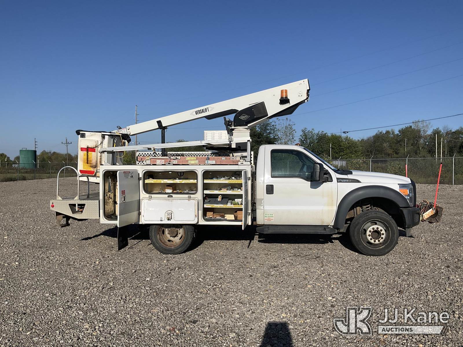Versalift TEL29NE, 34 ft, Telescopic Non-Insulated Bucket Truck s/n AG130872, with single-man bucket, mounted behind cab on 2014 Ford F-450 SD Service Truck, 6.8L V10 SOHC 30V Auto, RWD, Gas, with generator, (186,379 miles) (Runs & Moves, Generator Issue, Upper Operation Unknown, Interior Damage, Rust Damage. Seller Stats REMOVED FROM SERVICE DUE TO CORROSION, CAB CORNER, ROCKER PANELS, RAD SUPPORT AND REAR FRAME.) This is a Titled Item NOTE: This unit is being sold AS IS/WHERE IS via Timed Auction and is located in Louisville, OH. Inspection & preview days for this unit are the 2 business days prior to the first day of items closing for this auction, item is located at 3648 Beck Ave Louisville, OH 44641 and hours of operations are 8a-4p. For pre-sale questions, please contact Aaron Coleman @ (330) 495-4041 or aaron.coleman@jjkane.com. (Manuals provided in cab) (Buyer is responsible for removal. Assistance by consignor or JJ Kane Auctioneers is not assured.)