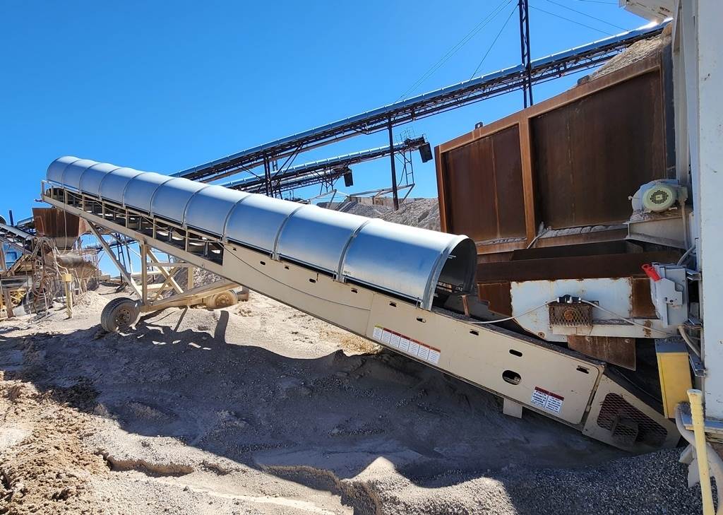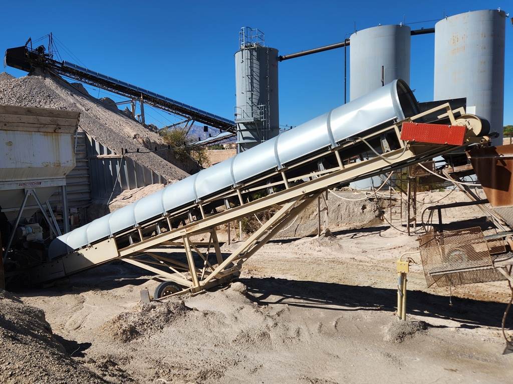 (1) – one – ACTECH 30” wide x 48’ long Radial Stockpiling Conveyor, stackable type truss frame construction, electric motor, V-belt drive & guard, shaft mounted gear reduction box, 5” diameter-35 degree trough idlers, rubber lagged head pulley with shaft and bearings, self-cleaning wing type tail pulley with shaft, bearings and screw take-ups, rubber conveyor belting, receiving hopper with adjustable rubber skirting, full length galvanized conveyor hood covers, single axle-single tire radial undercarriage with swivel hubs for portable or radial positions, manual radial movement, telescoping front support legs for incline adjustment. Used Equipment……Selling Price $ E-Mail or call for more information and pricing. Truck loading is included in the selling price. Condition: Good, low use hours. Running condition when shut down.