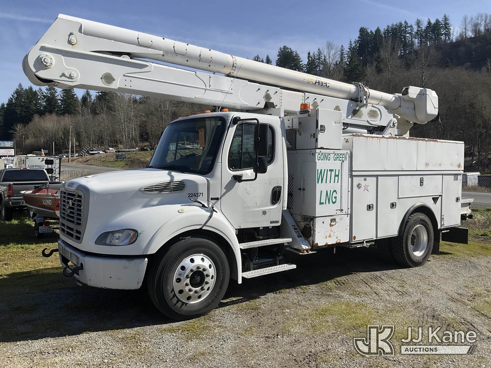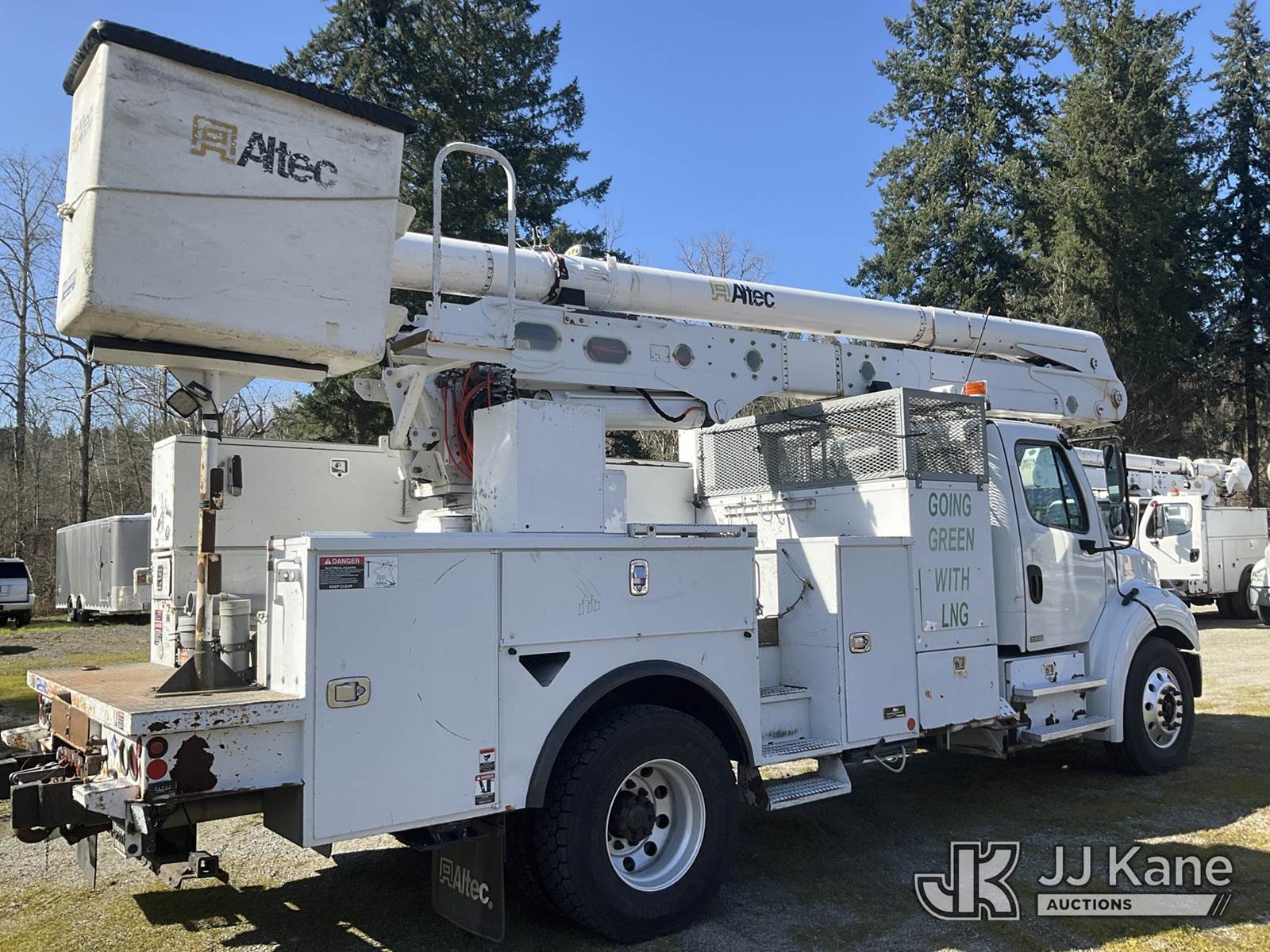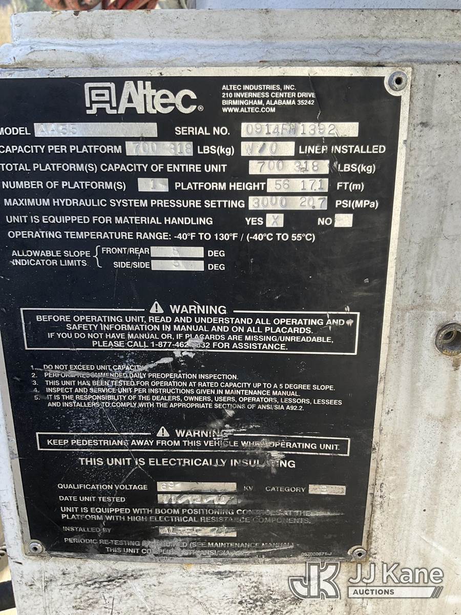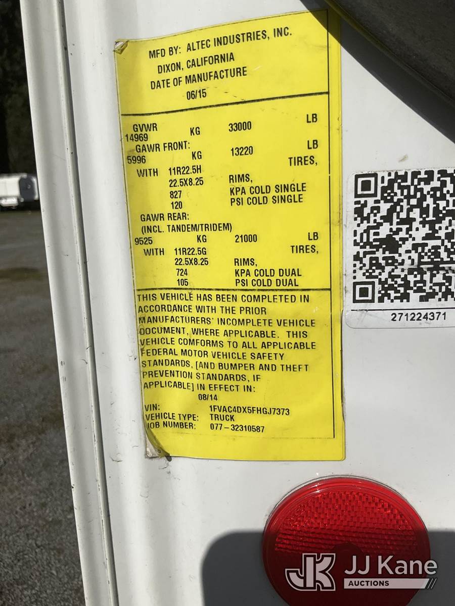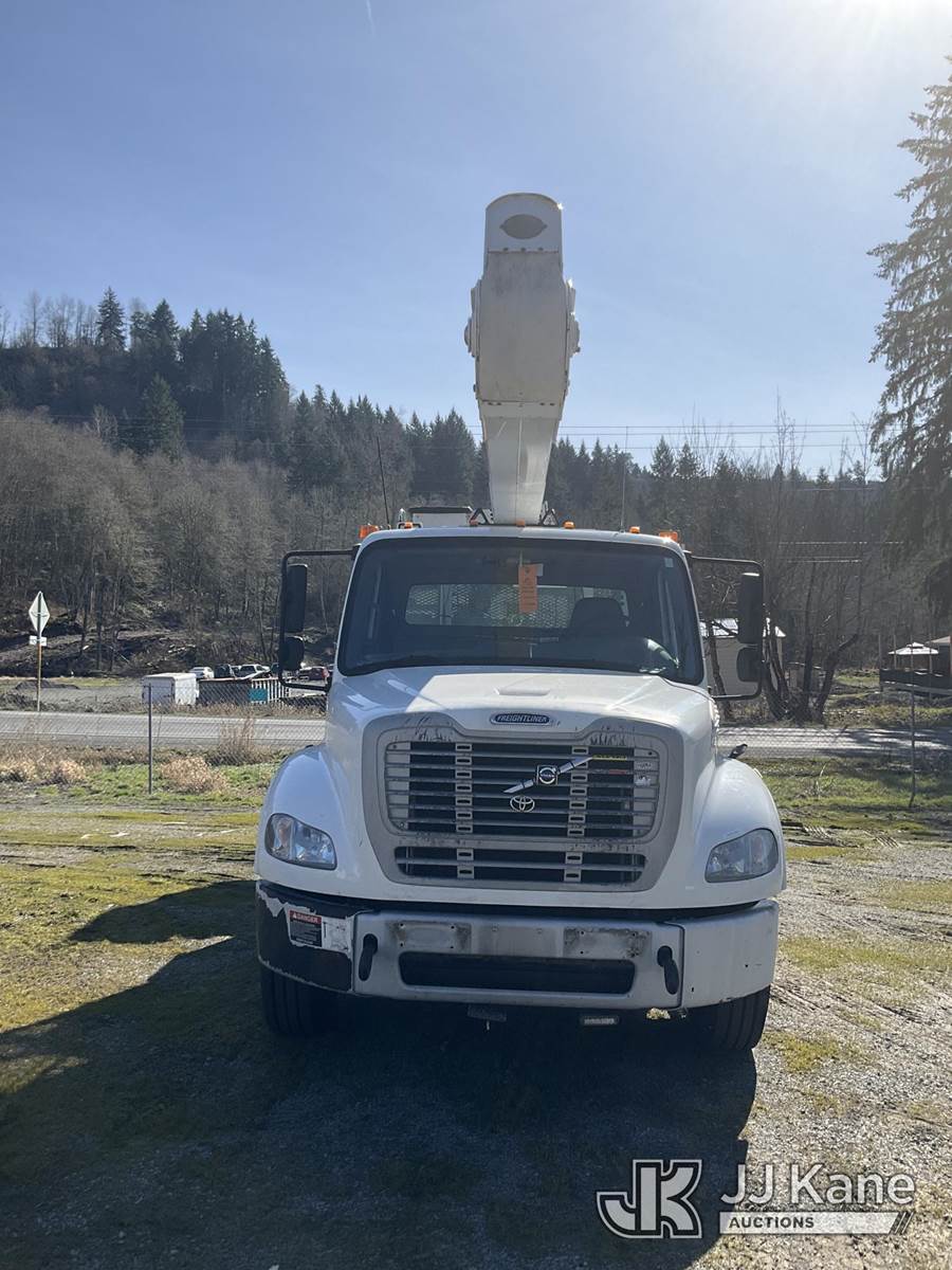 Altec AA55, 61 ft, Material Handling Bucket Truck s/n 0914FH1392, with two-man bucket & 4 hyd outriggers, rear mounted on 2015 Freightliner M2 112 Utility Truck, 8.9L LNG, 4X2, Auto, A/C, (118,196 miles) (Not Running, Condition Unknown) (Seller States: Possible oil leaks.) This is a Titled Item NOTE: This unit is being sold AS IS/WHERE IS via Timed Auction and is located in Eatonville, WA. Inspection & preview days for this unit are by appointment only; please contact us at contact@jjkane.com or 84-Go-JJKane for more details. (Missing manuals, See Auction Company for Manufacturers Information to obtain manuals) (Buyer is responsible for removal. Assistance by consignor or JJ Kane Auctions is not assured.)