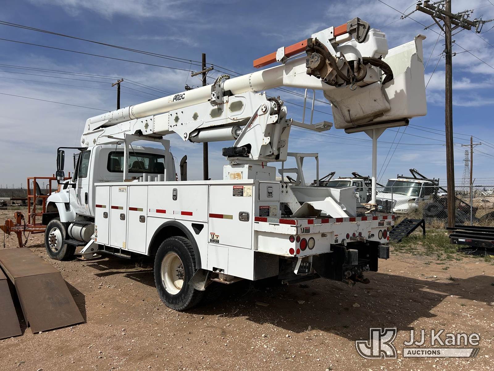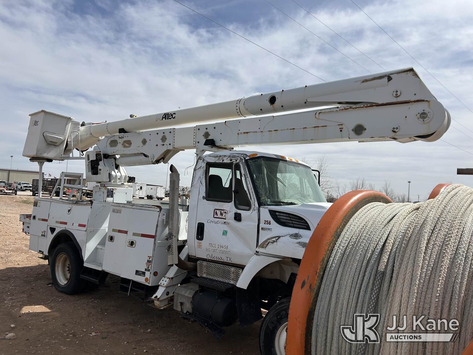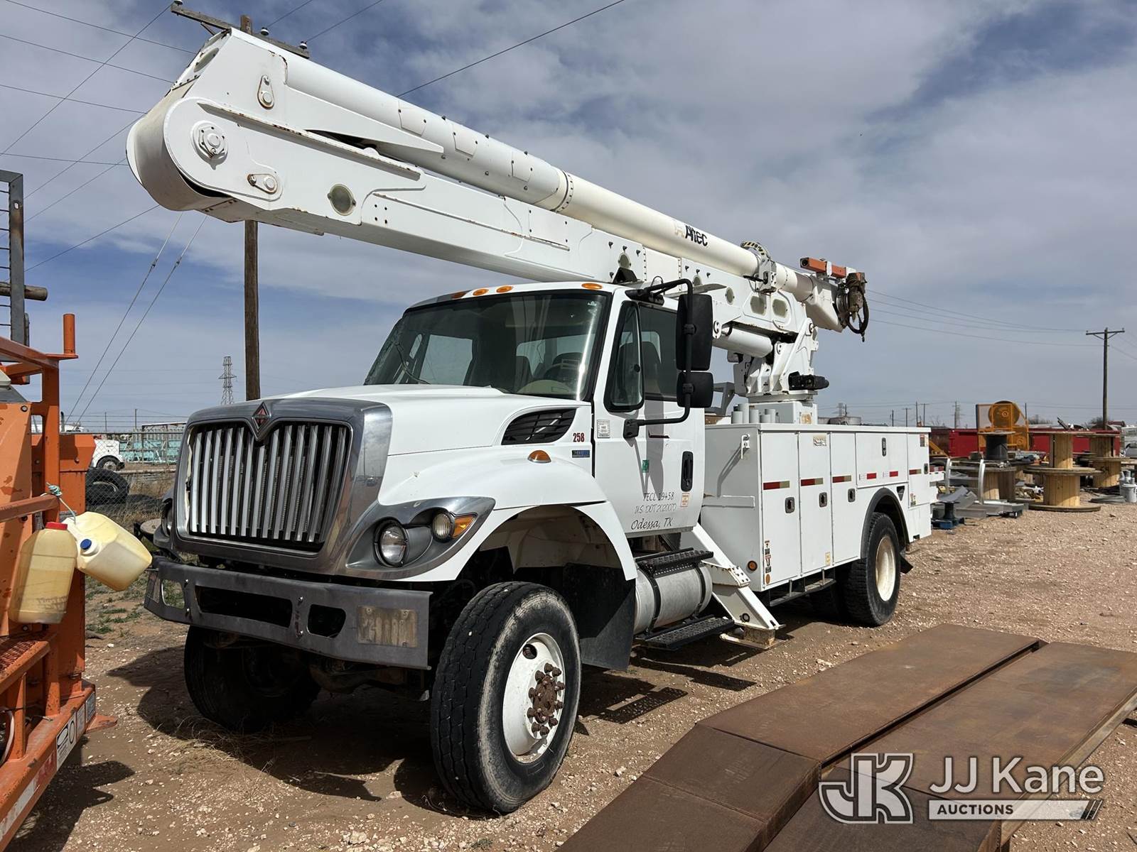 Altec AA55-MH, 61 ft, Material Handling Bucket Truck s/n 0414FH1063, with two-man bucket & 4 hyd outriggers, rear mounted on 2015 International 7300 Utility Truck, 7.6L L6 DIESEL 4X4, Auto, True Mileage Unknown (Not Running, Condition Unknown) This is a Titled Item NOTE: This unit is being sold AS IS/WHERE IS via Timed Auction and is located in Odessa, TX. For more information & removal arrangements please contact Jordan Bane @ (769) 231-2679 (Missing manuals, See Auction Company for Manufacturers Information to obtain manuals) (Buyer is responsible for removal. Assistance by consignor or JJ Kane Auctions is not assured.)
