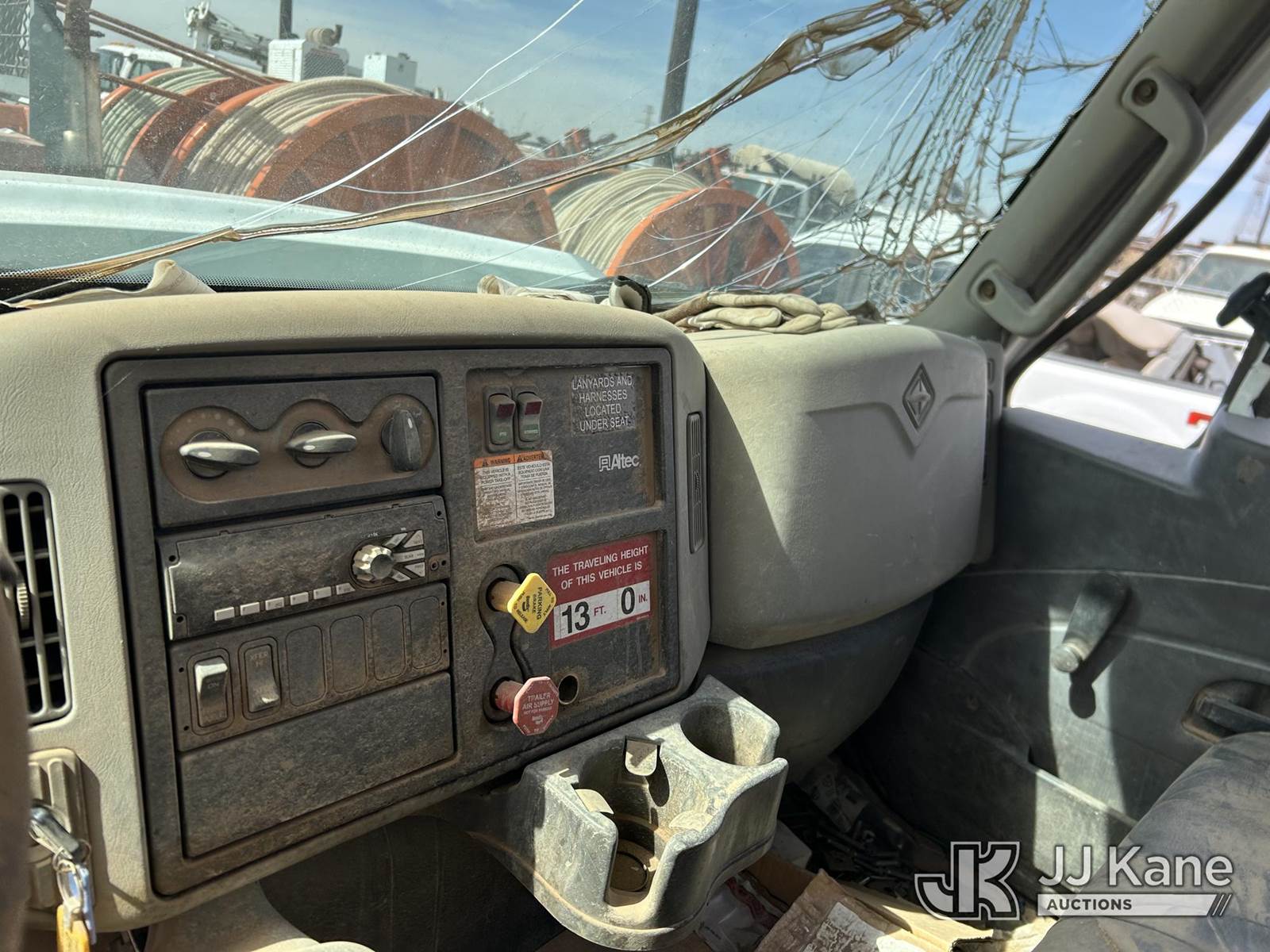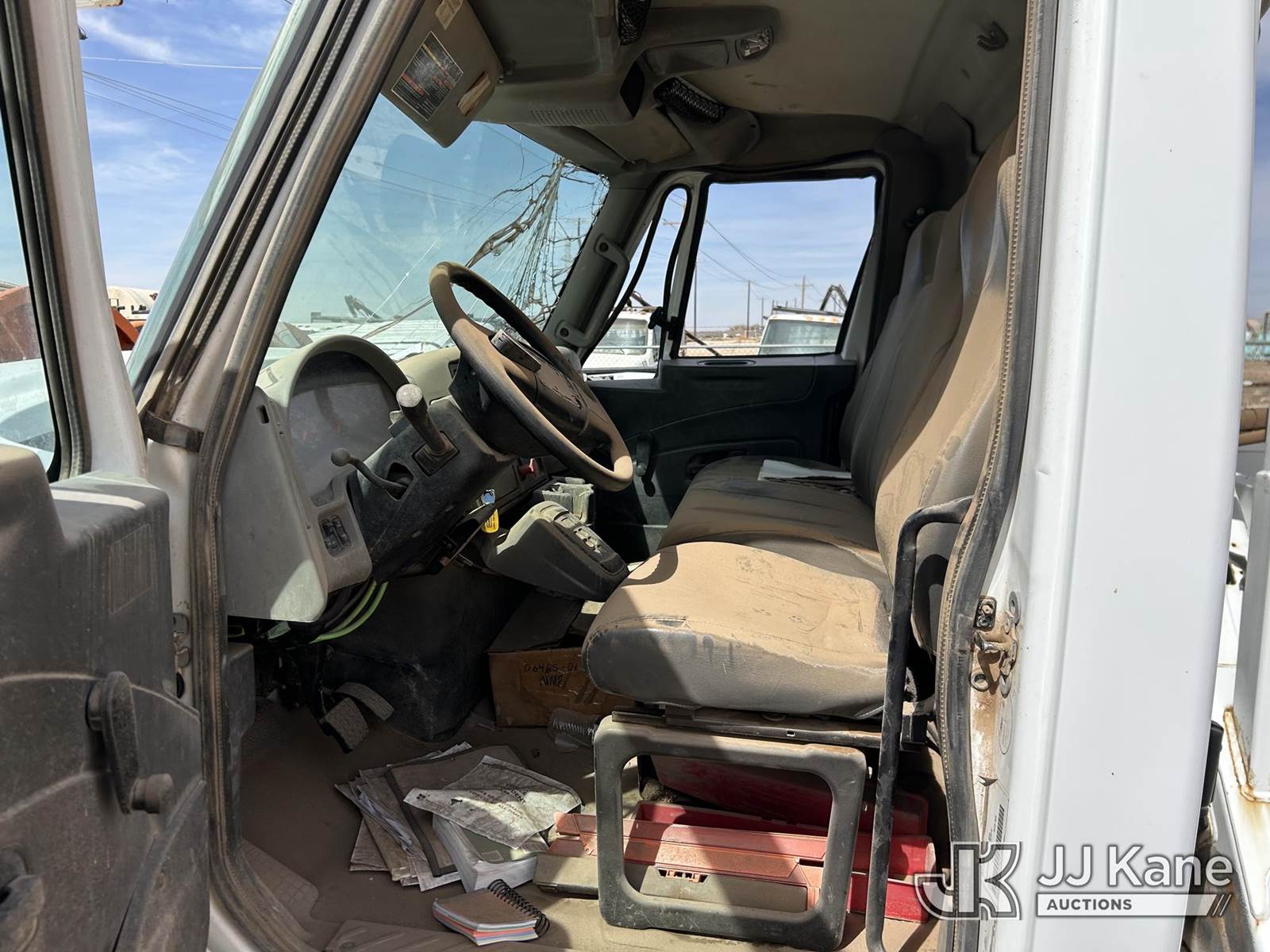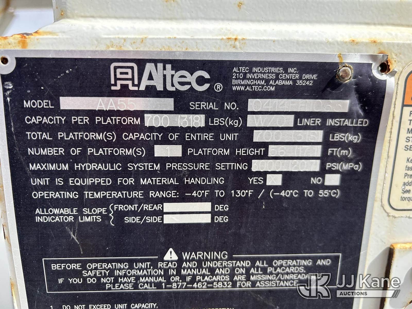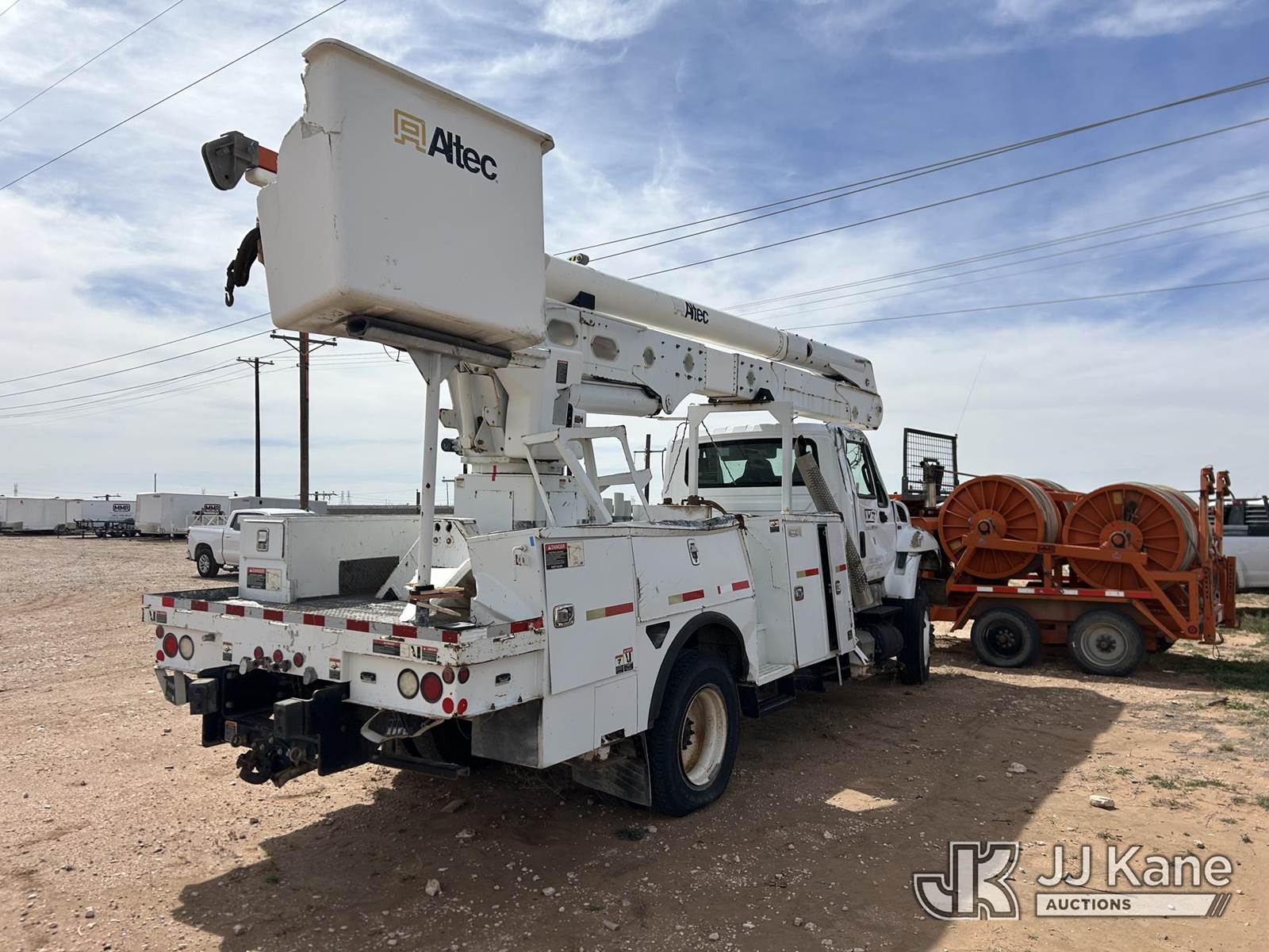 Altec AA55-MH, 61 ft, Material Handling Bucket Truck s/n 0414FH1063, with two-man bucket & 4 hyd outriggers, rear mounted on 2015 International 7300 Utility Truck, 7.6L L6 DIESEL 4X4, Auto, True Mileage Unknown (Not Running, Condition Unknown) This is a Titled Item NOTE: This unit is being sold AS IS/WHERE IS via Timed Auction and is located in Odessa, TX. For more information & removal arrangements please contact Jordan Bane @ (769) 231-2679 (Missing manuals, See Auction Company for Manufacturers Information to obtain manuals) (Buyer is responsible for removal. Assistance by consignor or JJ Kane Auctions is not assured.)