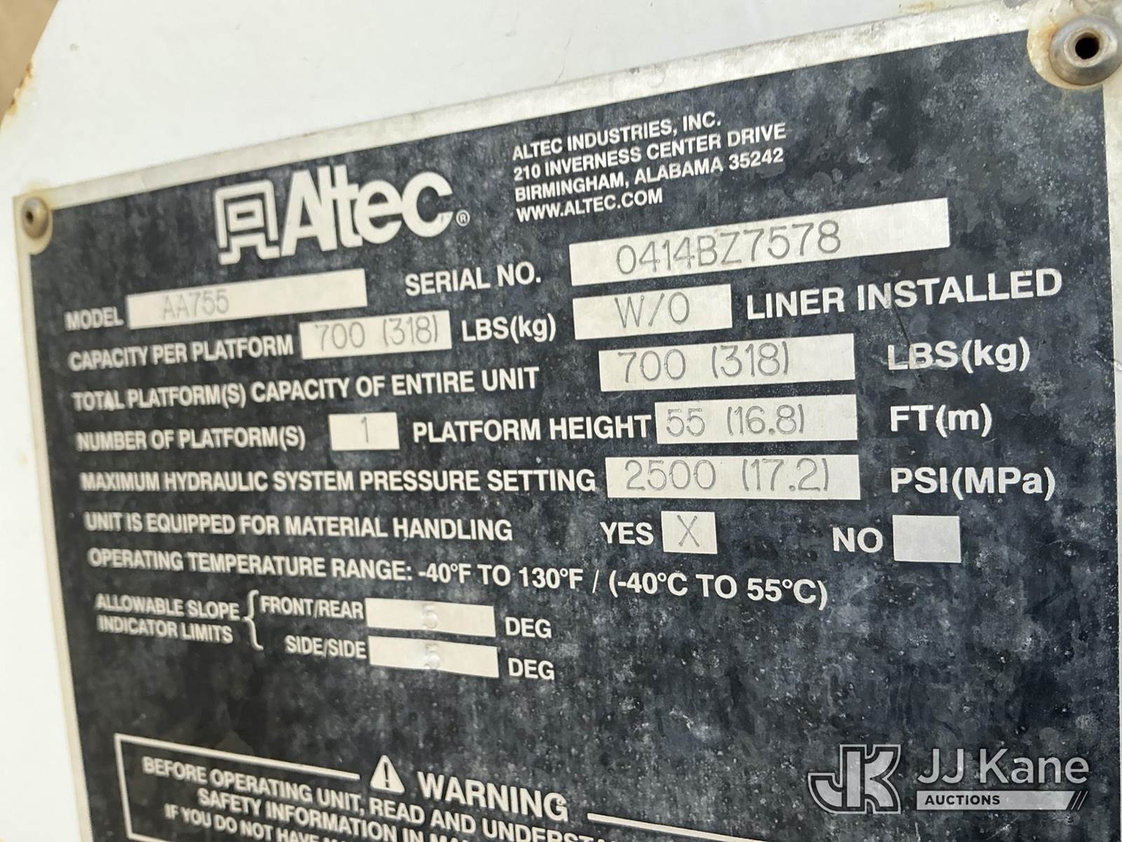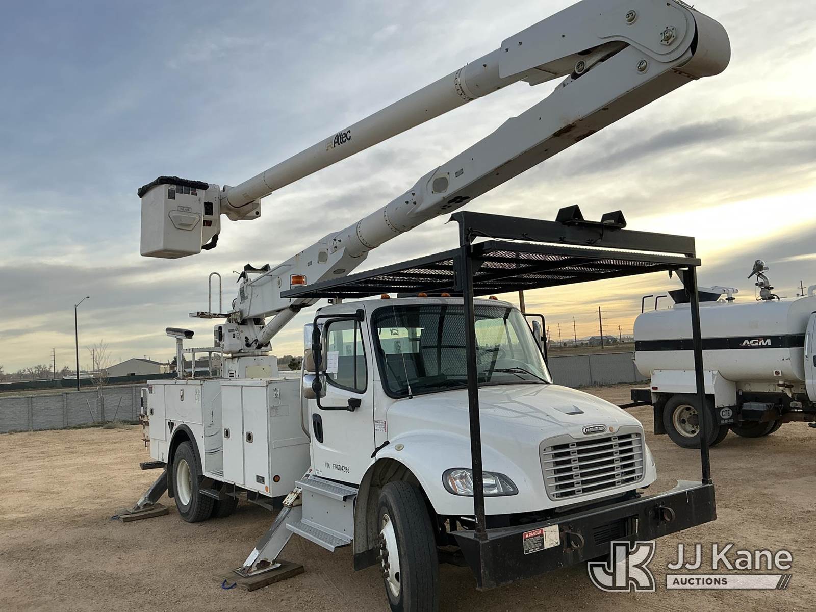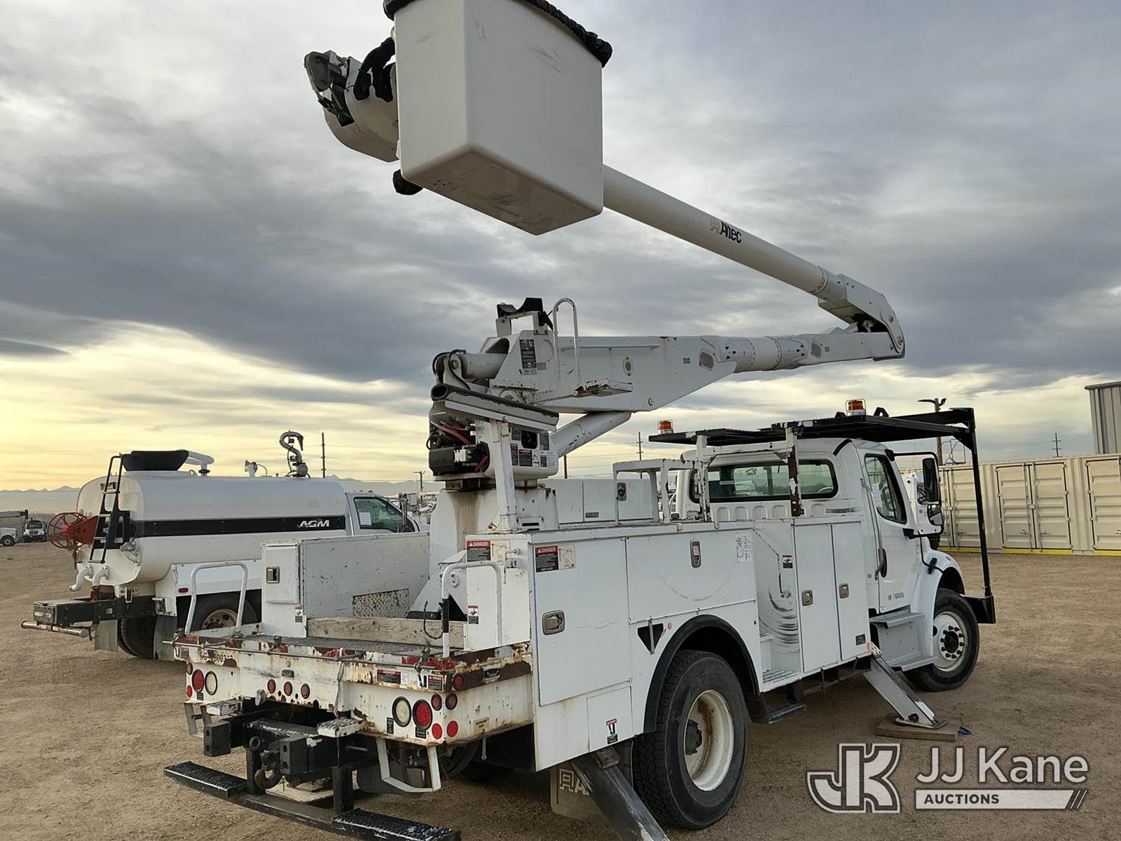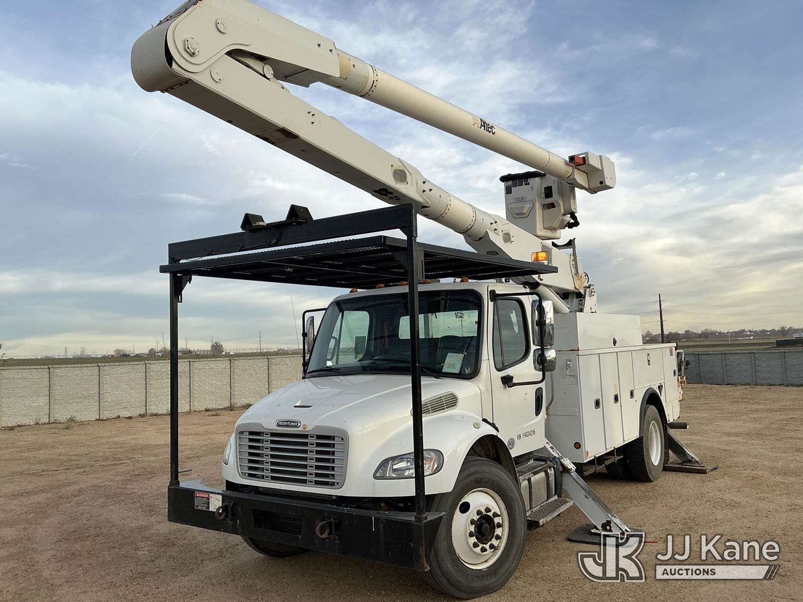 Altec AA755-MH, 60 ft, Material Handling Bucket s/n 0414BZ7578, with Two Man Bucket, 4 Hydraulic Outriggers, rear mounted on 2015 FREIGHTLINER M2-106 Utility Truck, 6.7L diesel 6-spd, A/C, (104,525 miles) (Runs, Move & Upper Operates) (Jump To Start) (NO EMISSIONS TEST PROVIDED SEE BIDDER AGREEMENT) (Reads 5,761 hours) This is a Titled Item NOTE: This unit is being sold AS IS/WHERE IS via Timed Auction and is located in Fort Lupton, CO. Inspection & preview days for this unit are the 2 business days prior to the first day of items closing for this auction, item is located at 2105 Northland Dr Fort Lupton, CO 80621 and hours of operations are 8a-4p. For pre-sale questions, please contact Dakota Hoffman @ (720) 621-0786. Dealer License Number 47109. (Manuals provided in cab) (Buyer is responsible for removal. Assistance by consignor or JJ Kane Auctioneers is not assured.)