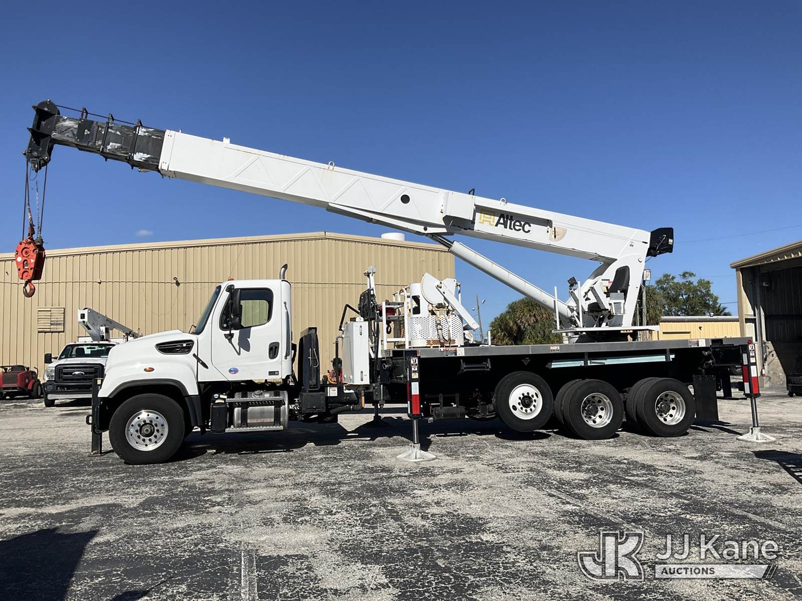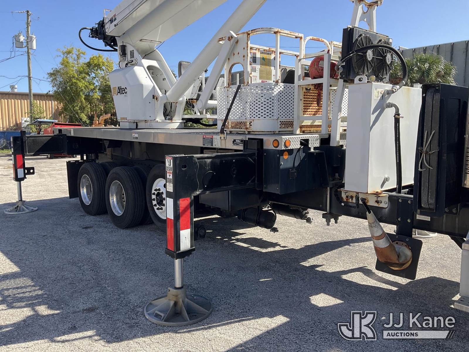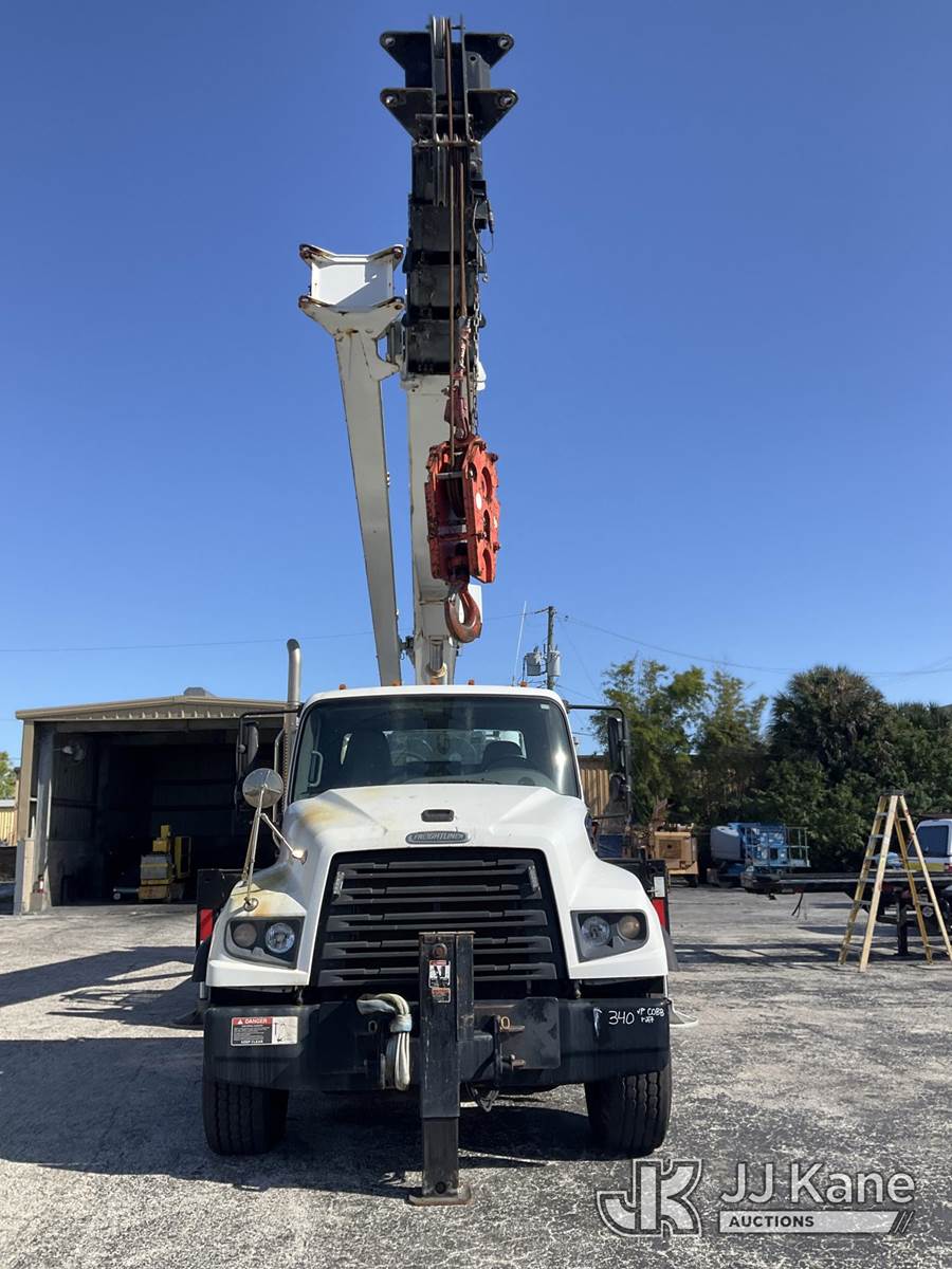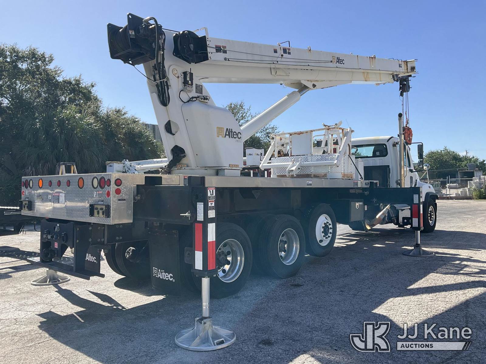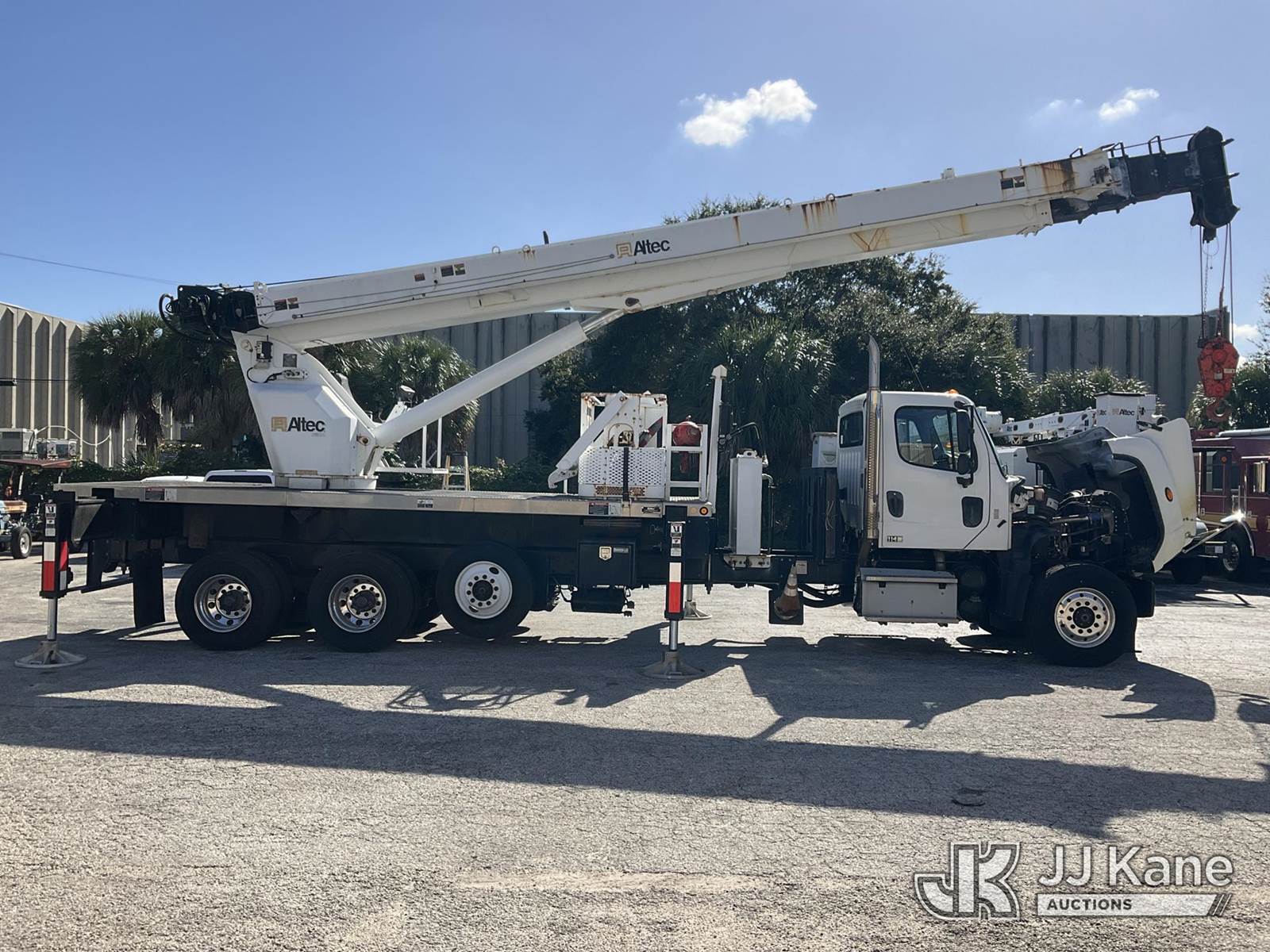 Altec AC38-127S, 38-Ton, Hydraulic Crane s/n 1014EG1253, with 192 ft. sheave height, 31 ft. to 127 ft. of 5 section hyd boom, 31 ft. to 55 ft. 2 section telescopic swing away jib, McKissick 7 ton overhaul ball, McKissick 20 ton double sheave hook block, anti-two-block, Altec LMAP, remote, man basket, riding console & 5 hyd outriggers, rear mounted on 2015 Freightliner 114SD 8X4 Tri-Drive Flatbed Truck, Cummins ISL 8.9L diesel, Auto, A/C, with air lift 3rd axle, A/R suspension & aluminum wheels, (2,840 miles) (Runs, Moves & Crane Operates)( Remote Inside Cab, Rust Areas On The Boom)((FL Residents Purchasing Titled Items - tax, title & registration fees will be collected at the maximum rate of $400.00 under 25,999 and $800.00 for Over 26,000 and $250.00 trailers - Proof of insurance is mandatory; Out of State Residents Purchasing Title Items - tax will be collected based upon your state rate.) (Reads 666 hours) This is a Titled Item NOTE: This unit is being sold AS IS/WHERE IS via Timed Auction and is located in West Palm Beach, FL. For Pick Up & Removal information, please contact: Andy Garcia @ 561-215-0085. Removals require 24-hr Notice by Appointment Only, Buyer/Hauler must present copy of Paid-in-Full JJ Kane Release Form upon arrival. Purchaser acknowledges ALL lots must be removed within 10 business days of Auction, or a towing & storage fee may be incurred. (Manuals provided in cab) (Buyer is responsible for removal. Assistance by consignor or JJ Kane Auctions is not assured.)