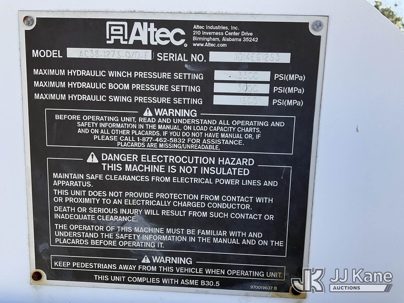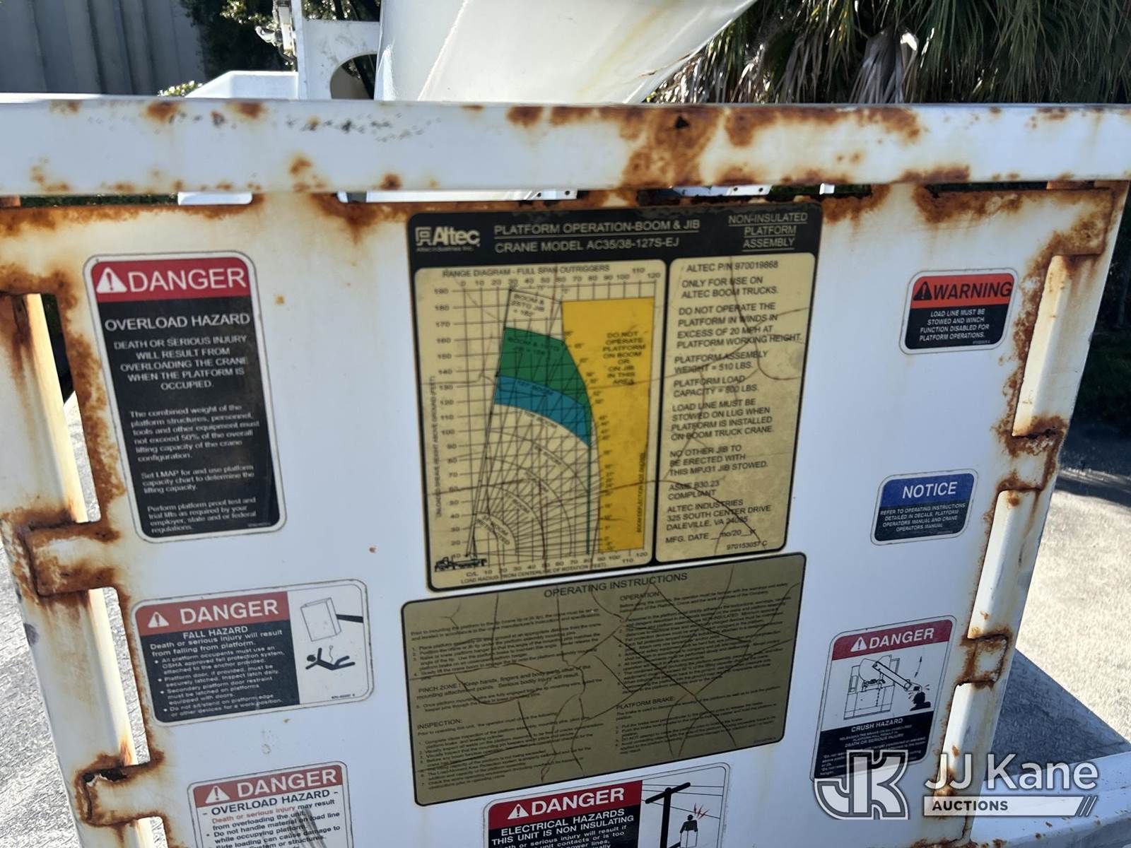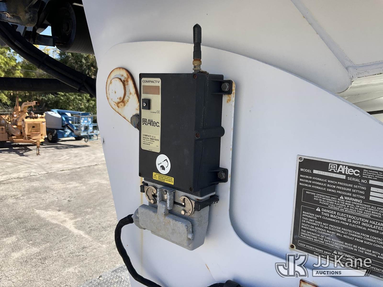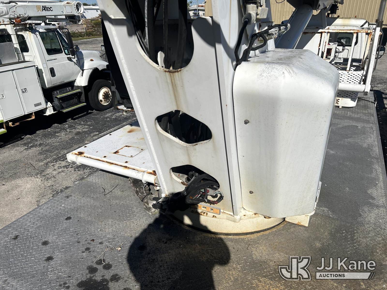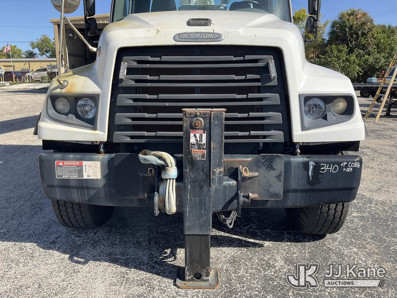 Altec AC38-127S, 38-Ton, Hydraulic Crane s/n 1014EG1253, with 192 ft. sheave height, 31 ft. to 127 ft. of 5 section hyd boom, 31 ft. to 55 ft. 2 section telescopic swing away jib, McKissick 7 ton overhaul ball, McKissick 20 ton double sheave hook block, anti-two-block, Altec LMAP, remote, man basket, riding console & 5 hyd outriggers, rear mounted on 2015 Freightliner 114SD 8X4 Tri-Drive Flatbed Truck, Cummins ISL 8.9L diesel, Auto, A/C, with air lift 3rd axle, A/R suspension & aluminum wheels, (2,840 miles) (Runs, Moves & Crane Operates)( Remote Inside Cab, Rust Areas On The Boom)((FL Residents Purchasing Titled Items - tax, title & registration fees will be collected at the maximum rate of $400.00 under 25,999 and $800.00 for Over 26,000 and $250.00 trailers - Proof of insurance is mandatory; Out of State Residents Purchasing Title Items - tax will be collected based upon your state rate.) (Reads 666 hours) This is a Titled Item NOTE: This unit is being sold AS IS/WHERE IS via Timed Auction and is located in West Palm Beach, FL. For Pick Up & Removal information, please contact: Andy Garcia @ 561-215-0085. Removals require 24-hr Notice by Appointment Only, Buyer/Hauler must present copy of Paid-in-Full JJ Kane Release Form upon arrival. Purchaser acknowledges ALL lots must be removed within 10 business days of Auction, or a towing & storage fee may be incurred. (Manuals provided in cab) (Buyer is responsible for removal. Assistance by consignor or JJ Kane Auctions is not assured.)