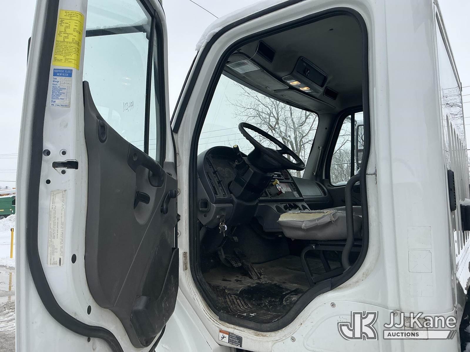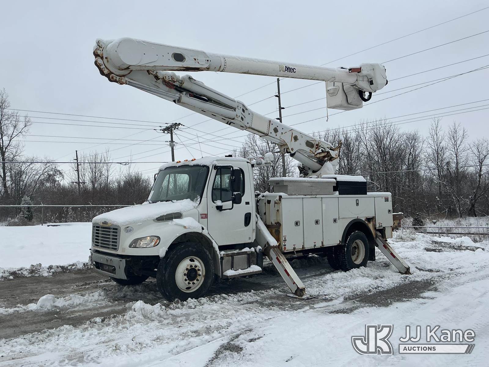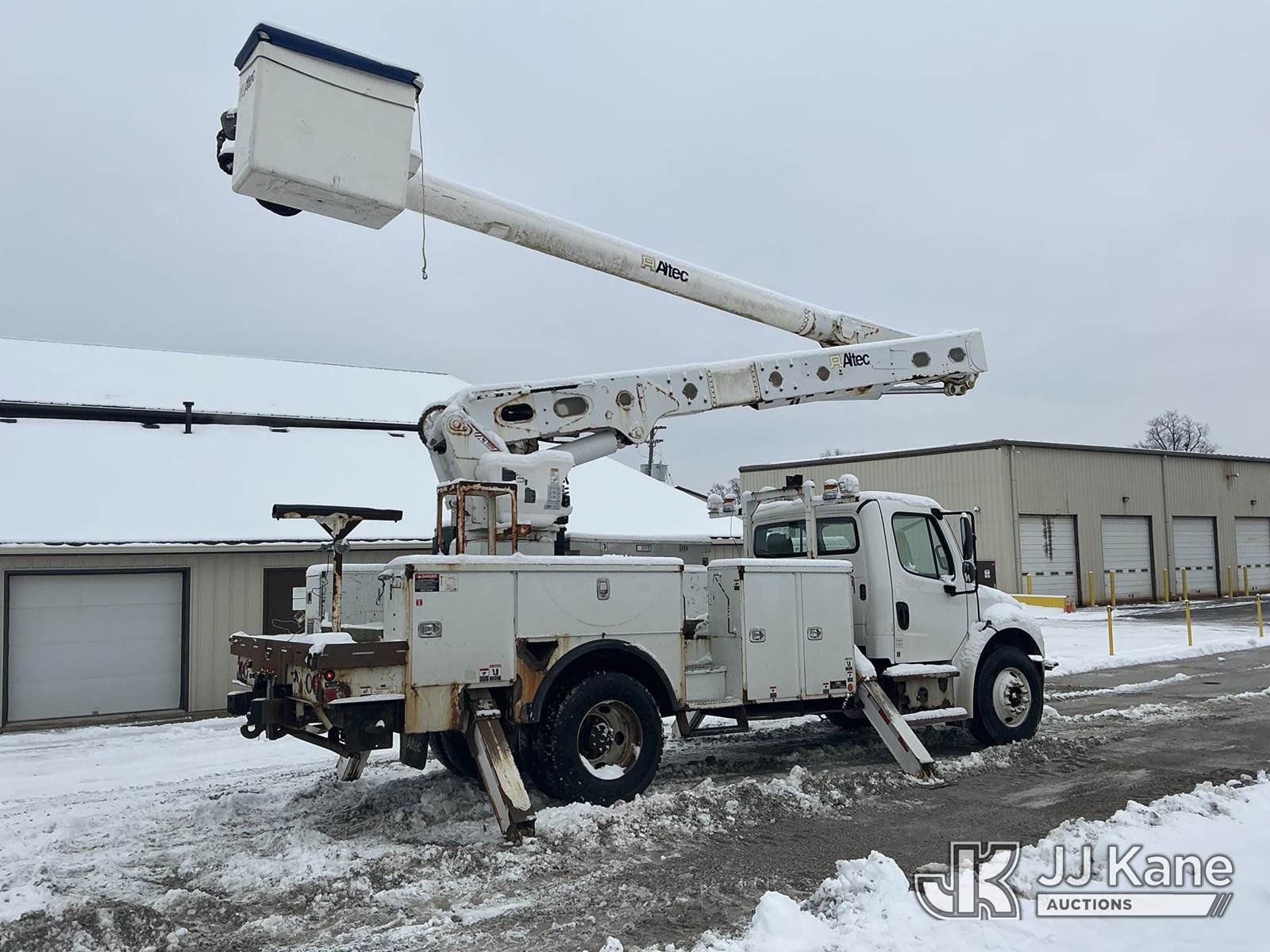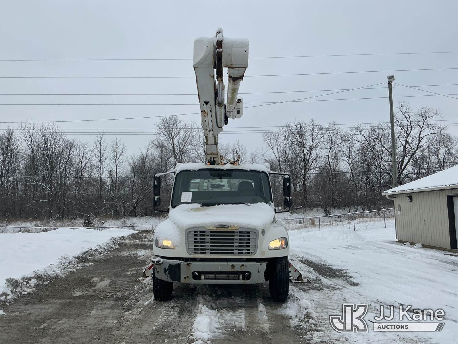 Altec AM55, 60 ft, Over-Center Material Handling Bucket Truck s/n 0914DM5338, with two-man bucket & 4 hyd outriggers, rear mounted on 2015 Freightliner M2 106 Utility Truck, 6.7L L6 diesel, Auto, 4X2, A/C, with capstan, (103,494 miles) (Runs, Moves & Upper Operates) (Check Engine Light On, Rust/Body Damage, Missing Upper Plate) (Reads 10,111 hours) This is a Titled Item NOTE: This unit is being sold AS IS/WHERE IS via Timed Auction and is located in Fort Wayne, IN. For more information & removal arrangements please contact Office Staff @ (260) 450-9822. Load out by appointment only, Buyer/Hauler must present copy of paid invoice upon arrival. Purchaser acknowledges ALL lots must be removed within (10) business days of Auction, or a storage fee may be incurred. For load out and pick up information, please reference the hauler sheet sent out after purchase. (Manuals provided in cab) (Buyer is responsible for removal. Assistance by consignor or JJ Kane Auctions is not assured.)