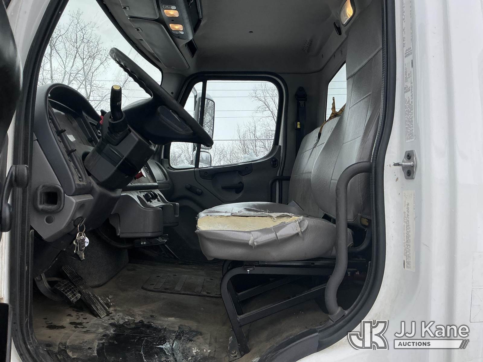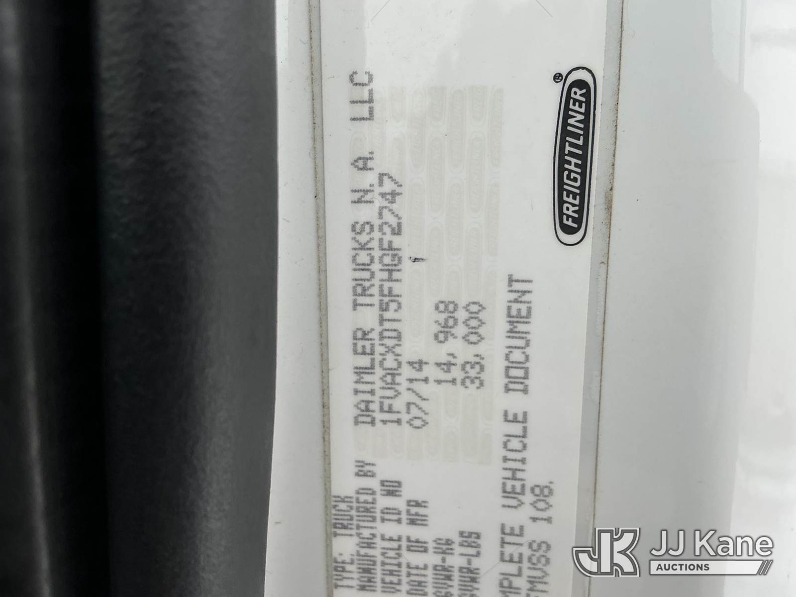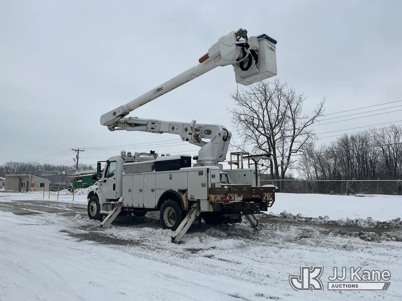 Altec AM55, 60 ft, Over-Center Material Handling Bucket Truck s/n 0914DM5338, with two-man bucket & 4 hyd outriggers, rear mounted on 2015 Freightliner M2 106 Utility Truck, 6.7L L6 diesel, Auto, 4X2, A/C, with capstan, (103,494 miles) (Runs, Moves & Upper Operates) (Check Engine Light On, Rust/Body Damage, Missing Upper Plate) (Reads 10,111 hours) This is a Titled Item NOTE: This unit is being sold AS IS/WHERE IS via Timed Auction and is located in Fort Wayne, IN. For more information & removal arrangements please contact Office Staff @ (260) 450-9822. Load out by appointment only, Buyer/Hauler must present copy of paid invoice upon arrival. Purchaser acknowledges ALL lots must be removed within (10) business days of Auction, or a storage fee may be incurred. For load out and pick up information, please reference the hauler sheet sent out after purchase. (Manuals provided in cab) (Buyer is responsible for removal. Assistance by consignor or JJ Kane Auctions is not assured.)