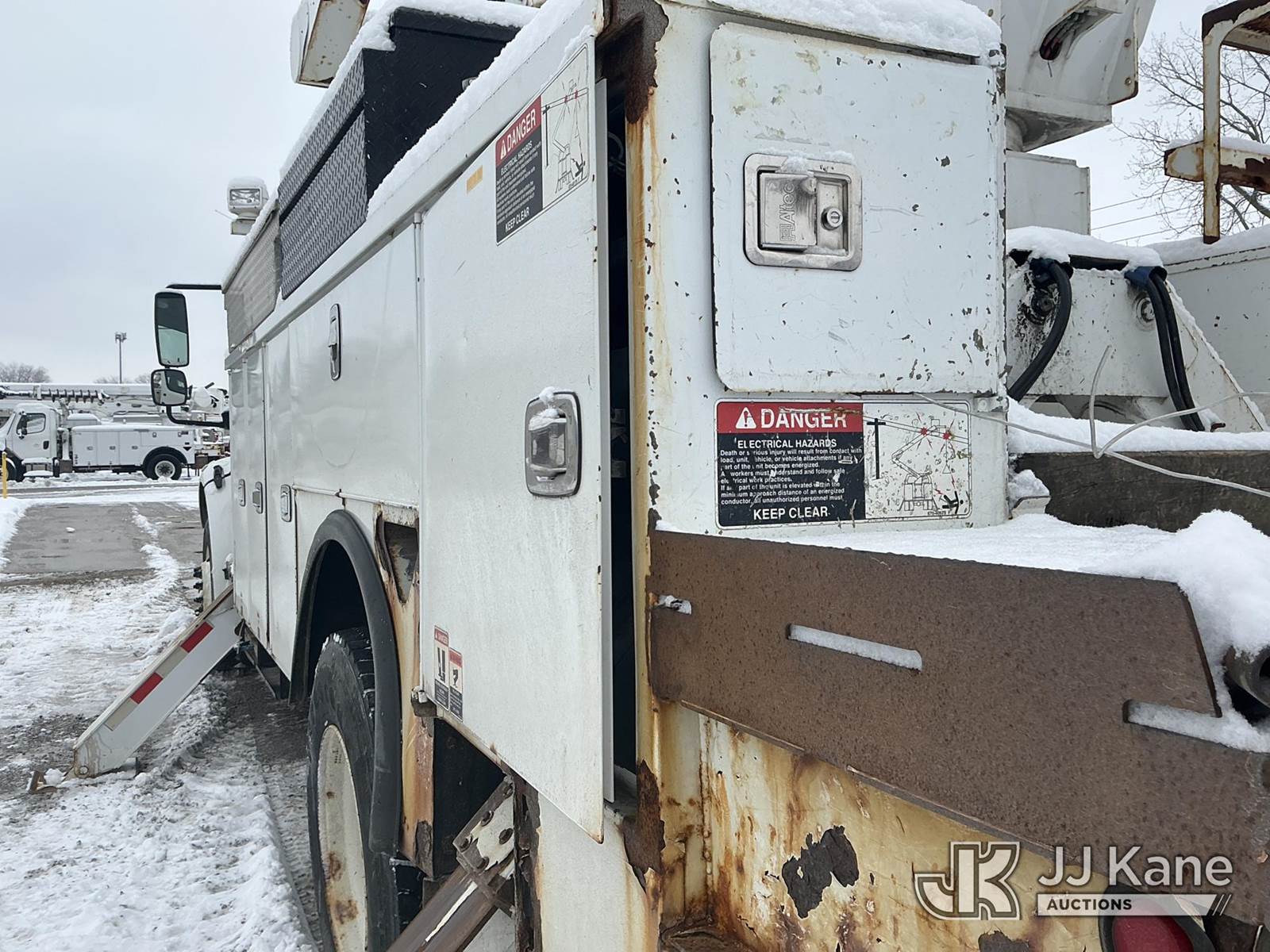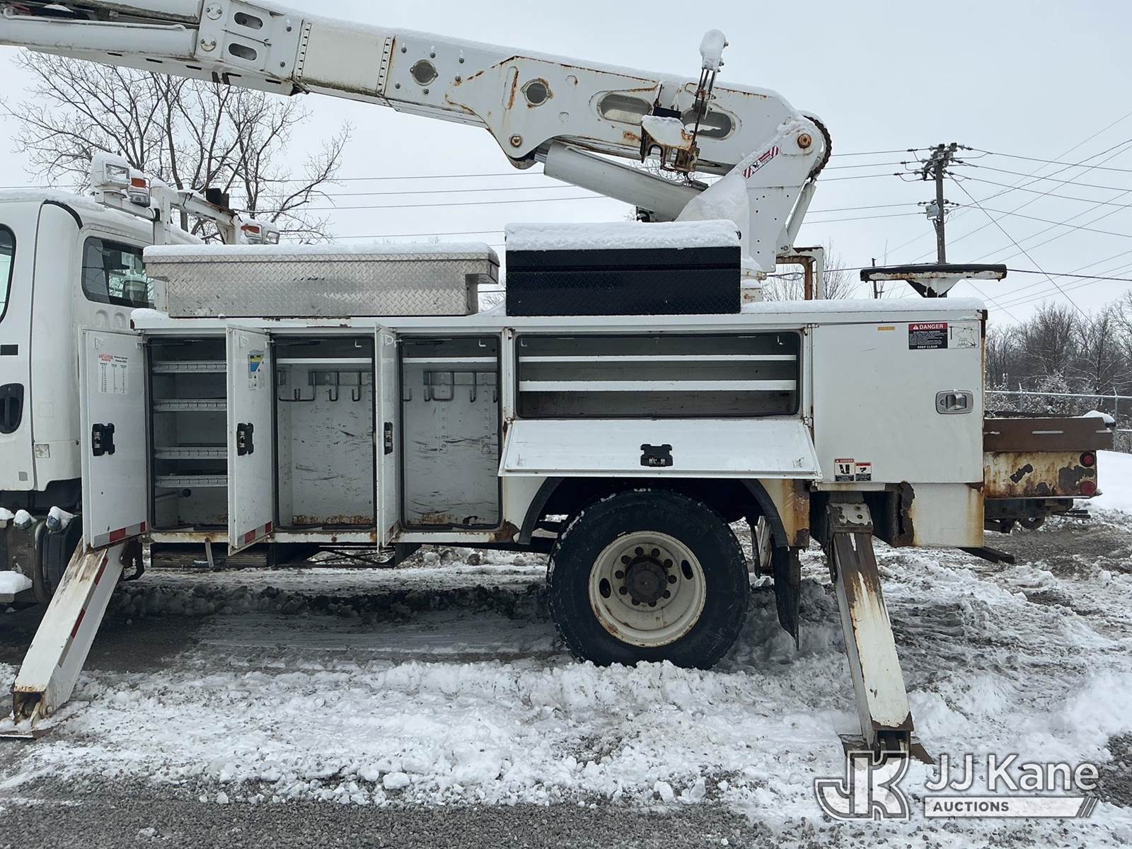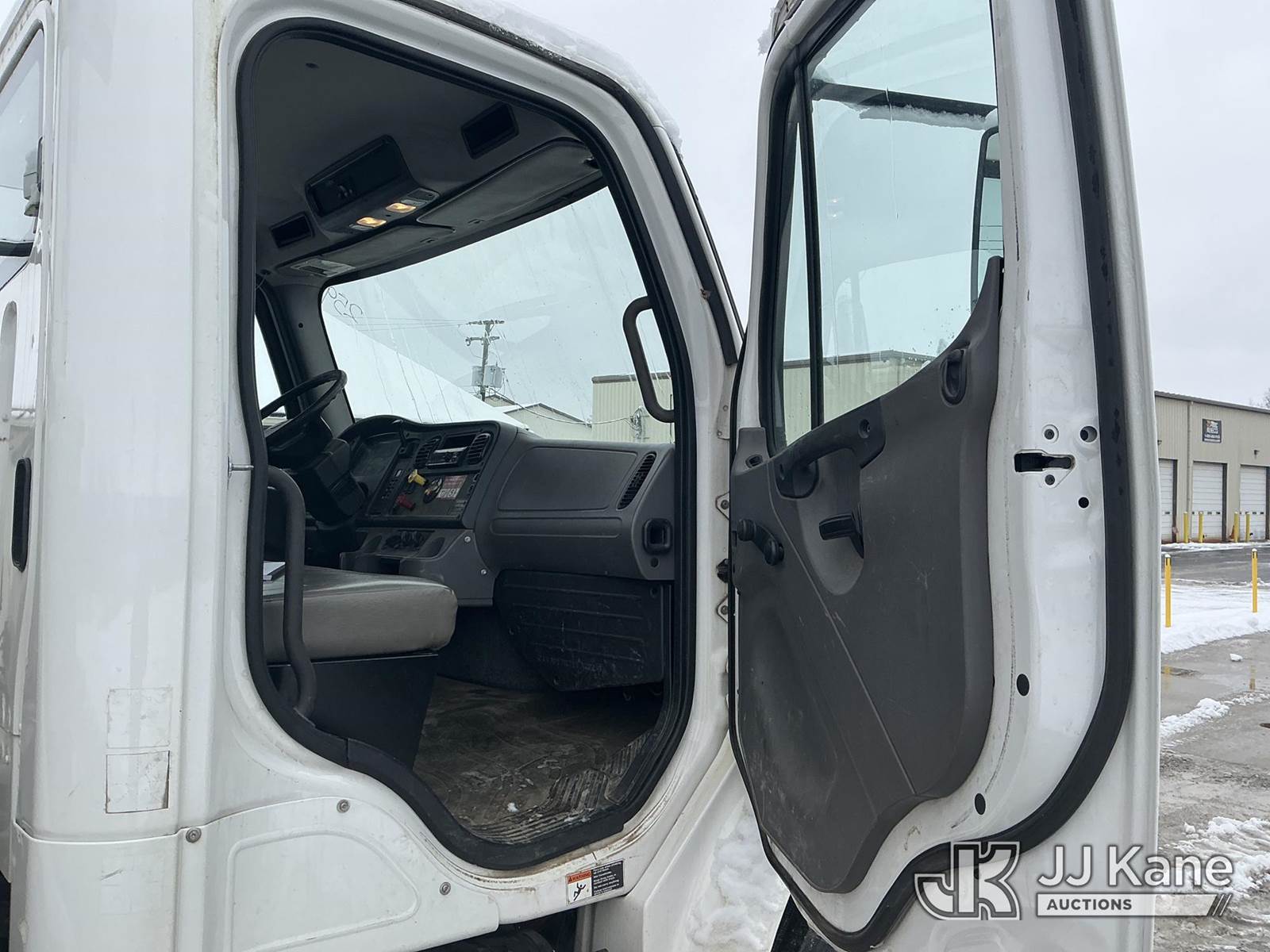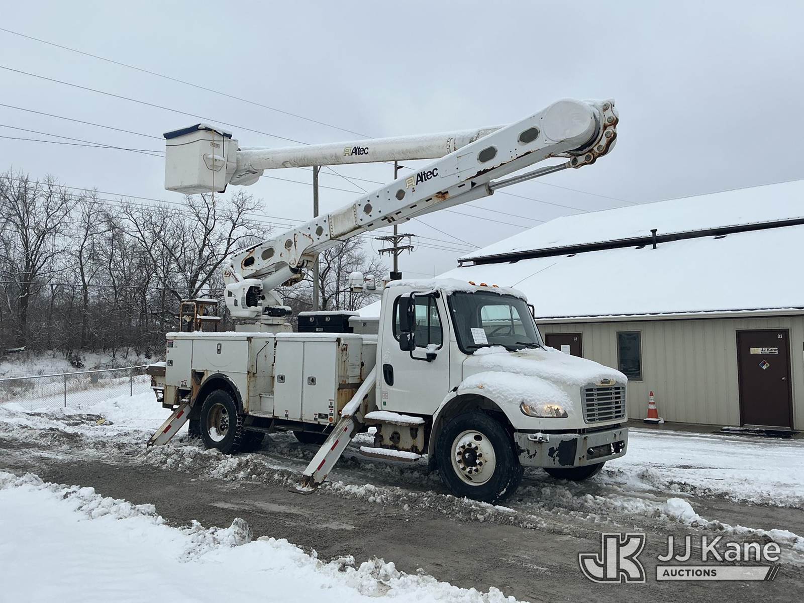 Altec AM55, 60 ft, Over-Center Material Handling Bucket Truck s/n 0914DM5338, with two-man bucket & 4 hyd outriggers, rear mounted on 2015 Freightliner M2 106 Utility Truck, 6.7L L6 diesel, Auto, 4X2, A/C, with capstan, (103,494 miles) (Runs, Moves & Upper Operates) (Check Engine Light On, Rust/Body Damage, Missing Upper Plate) (Reads 10,111 hours) This is a Titled Item NOTE: This unit is being sold AS IS/WHERE IS via Timed Auction and is located in Fort Wayne, IN. For more information & removal arrangements please contact Office Staff @ (260) 450-9822. Load out by appointment only, Buyer/Hauler must present copy of paid invoice upon arrival. Purchaser acknowledges ALL lots must be removed within (10) business days of Auction, or a storage fee may be incurred. For load out and pick up information, please reference the hauler sheet sent out after purchase. (Manuals provided in cab) (Buyer is responsible for removal. Assistance by consignor or JJ Kane Auctions is not assured.)