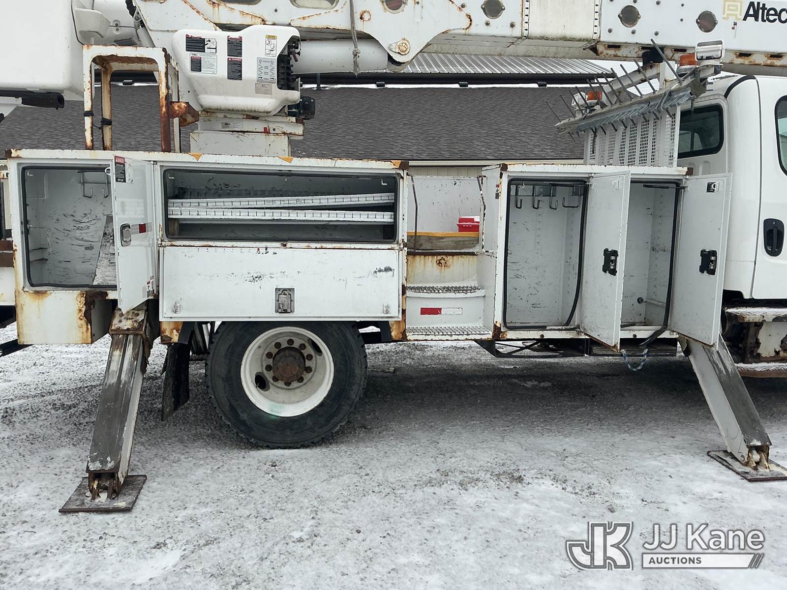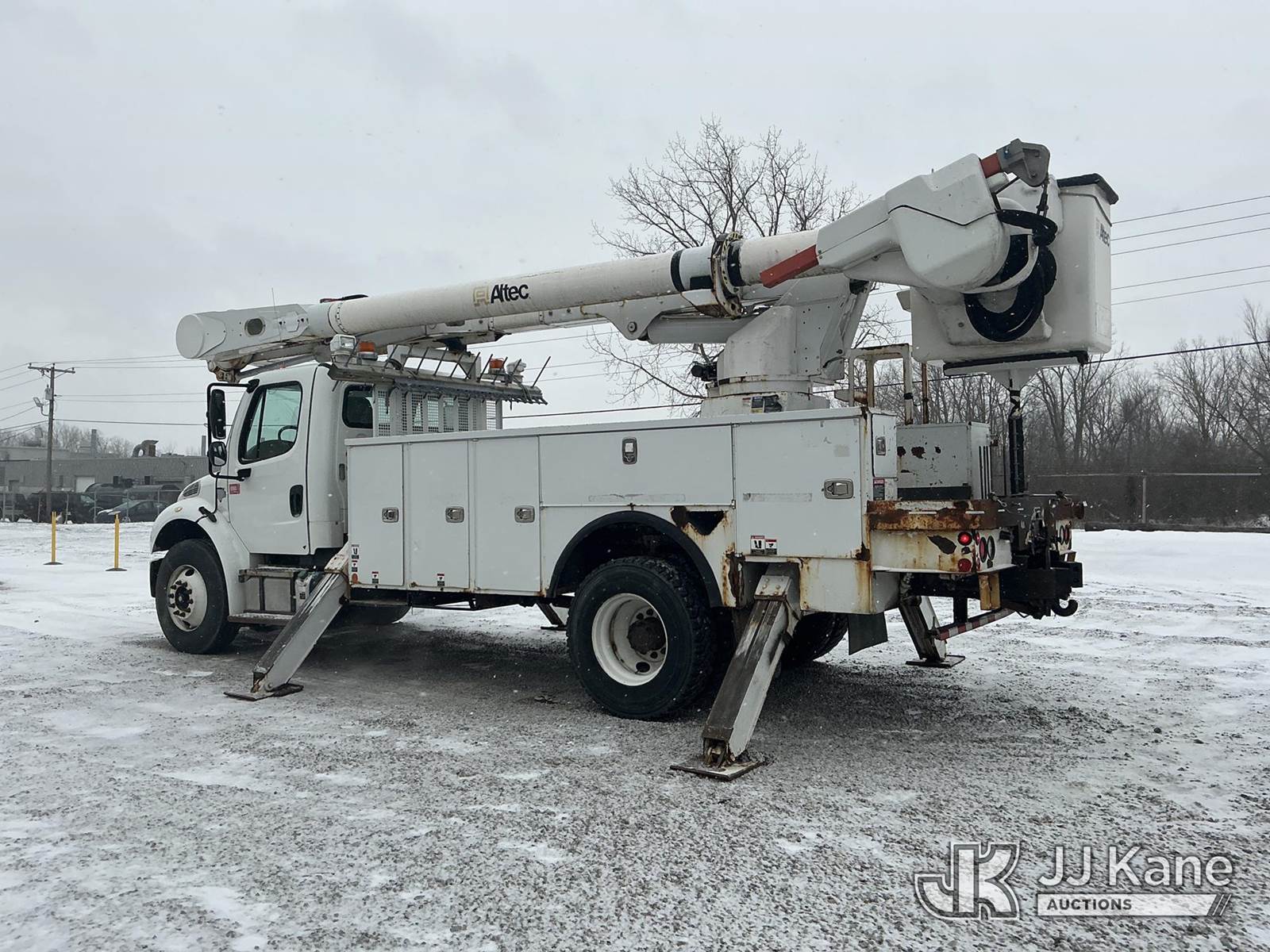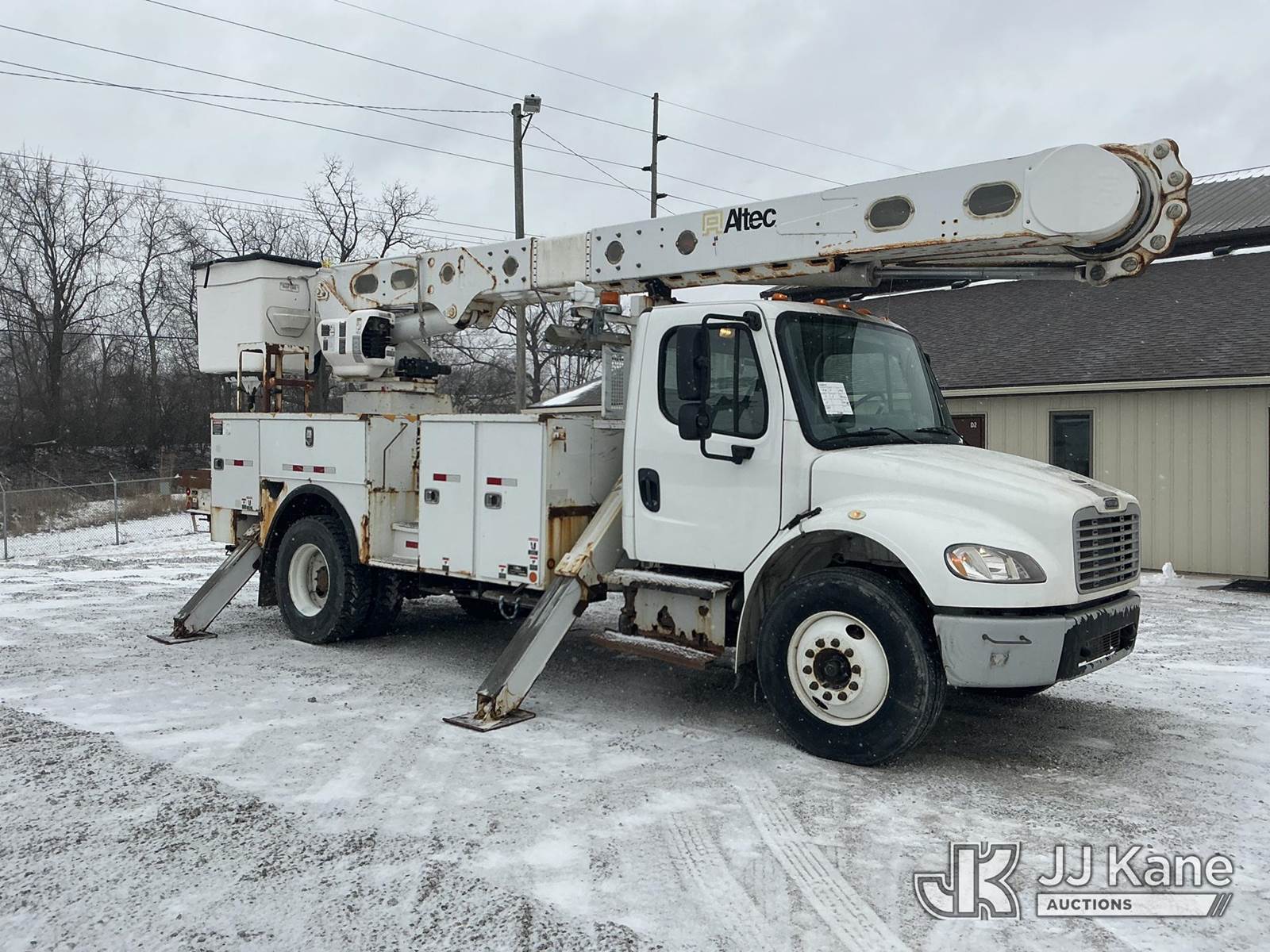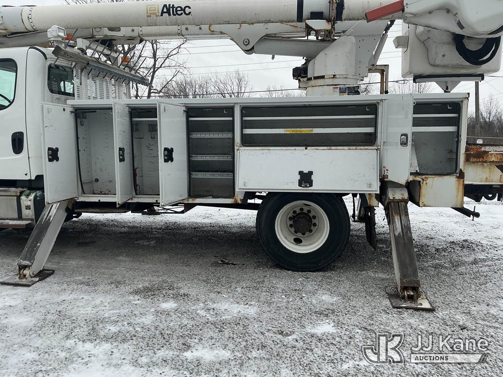 Altec AM55, 60 ft, Over-Center Material Handling Bucket Truck s/n 0914DM5331, with two-man bucket & 4 hyd outriggers, rear mounted on 2015 Freightliner M2 106 Utility Truck, 6.7L L6 diesel, 4X2, Auto, A/C, (90,527 miles) (Runs, Moves, Upper Condition Unknown)(Check Engine Light On, Rust/Paint Damage ) (Reads 9,693 hours) This is a Titled Item NOTE: This unit is being sold AS IS/WHERE IS via Timed Auction and is located in Fort Wayne, IN. Inspection & preview days for this unit are the 2 business days prior to the first day of items closing for this auction, item is located at 3020 Commercial Rd Fort Wayne, IN 46809 and hours of operations are 8a-4p. For pre-sale questions, please contact Eric Mcintosh @ (260) 205-2483 (Manuals provided in cab) (Buyer is responsible for removal. Assistance by consignor or JJ Kane Auctions is not assured.)