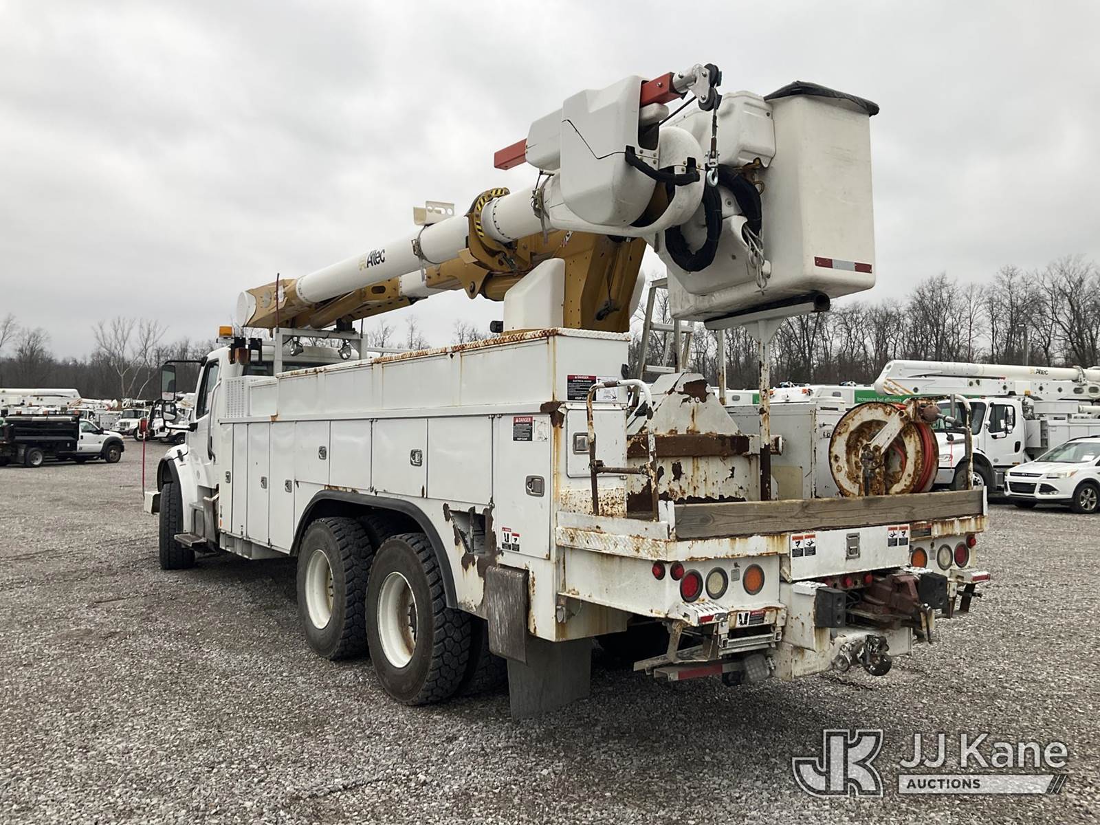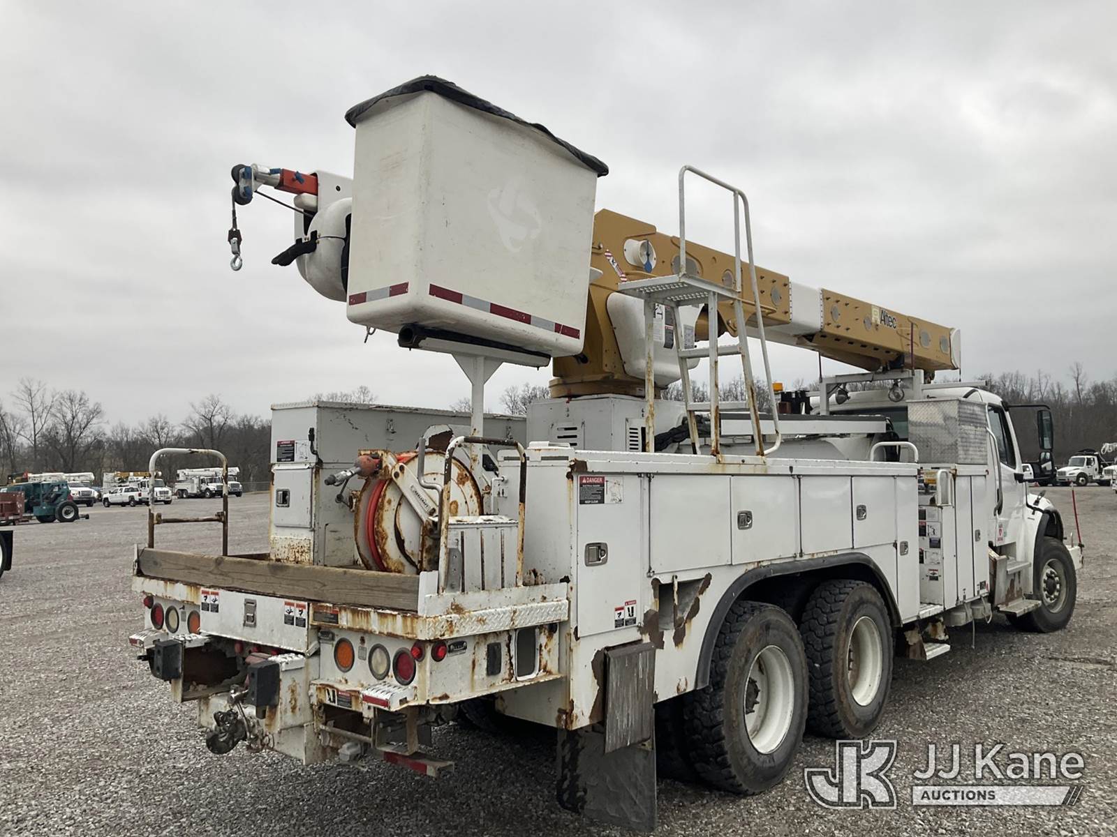 Altec AM55E68, 73 ft, Over-Center Material Handling Elevator Bucket Truck s/n 0514DM5098, with two-man bucket & 4 hyd outriggers, mounted behind cab on 2015 Freightliner M2 106 Utility Truck, 8.9L L6 diesel, Auto, 6X4, A/C, with front winch, (135,735 miles) (Duke Unit) (Runs, Moves & Upper Operates) (Rust Damage) (Reads 9,128 hours) This is a Titled Item NOTE: This unit is being sold AS IS/WHERE IS via Timed Auction and is located in Verona, KY. Inspection & preview days for this unit are the 2 business days prior to the first day of items closing for this auction, item is located at 2841 Verona-Mudlick Rd Ste B Verona, KY 41092 and hours of operations are 8a-4p. For pre-sale questions, please contact Office Staff @ (502) 612-5080. Auctioneer Michael Whitebread / License # 256617. (Manuals provided in cab) (Buyer is responsible for removal. Assistance by consignor or JJ Kane Auctions is not assured.)