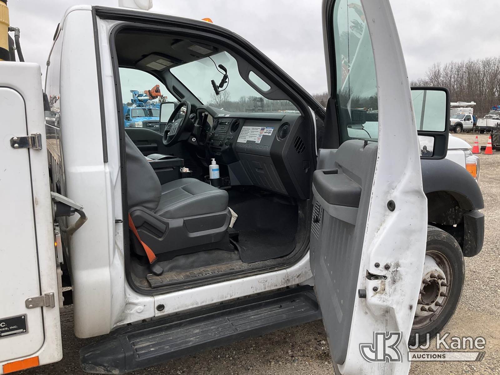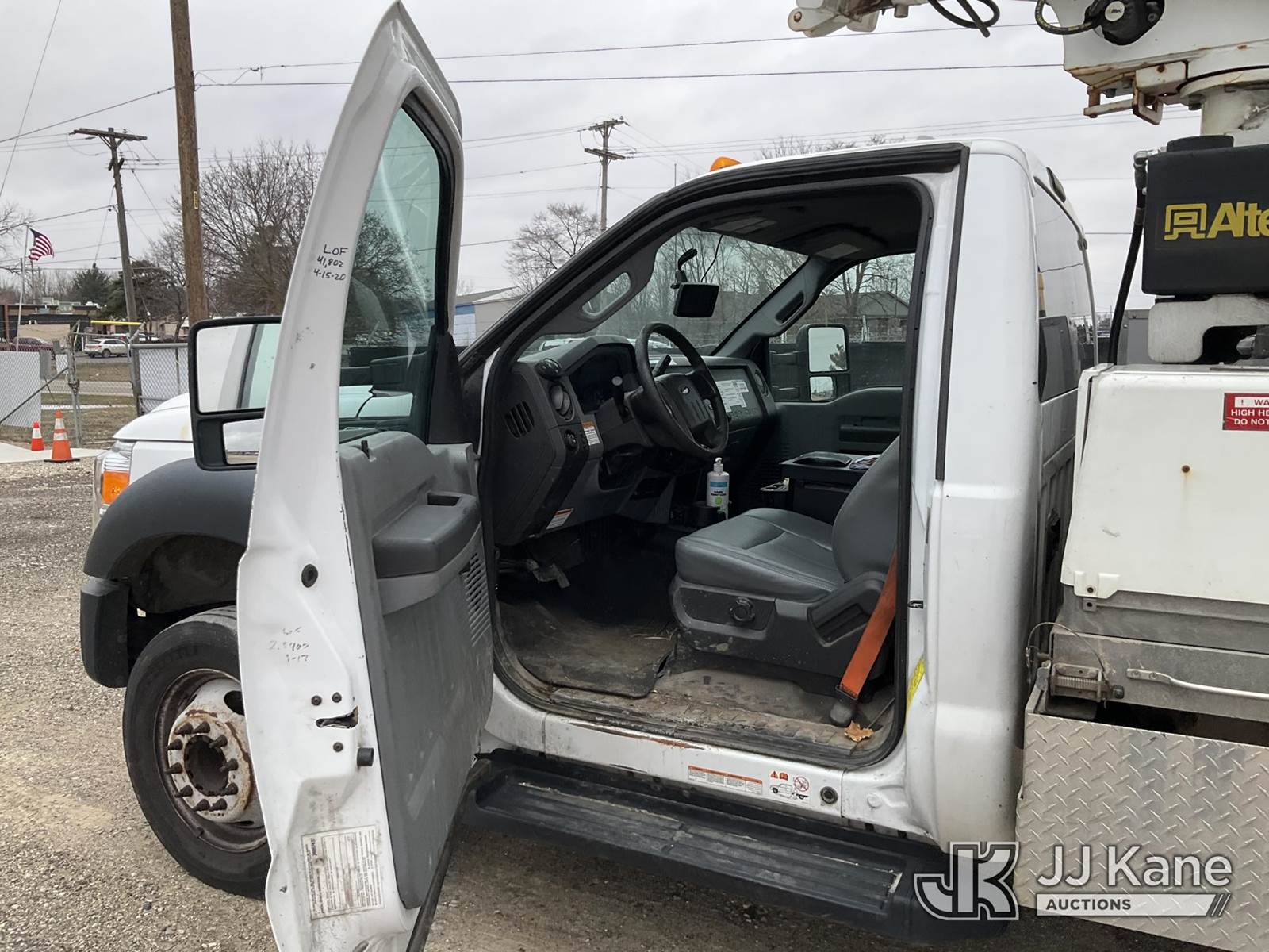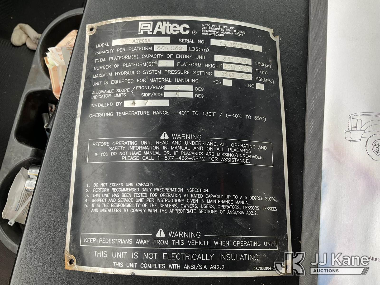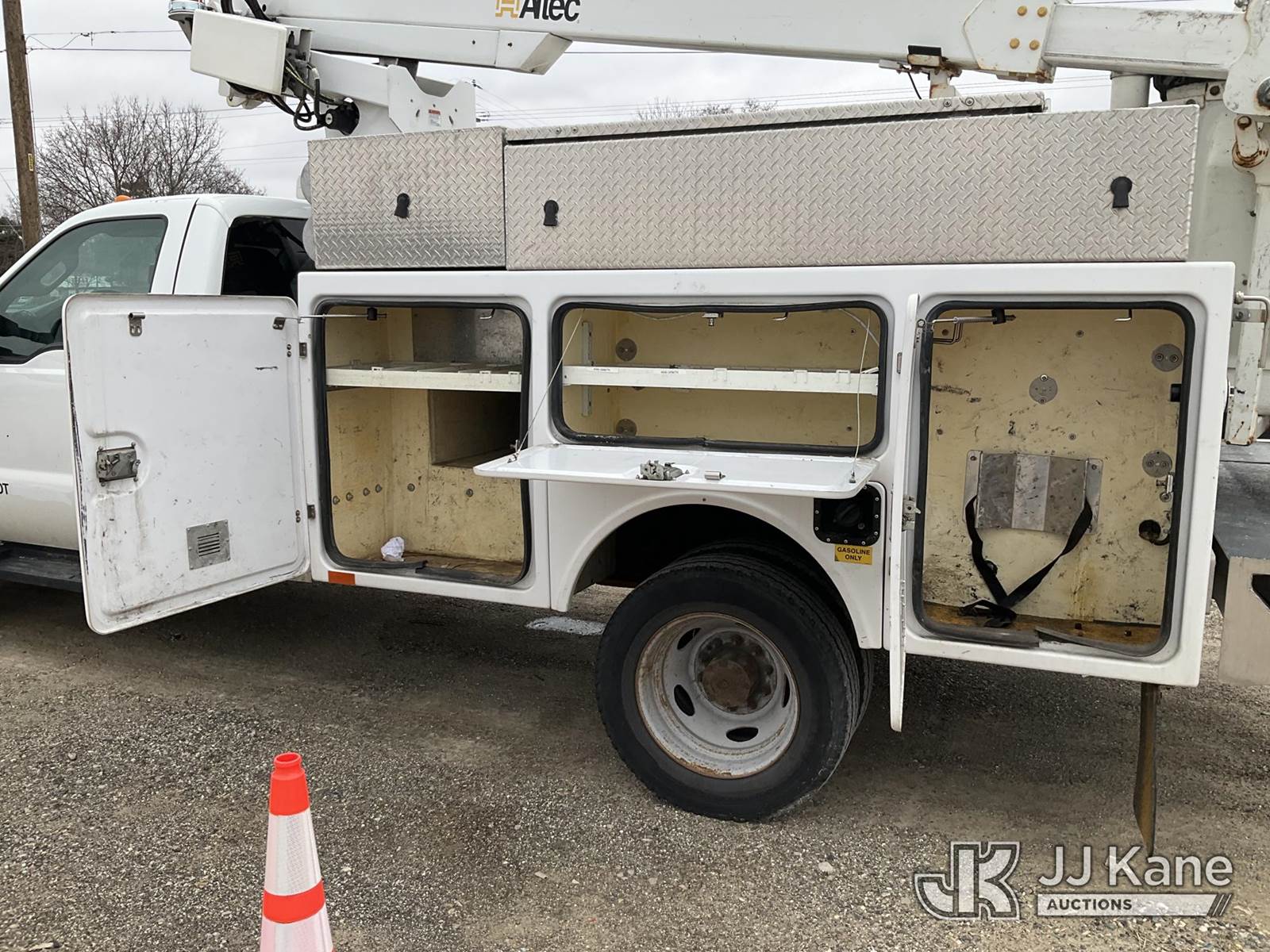 Altec AT200-A, 35 ft, Telescopic Non-Insulated Bucket Truck s/n 0415BV21861, with single man bucket, mounted behind cab on 2015 Ford F-450 SD Regular Cab DRW 2WD Service Truck, 6.8L V10 SOHC 30V RWD, GAS, A/C, with Fiberglass Service Body, Onan 7kW Generator, Nitrogen Bottle Replacement Module Compressor, Inverter, Go-Light, (82,410 miles) (Runs, Moves & Operates) (Engine Light, Upper Placard Removed - In Cab, Gas Leak at Generator Carb, Emergency Stop Broken at Upper Controls) This is a Titled Item NOTE: This unit is being sold AS IS/WHERE IS via Timed Auction and is located in Charlotte, MI. Inspection & preview days for this unit are the 2 business days prior to the first day of items closing for this auction, item is located at 750 Island Hwy Charlotte, MI 48813 and hours of operations are 8a-4p. For pre-sale questions, please contact Corey Cook at (517) 983-0796 or corey.cook@jjkane.com (Manuals provided in cab) (Buyer is responsible for removal. Assistance by consignor or JJ Kane Auctions is not assured.)