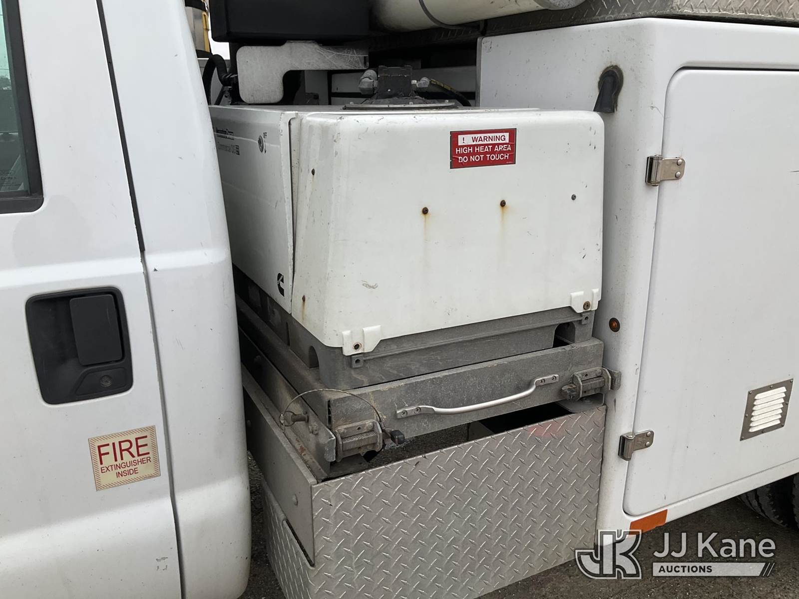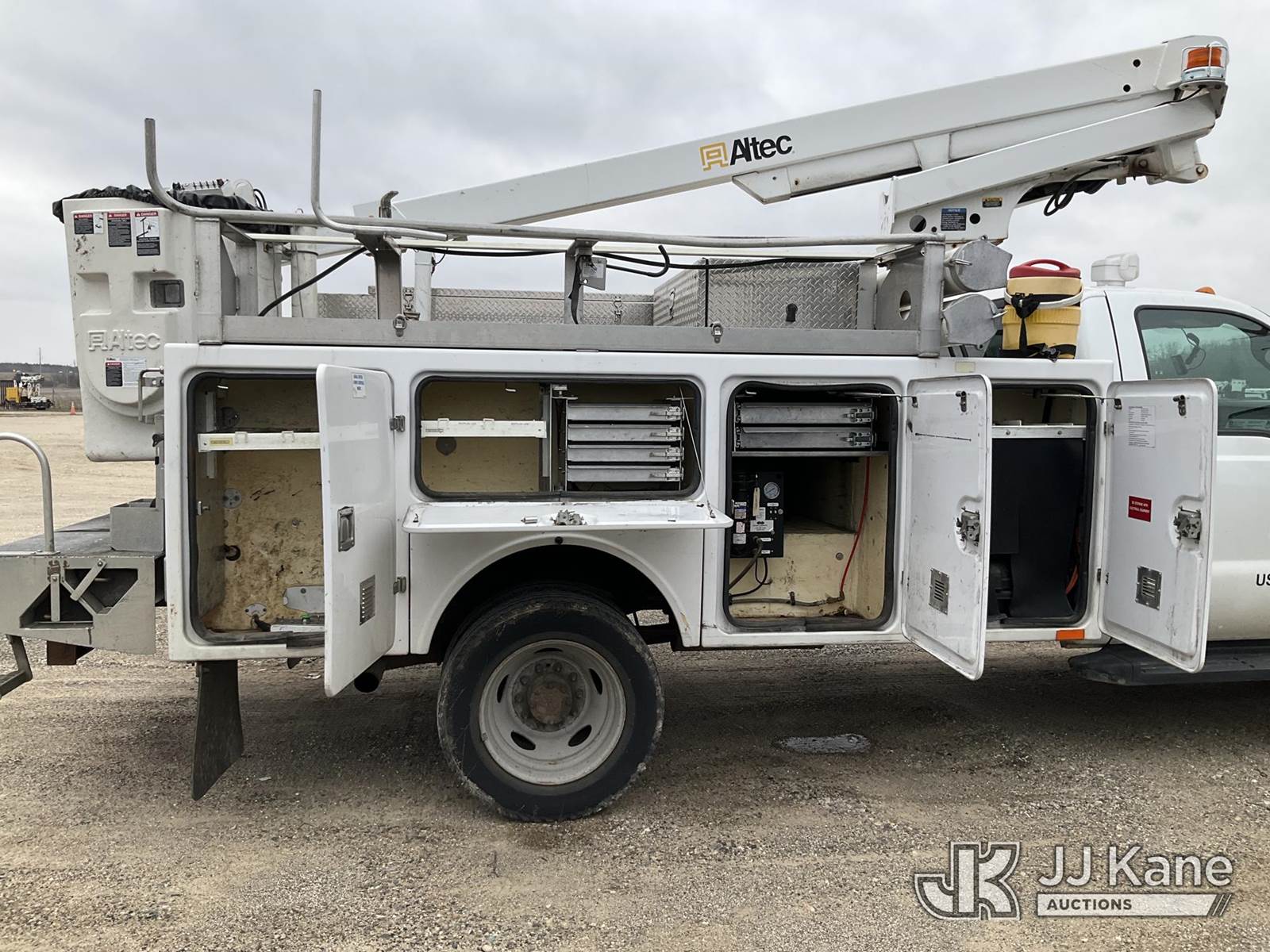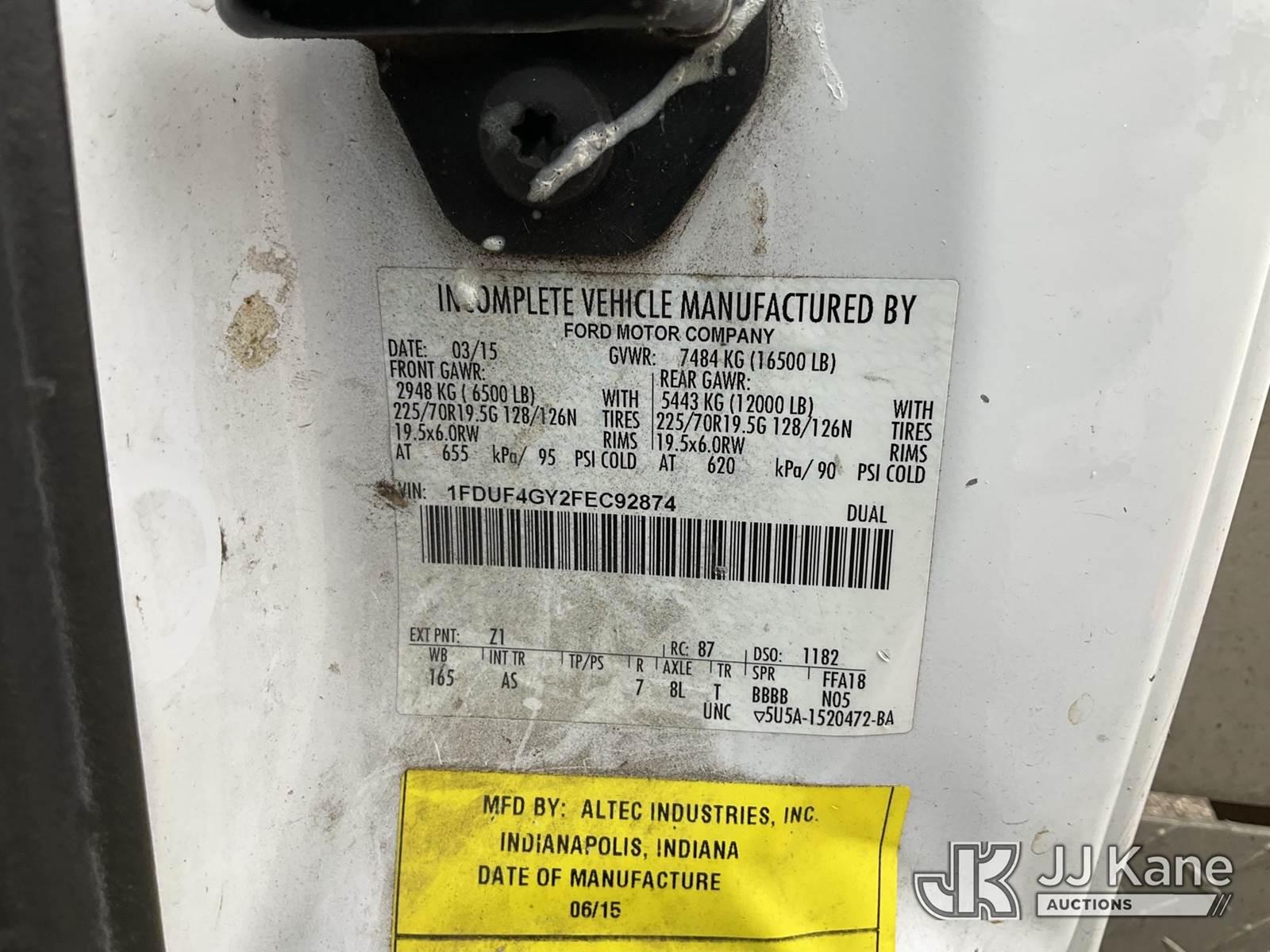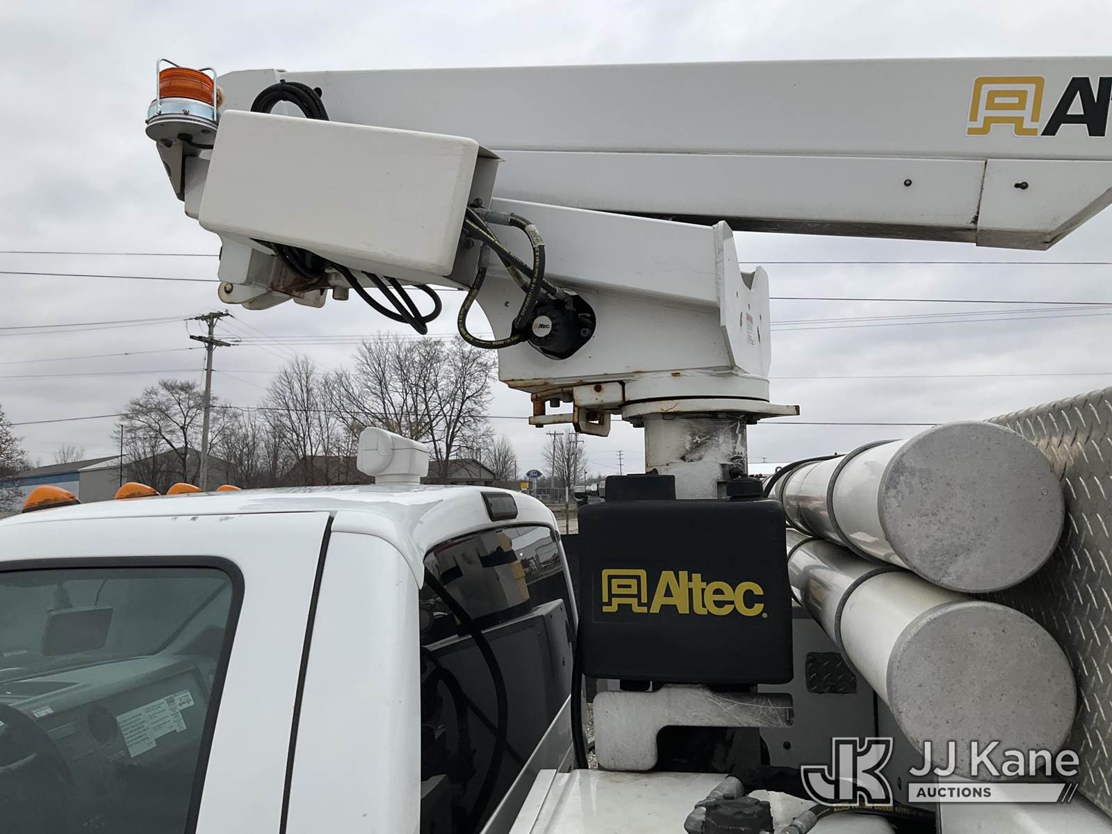 Altec AT200-A, 35 ft, Telescopic Non-Insulated Bucket Truck s/n 0415BV21861, with single man bucket, mounted behind cab on 2015 Ford F-450 SD Regular Cab DRW 2WD Service Truck, 6.8L V10 SOHC 30V RWD, GAS, A/C, with Fiberglass Service Body, Onan 7kW Generator, Nitrogen Bottle Replacement Module Compressor, Inverter, Go-Light, (82,410 miles) (Runs, Moves & Operates) (Engine Light, Upper Placard Removed - In Cab, Gas Leak at Generator Carb, Emergency Stop Broken at Upper Controls) This is a Titled Item NOTE: This unit is being sold AS IS/WHERE IS via Timed Auction and is located in Charlotte, MI. Inspection & preview days for this unit are the 2 business days prior to the first day of items closing for this auction, item is located at 750 Island Hwy Charlotte, MI 48813 and hours of operations are 8a-4p. For pre-sale questions, please contact Corey Cook at (517) 983-0796 or corey.cook@jjkane.com (Manuals provided in cab) (Buyer is responsible for removal. Assistance by consignor or JJ Kane Auctions is not assured.)