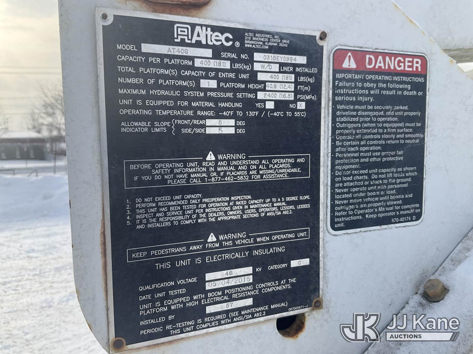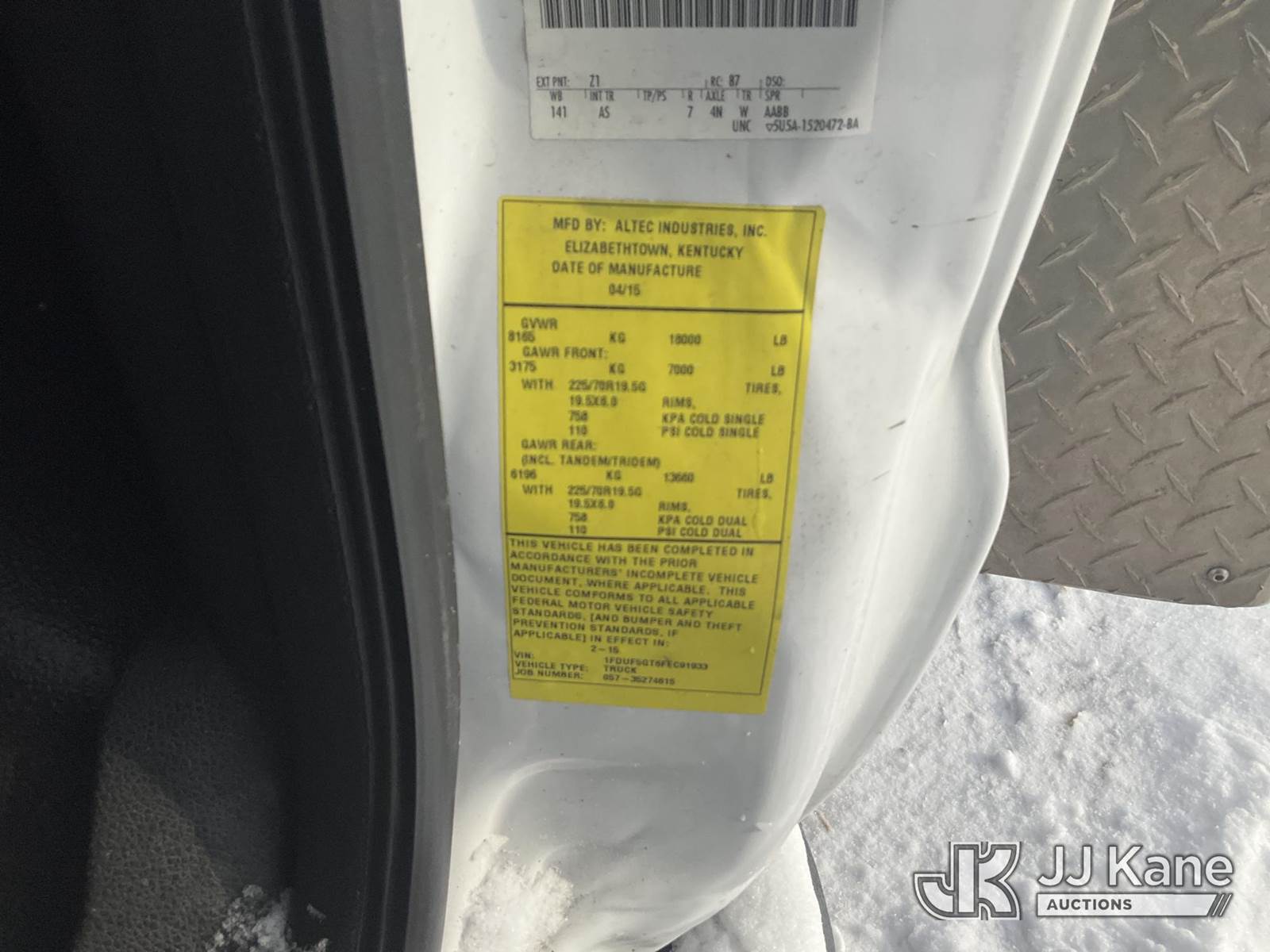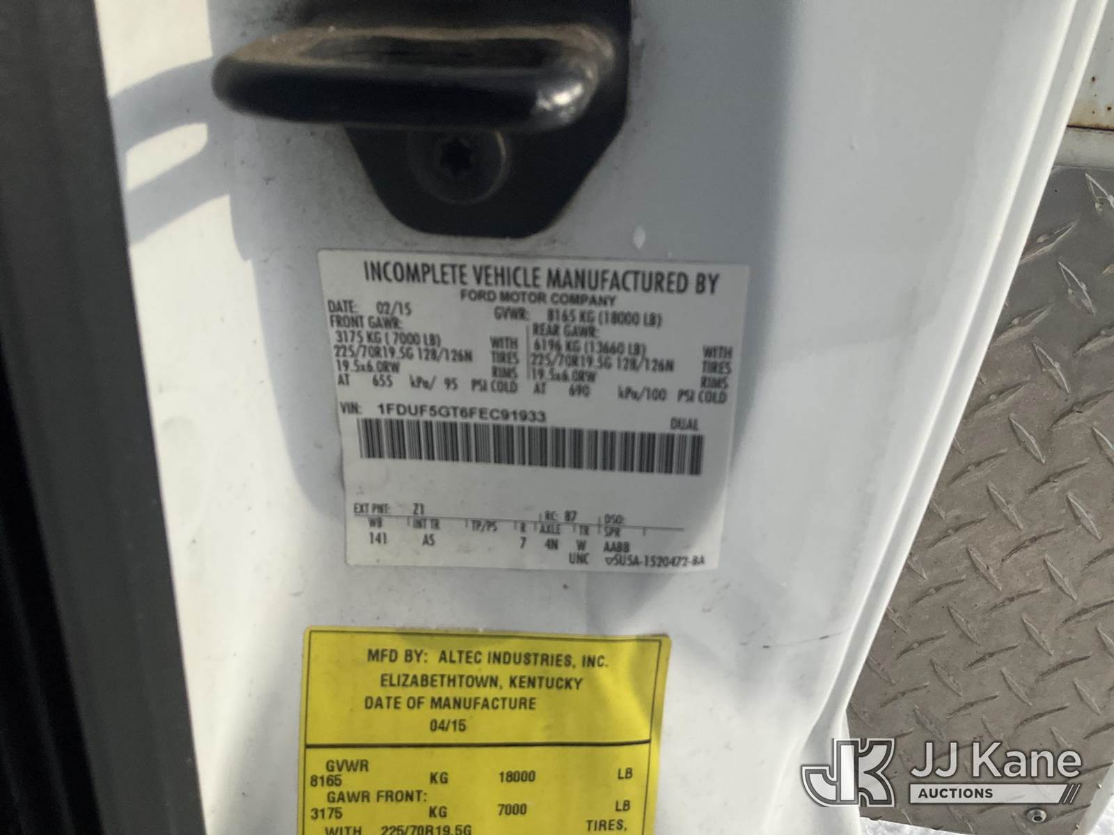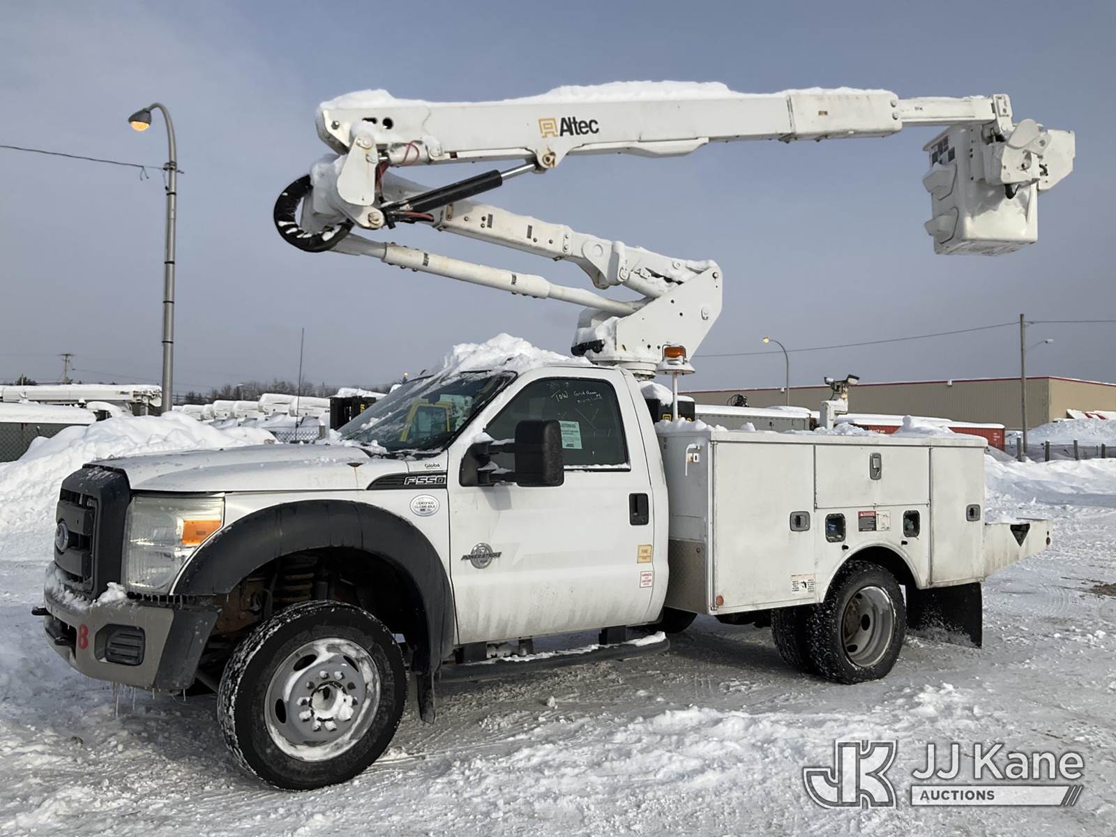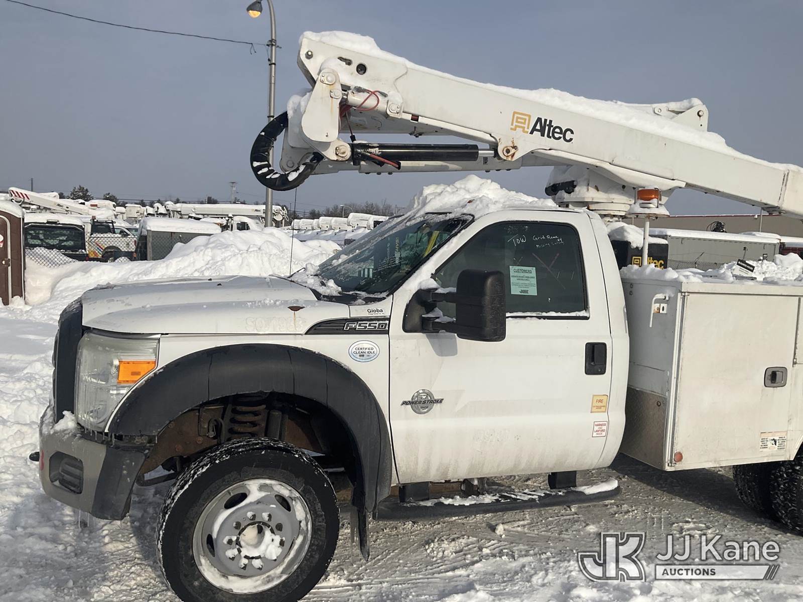 Altec AT40G, 45 ft, Articulating & Telescopic Bucket Truck s/n 0315EY0984, with Single-Man Bucket, mounted behind cab on 2015 Ford F550 2WD Service Truck, 6.7L diesel, Auto, A/C, (157,220 miles) (Runs, Moves & Upper Operates, Check Engine Light, Missing A Battery, Cracked Windshield) This is a Titled Item NOTE: This unit is being sold AS IS/WHERE IS via Timed Auction and is located in Rome, NY. Inspection & preview days for this unit are the 2 business days prior to the first day of items closing for this auction, item is located at 5835 Success Dr Rome, NY 13440 and hours of operations are 8a-4p. For pre-sale questions, please contact Ryan Jackson @ (315) 749-3790 or Ryan.Jackson@jjkane.com. (Missing manuals, See Auction Company for Manufacturers Information to obtain manuals) (Buyer is responsible for removal. Assistance by consignor or JJ Kane Auctions is not assured.)