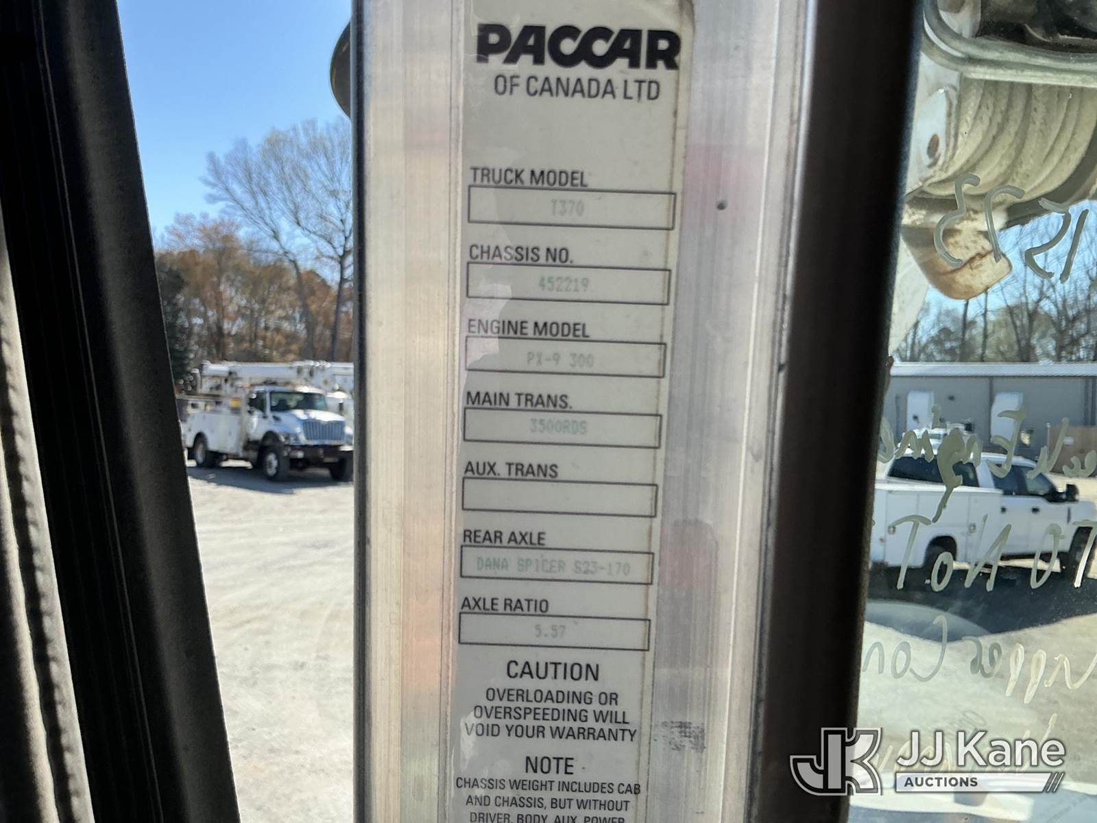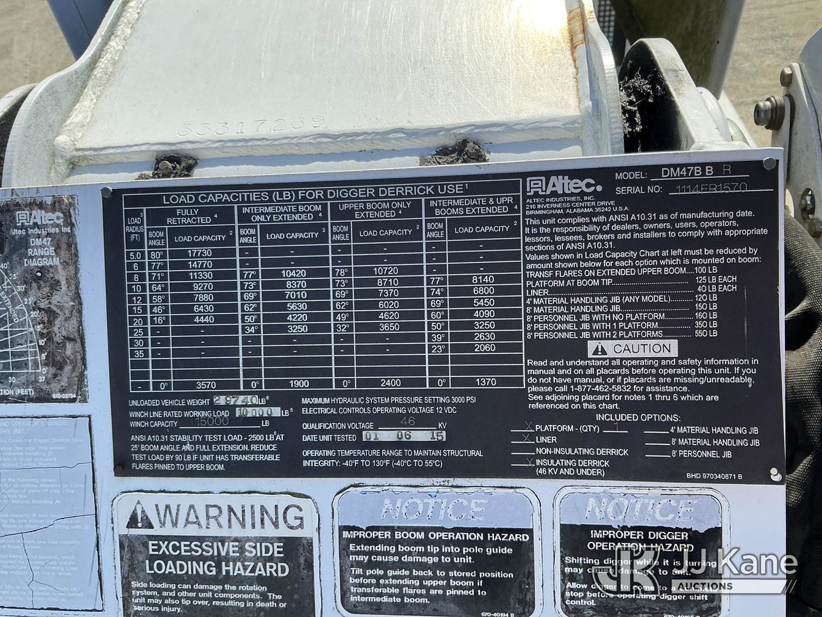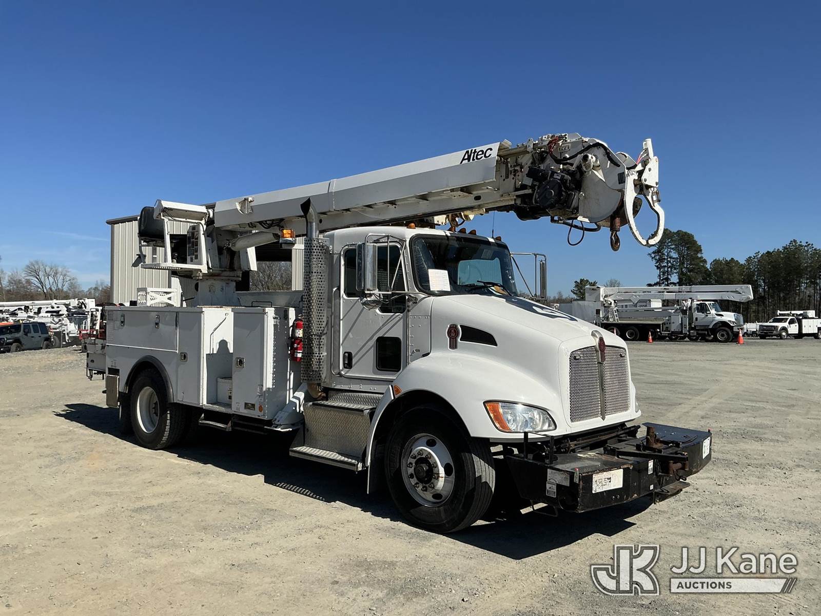 Altec DM47B-BR, 17,730 Lb Digger Derrick s/n 1114FR1570, with 47ft sheave height, 2spd digger, tip winch, pole grabs, riding console, rear mounted on 2015 Kenworth T370 Utility Truck, Paccar PX-9 8.9L diesel, 4X2, Auto, A/C, with front winch , (112,964 miles) Co-Op Unit (Runs & Moves) (Check Engine Light On, PTO Not Engaging Upper Condition Unknown ) This is a Titled Item NOTE: This unit is being sold AS IS/WHERE IS via Timed Auction and is located in China Grove, NC. Inspection & preview days for this unit are the 2 business days prior to the first day of items closing for this auction, item is located at 820 E NC Hwy 152 China Grove, NC 28023 and hours of operations are 8a-4p. For pre-sale questions, please contact Office Staff @ (704) 674-1113. (Manuals provided in cab) (Buyer is responsible for removal. Assistance by consignor or JJ Kane Auctions is not assured.)