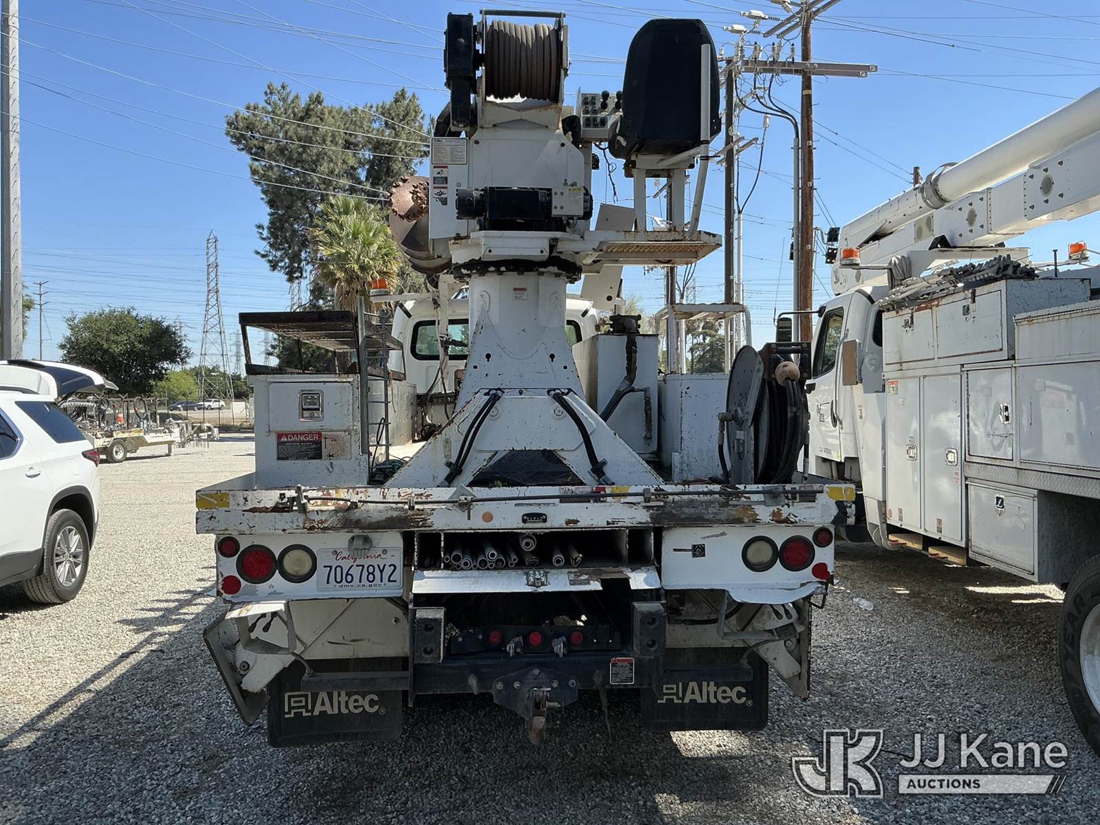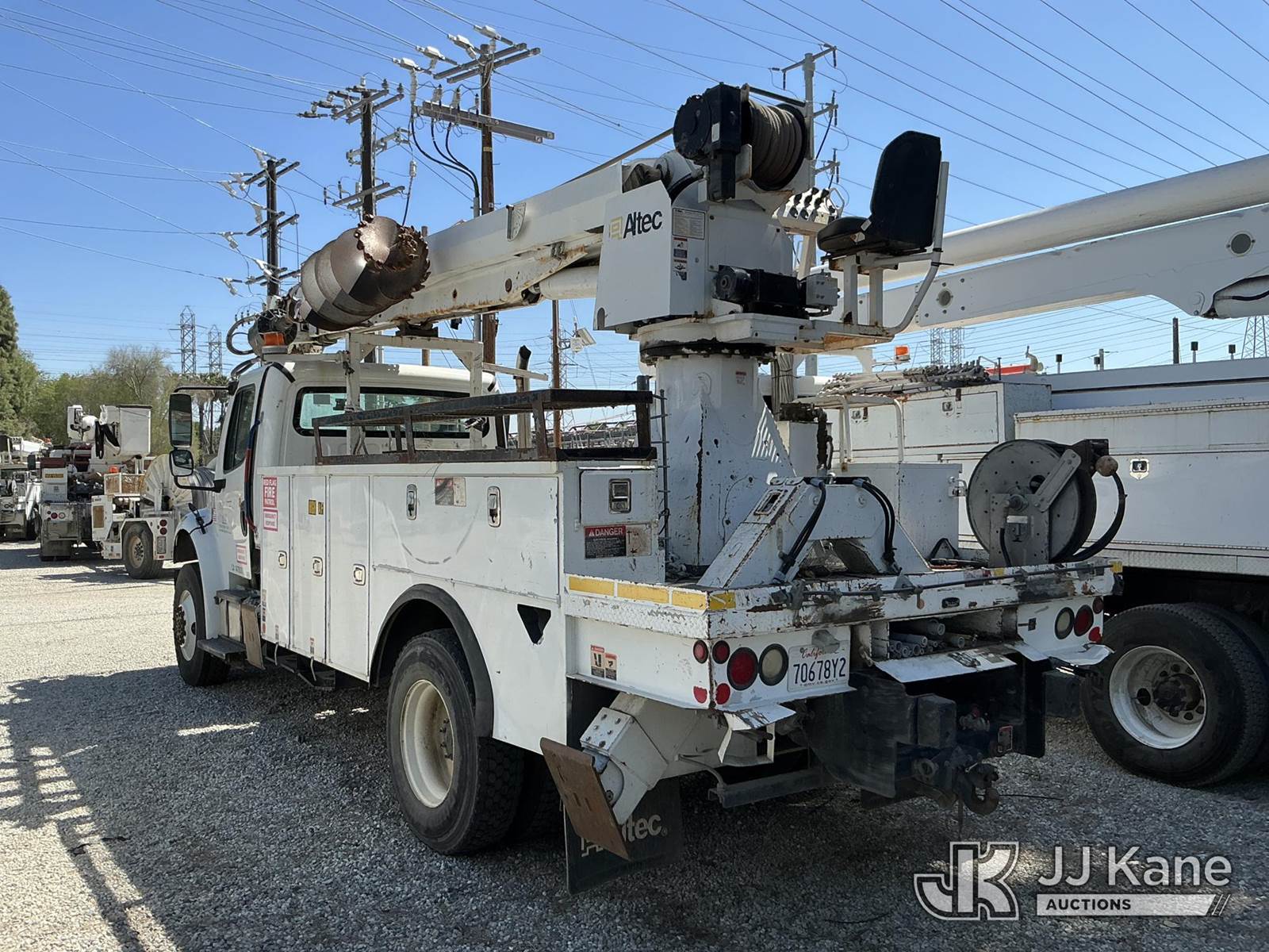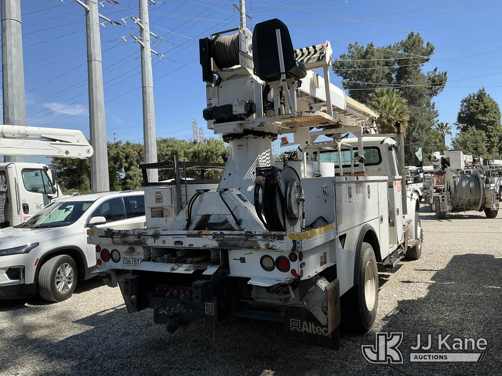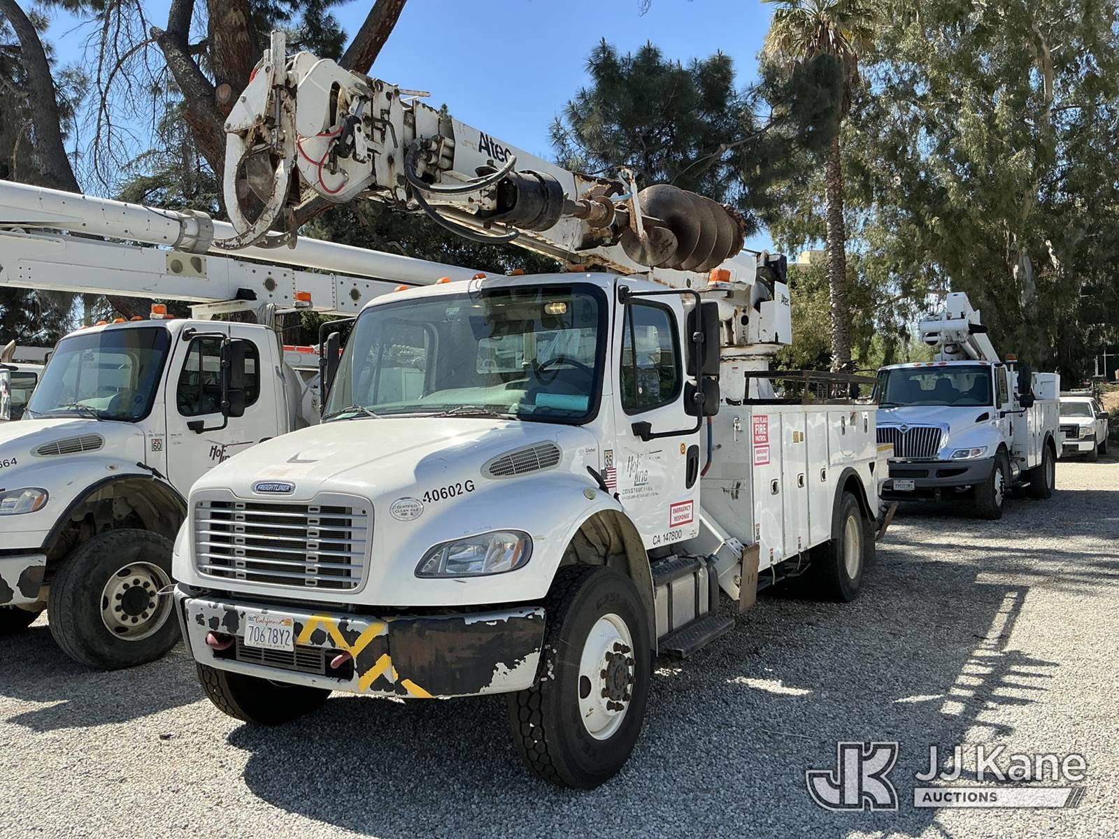 Altec DM47B-TR, 23,790 Lb Digger Derrick s/n 0714EB1354, with Riding seat controls, 2 speed dig, heel winch,3rd stage hydr boom, pole grabs, 4 hydraulic outriggers, rear mounted on 2015 Freightliner M2 106 Utility Truck, 6.7L L6 4X4, DIESEL, Auto, A/C, (101,776 miles) (Runs & Moves, Would Not Go Into Reverse, PTO Operates, Outriggers Reported to Deploy, but could not verify, Upper Boom Non-Operational Parts are Missing, see pictures) (Reads 7,707 hours) This is a Titled Item NOTE: This unit is being sold AS IS/WHERE IS via Timed Auction and is located in Santa Paula, CA. (Missing manuals, See Auction Company for Manufacturers Information to obtain manuals) (Buyer is responsible for removal. Assistance by consignor or JJ Kane Auctions is not assured.)