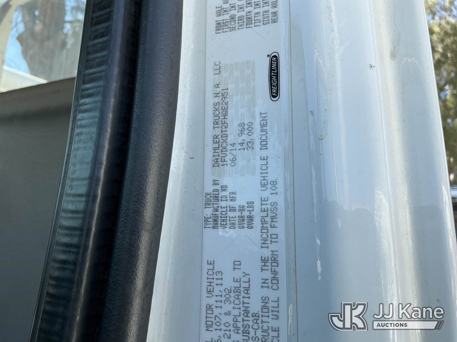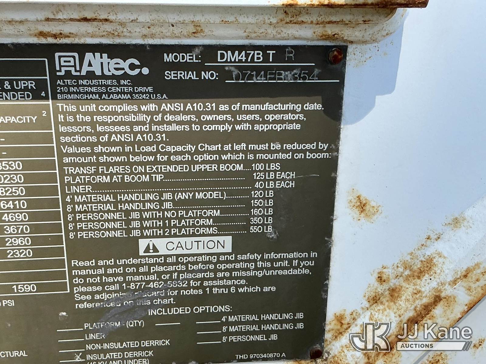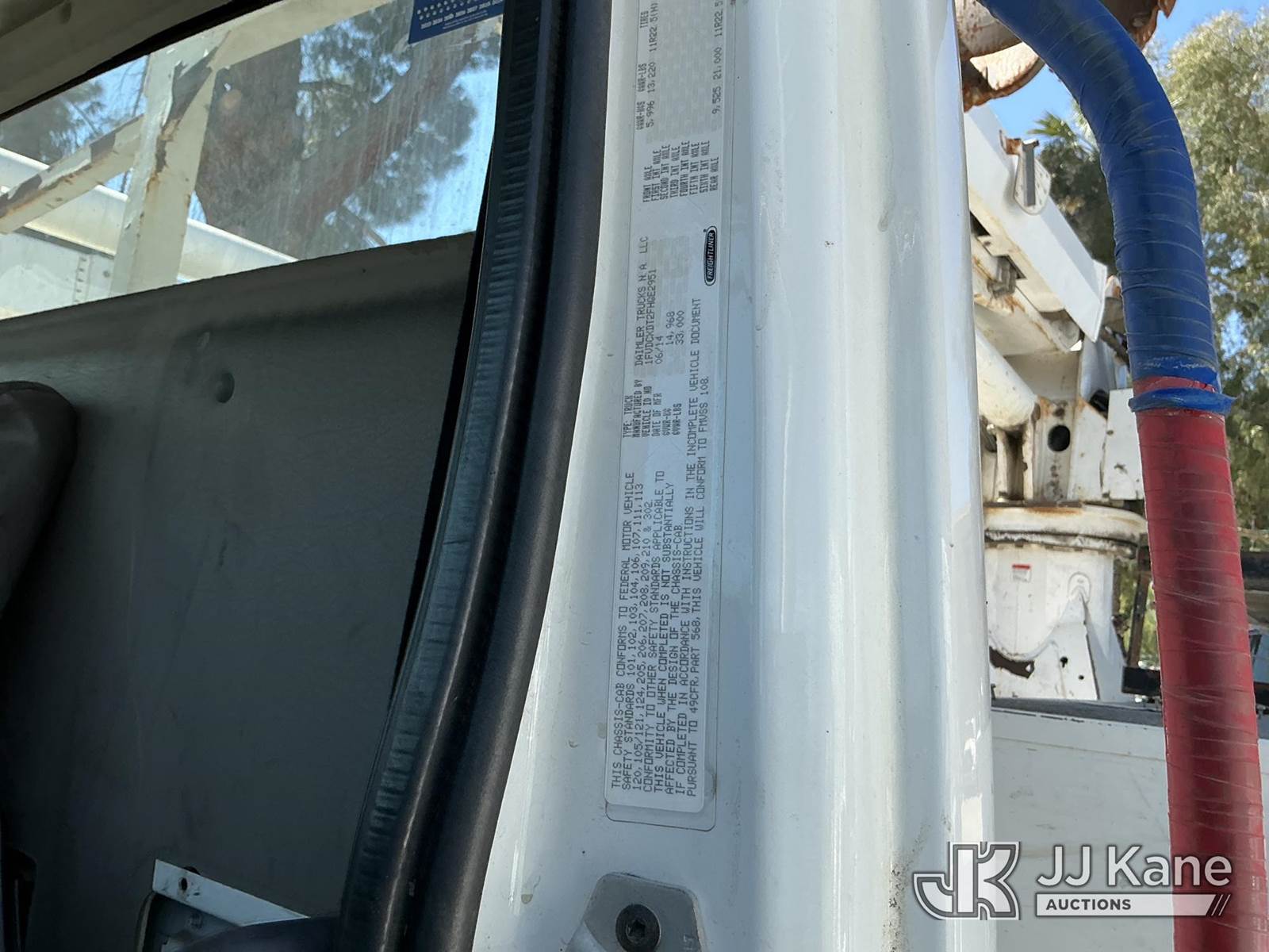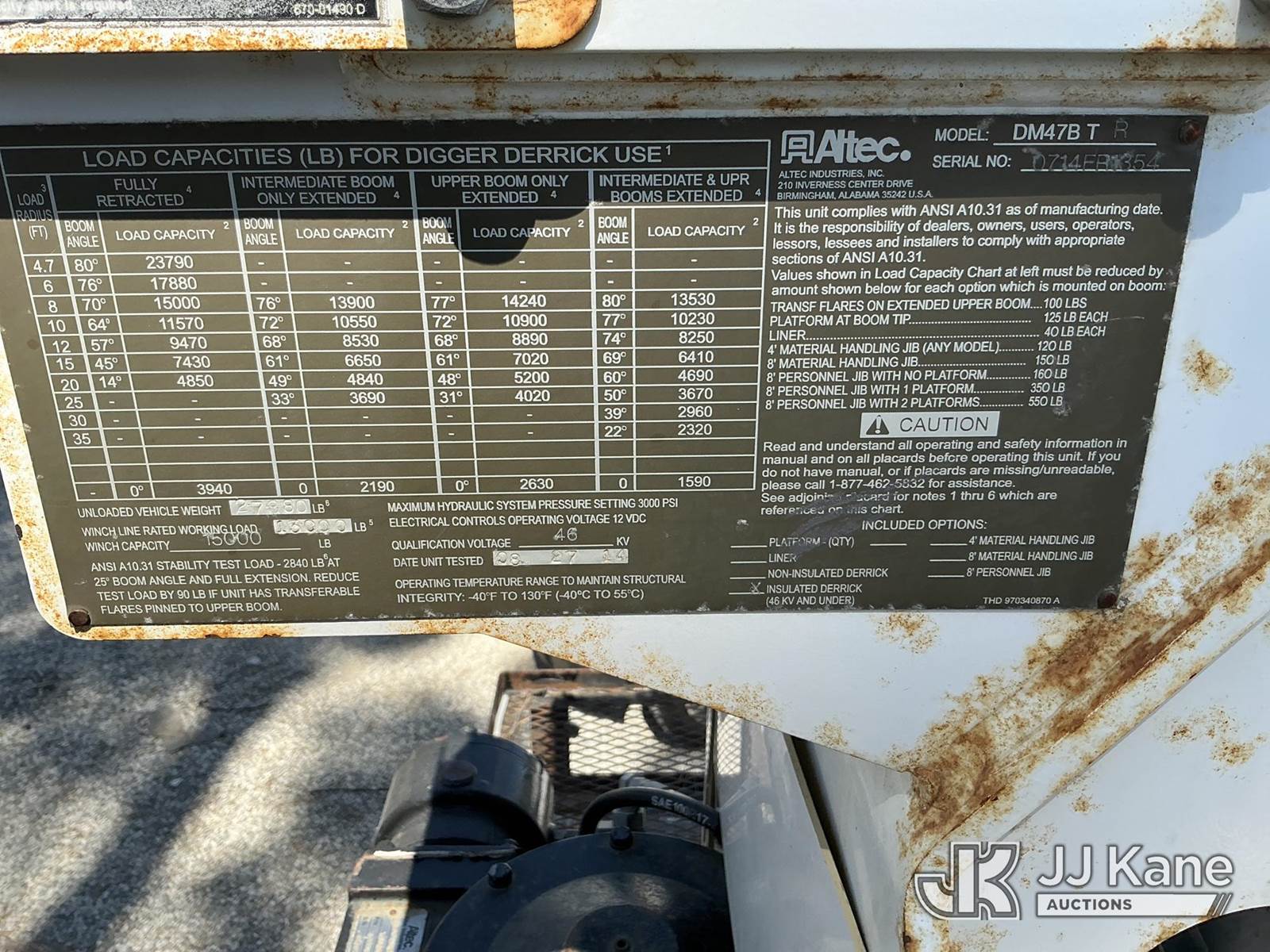 Altec DM47B-TR, 23,790 Lb Digger Derrick s/n 0714EB1354, with Riding seat controls, 2 speed dig, heel winch,3rd stage hydr boom, pole grabs, 4 hydraulic outriggers, rear mounted on 2015 Freightliner M2 106 Utility Truck, 6.7L L6 4X4, DIESEL, Auto, A/C, (101,776 miles) (Runs & Moves, Would Not Go Into Reverse, PTO Operates, Outriggers Reported to Deploy, but could not verify, Upper Boom Non-Operational Parts are Missing, see pictures) (Reads 7,707 hours) This is a Titled Item NOTE: This unit is being sold AS IS/WHERE IS via Timed Auction and is located in Santa Paula, CA. (Missing manuals, See Auction Company for Manufacturers Information to obtain manuals) (Buyer is responsible for removal. Assistance by consignor or JJ Kane Auctions is not assured.)