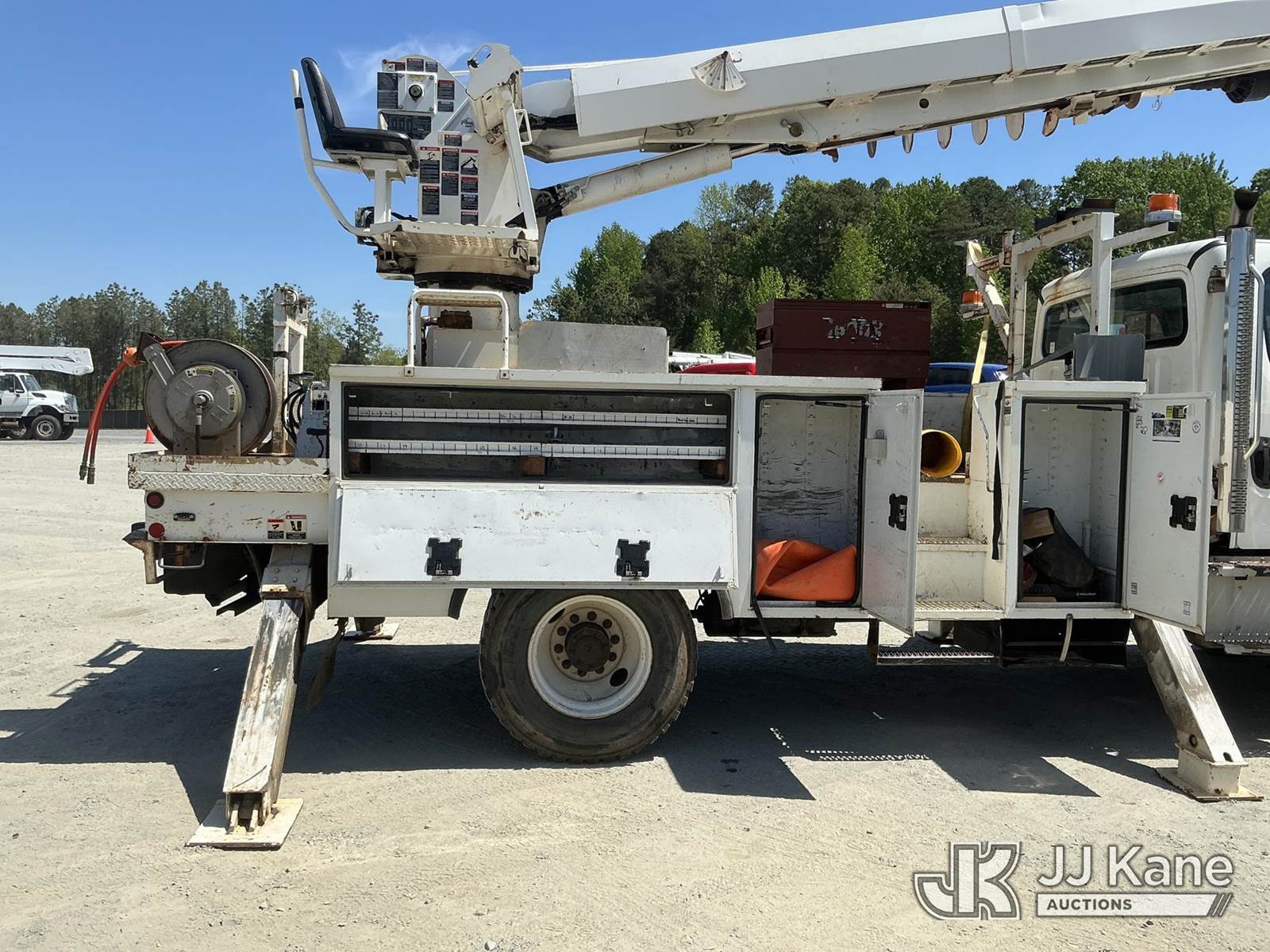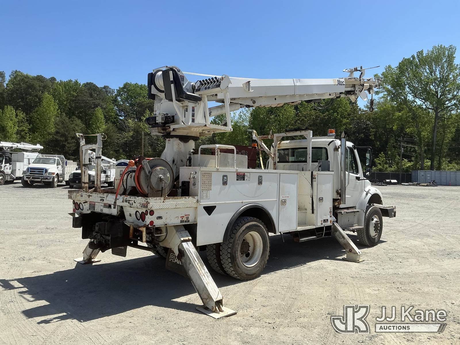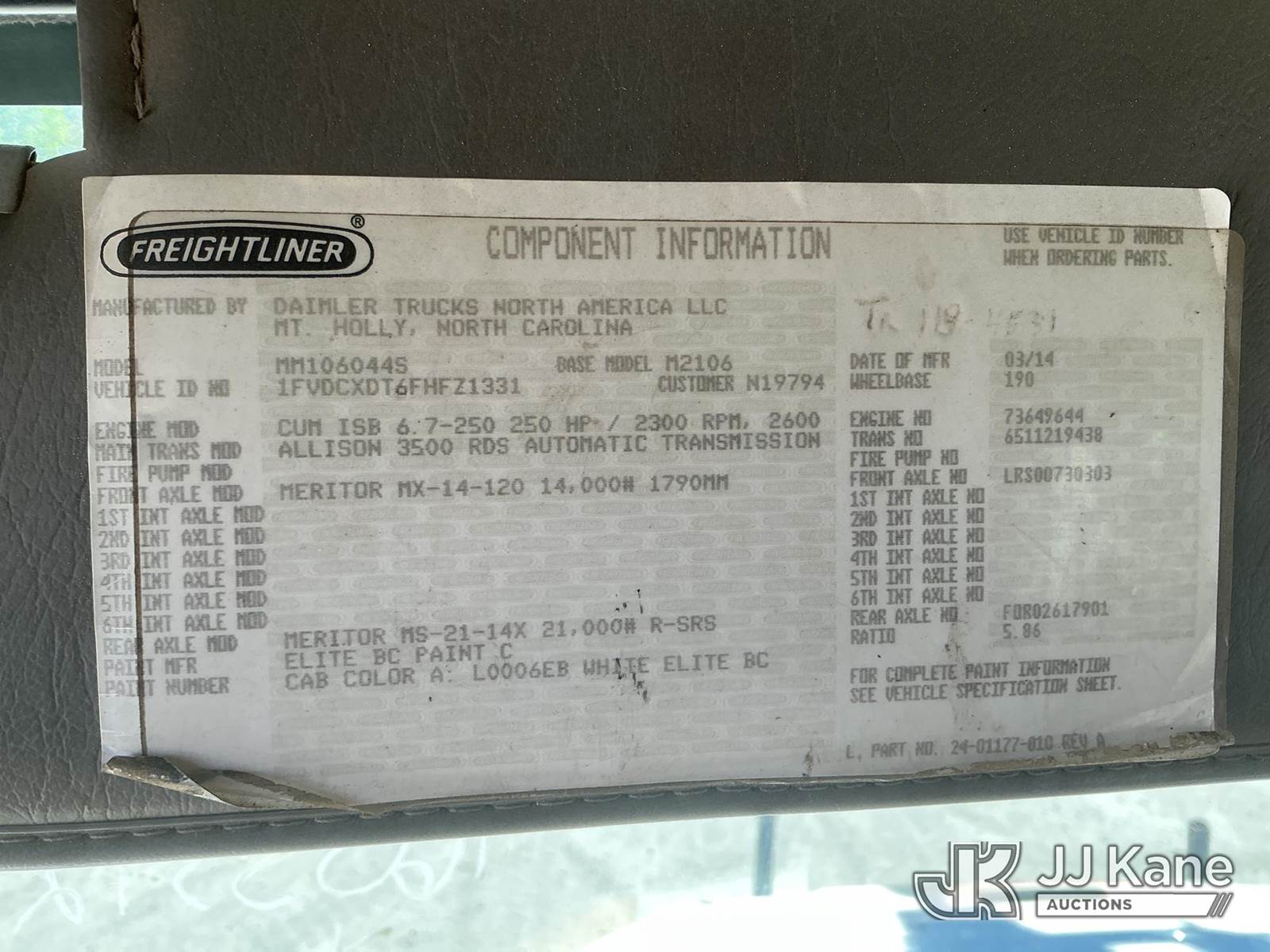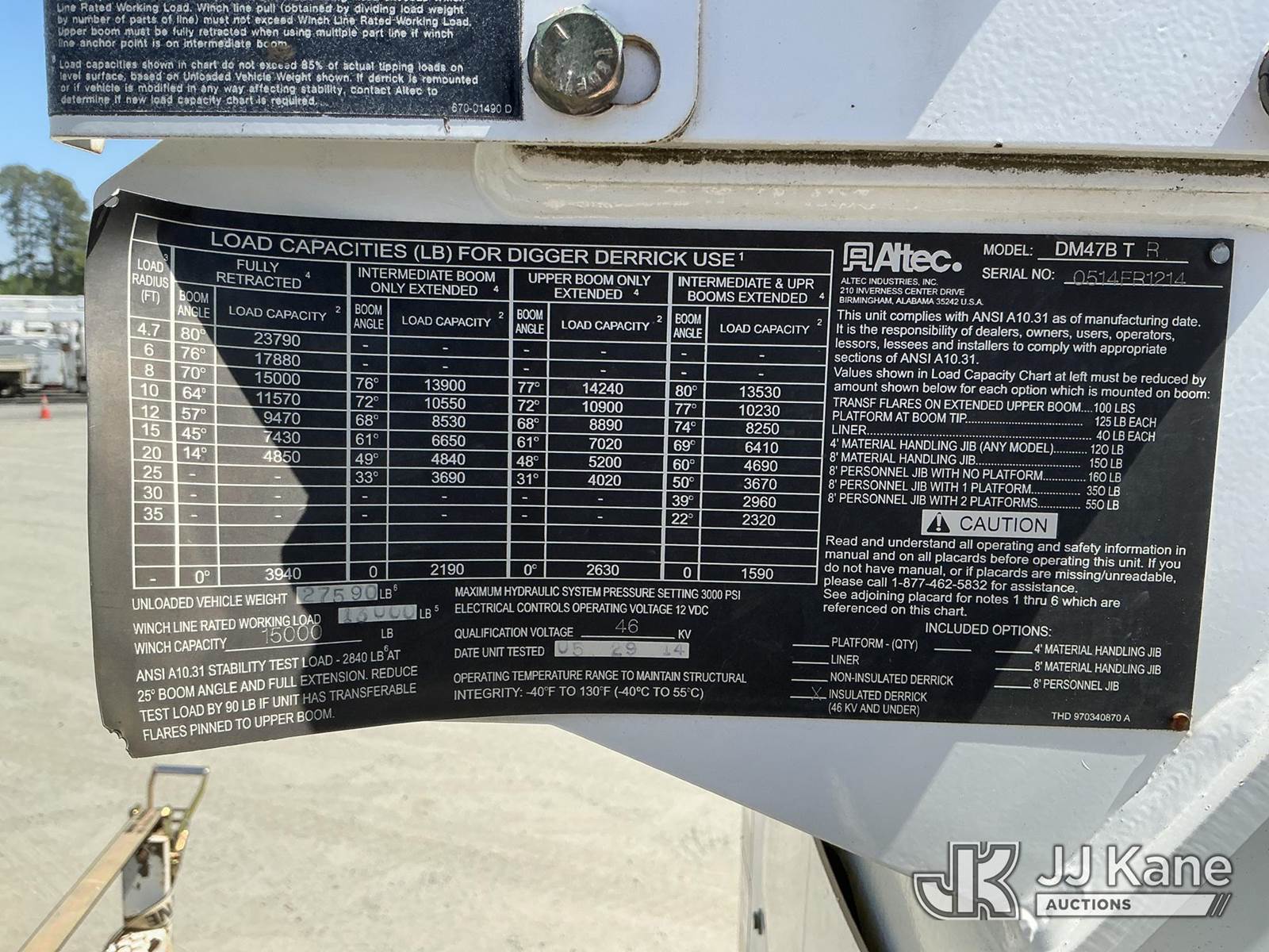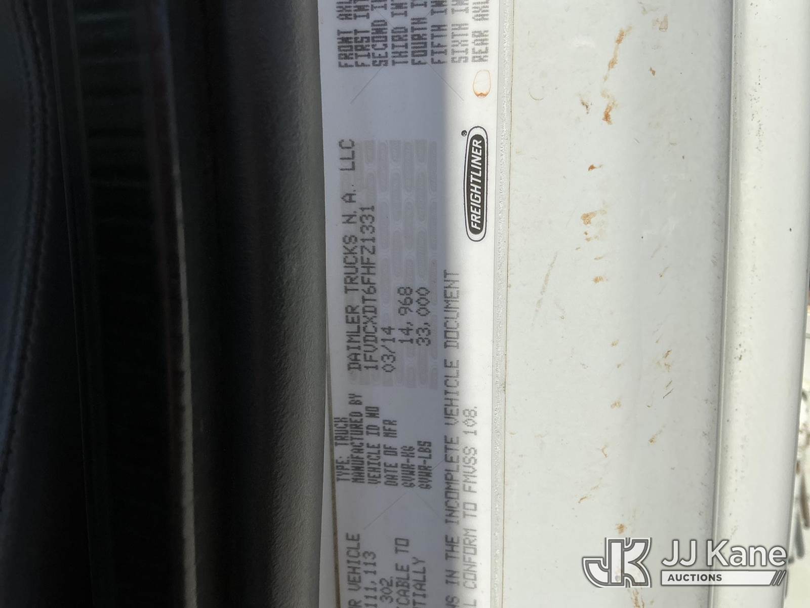Altec DM47B-TR, 23,790 Lb Digger Derrick s/n 0514FR1214, with 47 ft sheave height, 2 spd digger, heel winch, upper controls, pole grabs & riding console, rear mounted on 2015 Freightliner M2 106 4X4 Utility Truck, Cummins ISB 6.7L diesel, Auto, A/C, with front winch, (89,914 miles) (Runs, Moves & Upper Operates) (Check Engine Light On, Stop Engine Light On ) This is a Titled Item NOTE: This unit is being sold AS IS/WHERE IS via Timed Auction and is located in China Grove, NC. Inspection & preview days for this unit are the 2 business days prior to the first day of items closing for this auction, item is located at 820 E NC Hwy 152 China Grove, NC 28023 and hours of operations are 8a-4p. For pre-sale questions, please contact Office Staff @ (704) 674-1113. (Manuals provided in cab) (Buyer is responsible for removal. Assistance by consignor or JJ Kane Auctions is not assured.)