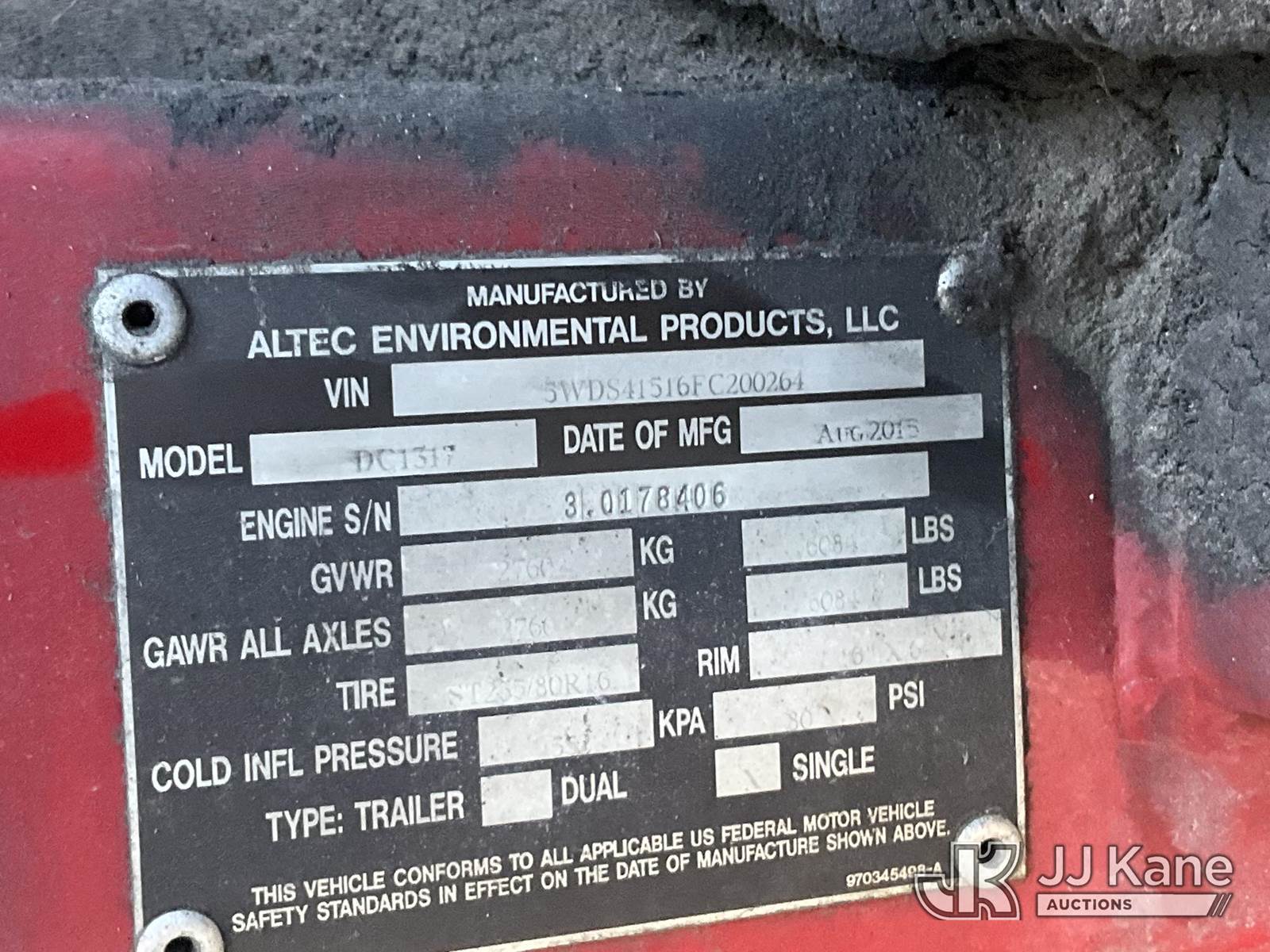 2015 Altec Environmental Products DC1317 Chipper (13in Disc), Gas, trailer mtd. (Not Operating, Condition Unknown) (No Key, Engine Missing Parts)(FL Residents Purchasing Titled Items – tax, title & registration fees will be collected at the maximum rate of $400.00 under 25,999 and $800.00 for Over 26,000 and $250.00 trailers – Proof of insurance is mandatory; Out of State Residents Purchasing Title Items – tax will be collected based upon your state rate. (FL Residents Purchasing Titled Items – tax, title & registration fees will be collected at the maximum rate of $400.00 under 25,999 and $800.00 for Over 26,000 and $250.00 trailers – Proof of insurance is mandatory; Out of State Residents Purchasing Title Items – tax will be collected based upon your state rate.) (Reads 969 hours) This is a Titled Item NOTE: This unit is being sold AS IS/WHERE IS via Timed Auction and is located in Thonotosassa, FL. Inspection & preview days for this unit are the 2 business days prior to the first day of items closing for this auction, item is located at 11720 N US 301 Thonotosassa, Fl 33592 and hours of operations are 8a-4p. For pre-sale questions, please contact Office Staff @ (813) 986-2485. (Buyer is responsible for removal. Assistance by consignor or JJ Kane Auctions is not assured.)