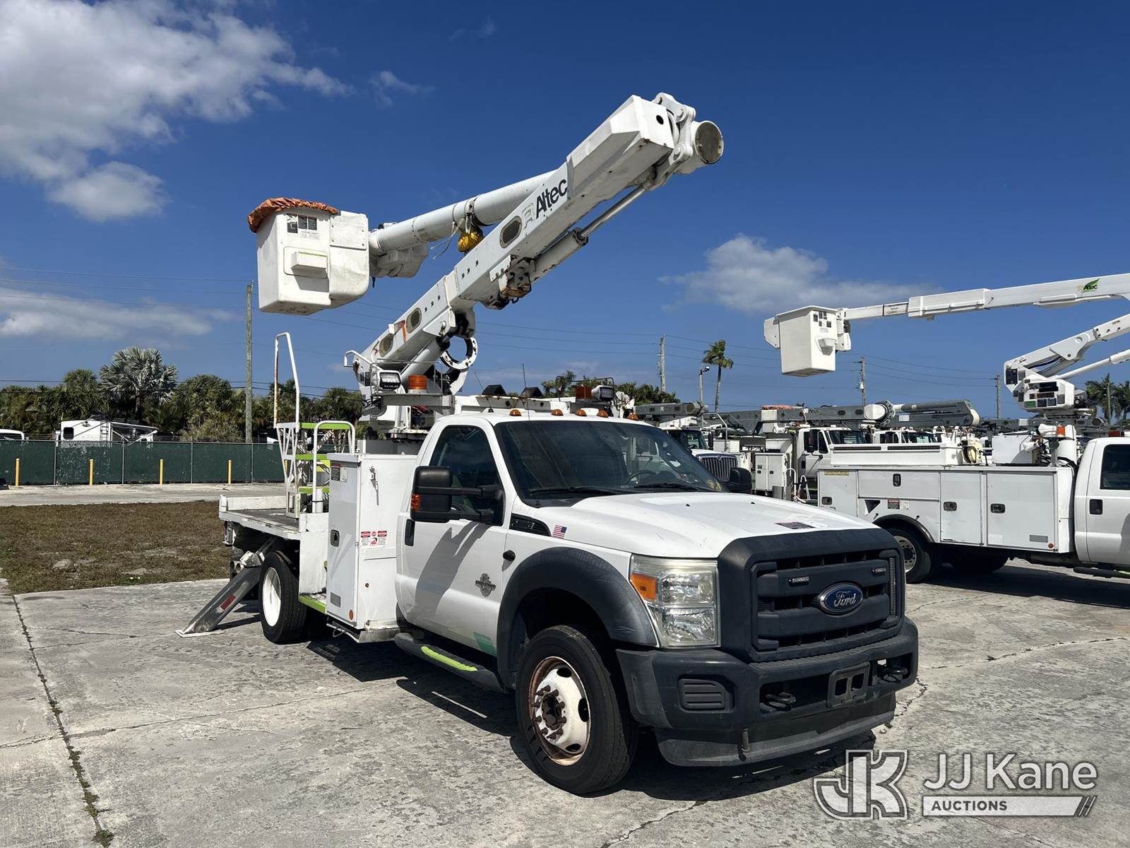 Altec L37M, 42 ft, Over-Center Material Handling Bucket Truck s/n 1114CW1556, with single-man bucket, rear mounted on 2015 Ford F550 4x4 Flatbed Truck, 6.7L diesel, Auto, A/C, (95,324 miles) (Runs, Moves & Upper Operates) (Must Be Towed) (Oil Leak, Oil Pan Crushed, Check Engine Light On, Service Light on, Low Idle, Body/Paint Damage) (FL Residents Purchasing Titled Items – tax, title & registration fees will be collected at the maximum rate of $400.00 under 25,999 and $800.00 for Over 26,000 and $250.00 trailers – Proof of insurance is mandatory; Out of State Residents Purchasing Title Items – tax will be collected based upon your state rate.) This is a Titled Item NOTE: This unit is being sold AS IS/WHERE IS via Timed Auction and is located in Riviera Beach, FL. An inspection day for FPL auction items will be conducted on the Friday before the auction from 8a-3p at 2455 Port West Boulevard, Riviera Beach, FL 33407. Winning Buyer/Hauler must present copy of paid invoice upon arrival to pick up. For load out and pick up information, please reference the release form sent out after purchase. Any more information please call Andy Garcia @ 561-215-0085. (Manuals provided in cab) Sales Tax Collected Based on Residency (Buyer is responsible for removal. Assistance by consignor or JJ Kane Auctions is not assured.)