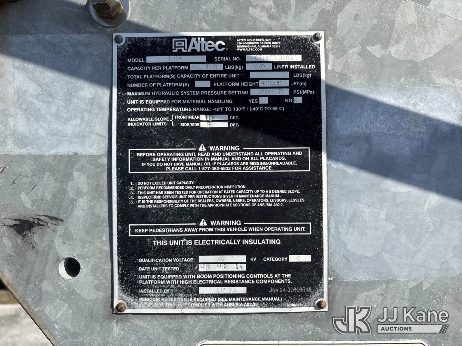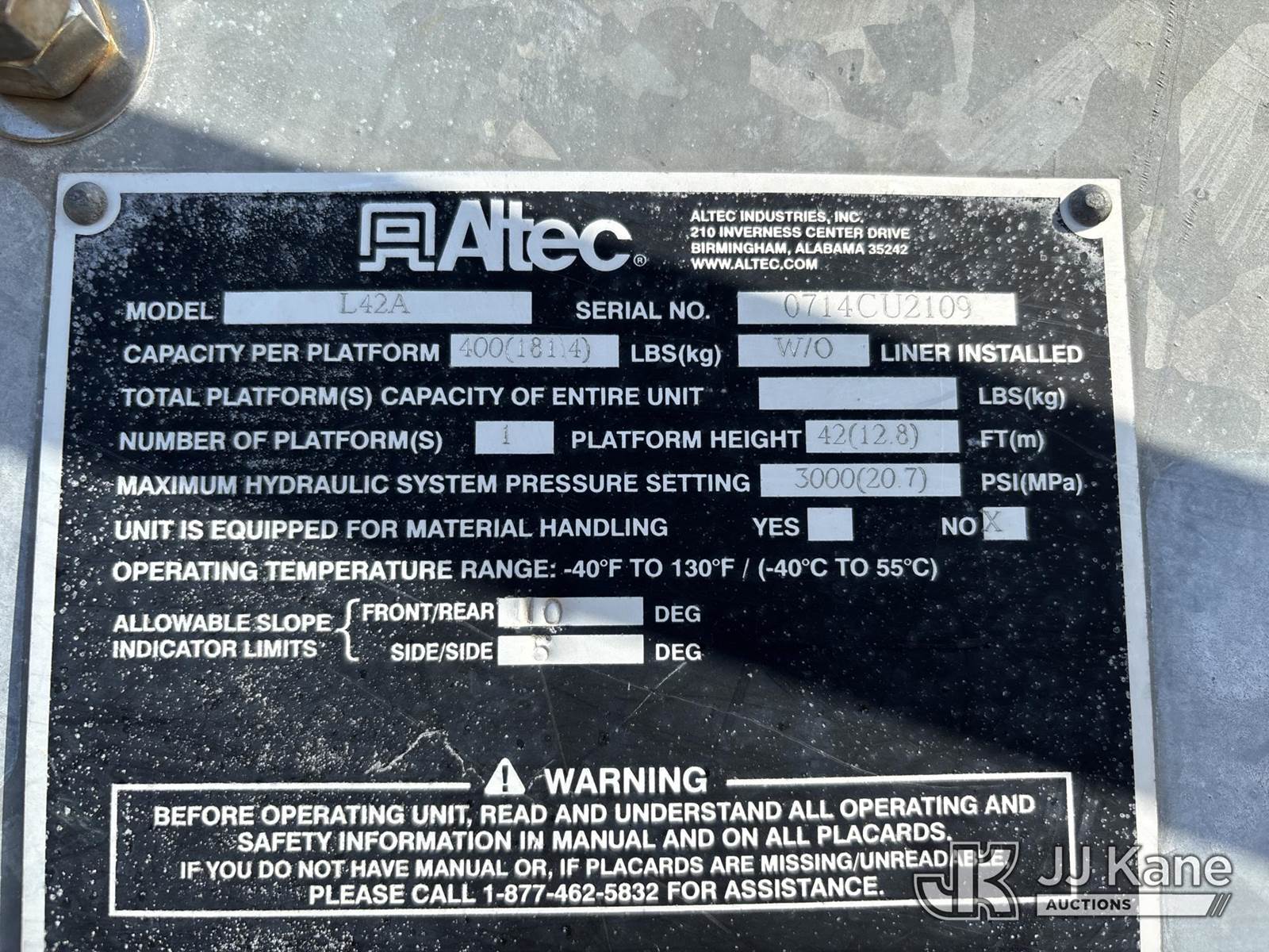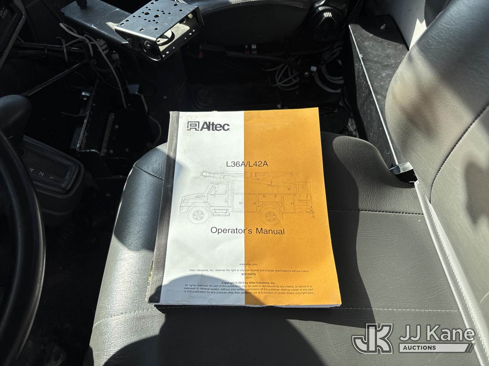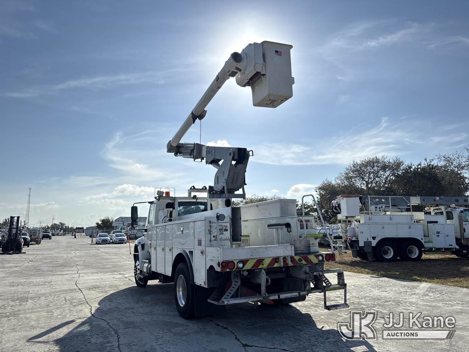 Altec L42A, 47 ft, Over-Center Bucket s/n 0714CU2109, with single-man bucket, galvanized lower boom, rear mounted on 2015 International DuraStar 4300 Utility Truck, Cummins ISB 6.7L diesel, 4X2, Auto, A/C, (138,608 miles) (Runs, Moves, & Upper Operates) (Check Engine Light On, Engine Warning Light On, Body & Paint Damage) (FL Residents Purchasing Titled Items – tax, title & registration fees will be collected at the maximum rate of $400.00 under 25,999 and $800.00 for Over 26,000 and $250.00 trailers – Proof of insurance is mandatory; Out of State Residents Purchasing Title Items – tax will be collected based upon your state rate.) This is a Titled Item NOTE: This unit is being sold AS IS/WHERE IS via Timed Auction and is located in West Palm Beach, FL. Inspection & preview days for this unit are the 2 business days prior to the first day of items closing for this auction, item is located at 2570 Old Okeechobee Rd West Palm Beach, FL 33409 and hours of operations are 8a-4p. For pre-sale questions, please contact Andy Garcia @ (561) 215-0085. (Manuals provided in cab) Sales Tax Collected Based on Residency (Buyer is responsible for removal. Assistance by consignor or JJ Kane Auctions is not assured.)