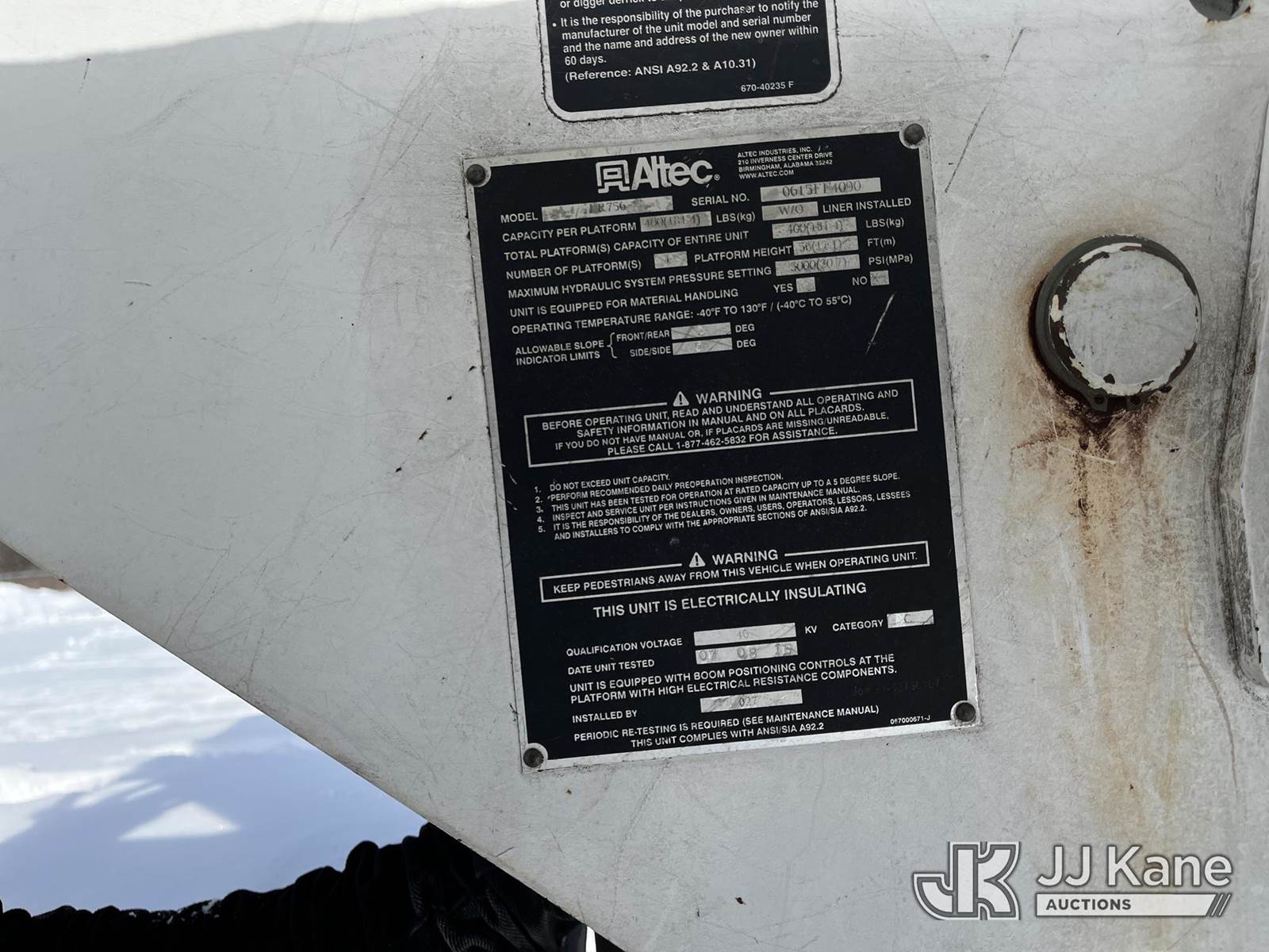 Altec LR756, 60 ft, Over-Center Bucket Truck s/n 0615FF4090, with single man bucket, mounted behind cab on 2015 Ford F-750 Chipper Dump Truck, 6.7L diesel, 4X2, 6-spd, (77,792 miles (unverified)) (Runs) (Does Not Move, PTO Issue, Upper Operation Unknown, Gear Shift Issue, Windshield Cracked, Body & Paint Damage) (Seller States: transmission, clutch, synchronizers all need replaced. stuck in second gear) This is a Titled Item NOTE: This unit is being sold AS IS/WHERE IS via Timed Auction and is located in Louisville, OH. Inspection & preview days for this unit are the 2 business days prior to the first day of items closing for this auction, item is located at 3648 Beck Ave Louisville, OH 44641 and hours of operations are 8a-4p. For pre-sale questions, please contact Aaron Coleman @ (330) 495-4041 or aaron.coleman@jjkane.com. (Manuals provided in cab) (Buyer is responsible for removal. Assistance by consignor or JJ Kane Auctions is not assured.)