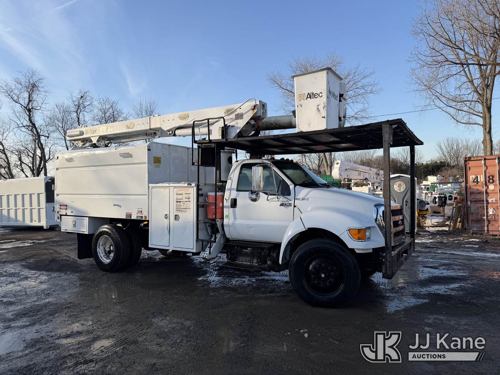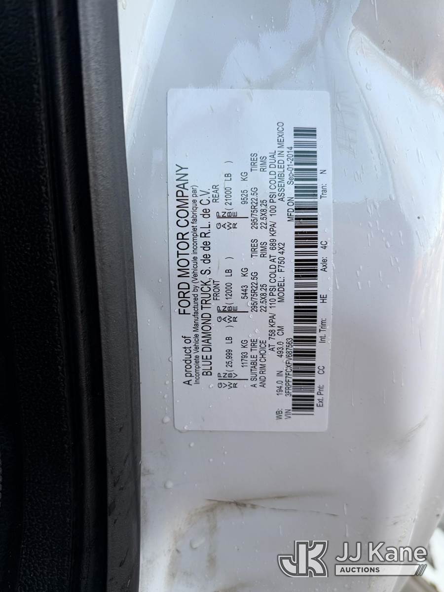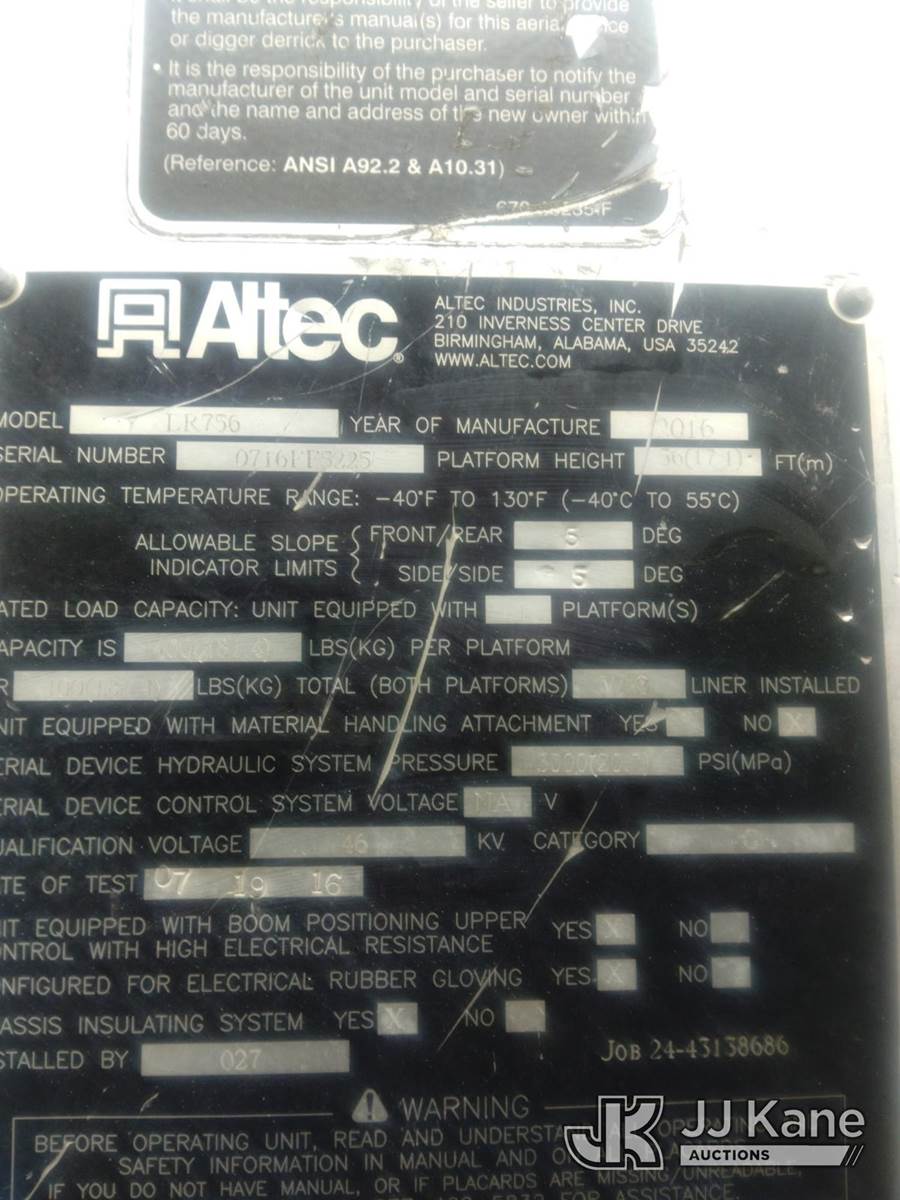 Altec LR756, 61 ft, Over-Center Bucket Truck s/n 0716FF5225, with single-man bucket & 2 hyd outriggers, mounted behind cab on 2015 Ford F-750 Chipper Dump Truck, 6.7L L6 diesel, 6-spd, 4X2, A/C, (78,482 miles) (Runs, Moves, Upper Operates) This is a Titled Item NOTE: This unit is being sold AS IS/WHERE IS via Timed Auction and is located in Alpha, NJ. For pre-sale questions and pickups, please contact Pete Rhodes at peter.rhodes@jjkane.com. Pickups can be conducted Monday through Friday 9:30am to 3:00pm. (Missing manuals, See Auction Company for Manufacturers Information to obtain manuals) (Buyer is responsible for removal. Assistance by consignor or JJ Kane Auctions is not assured.)